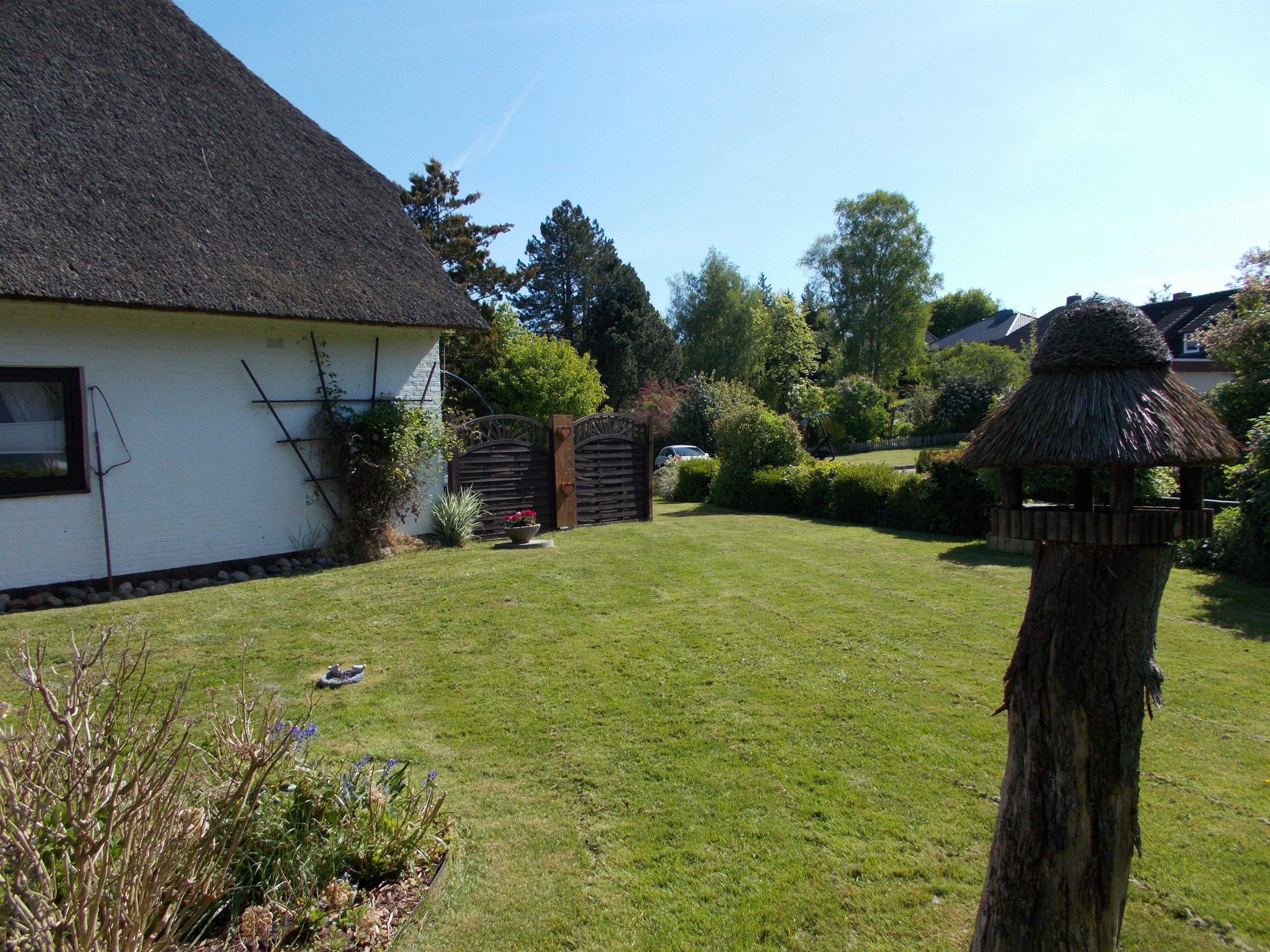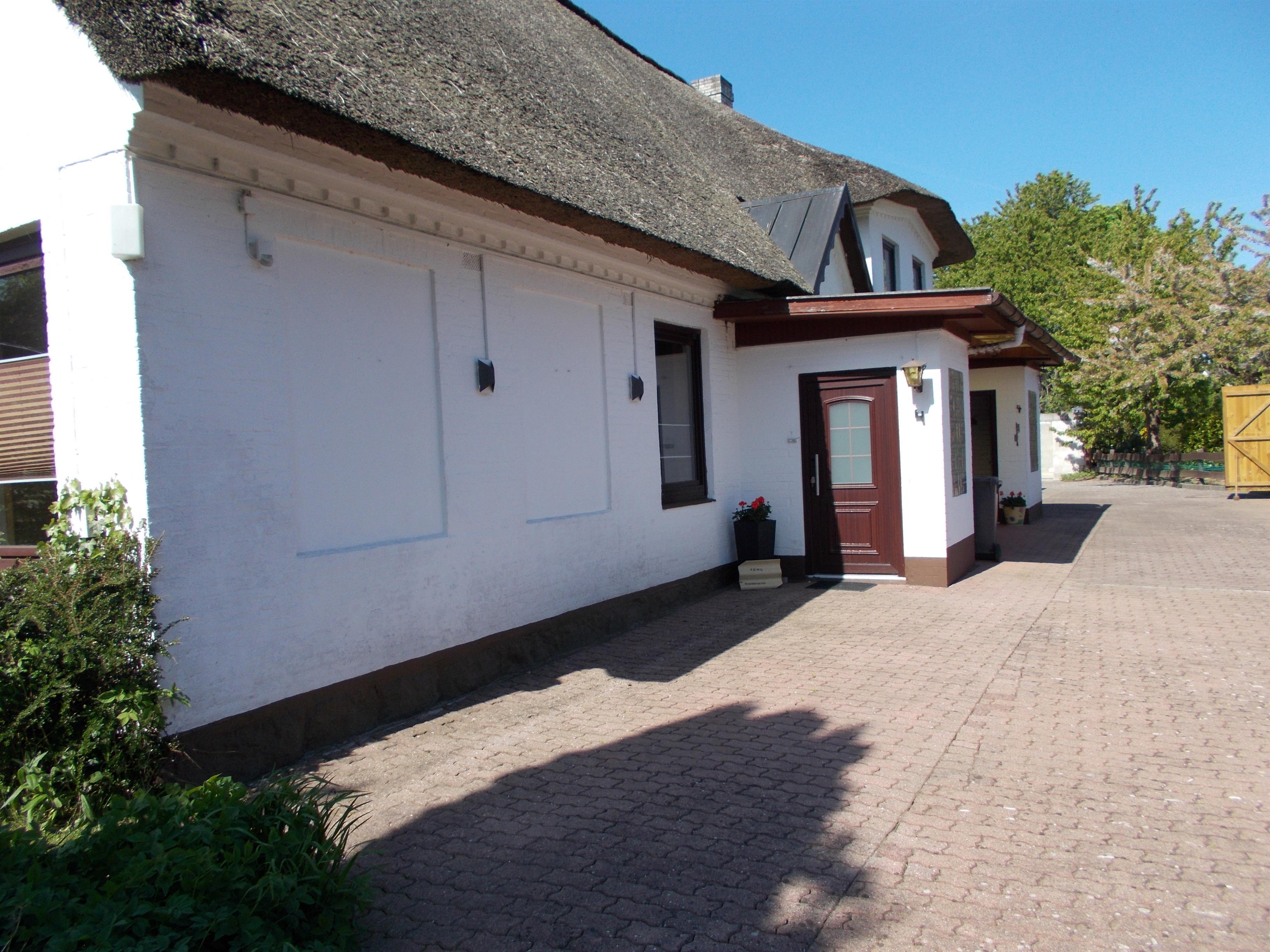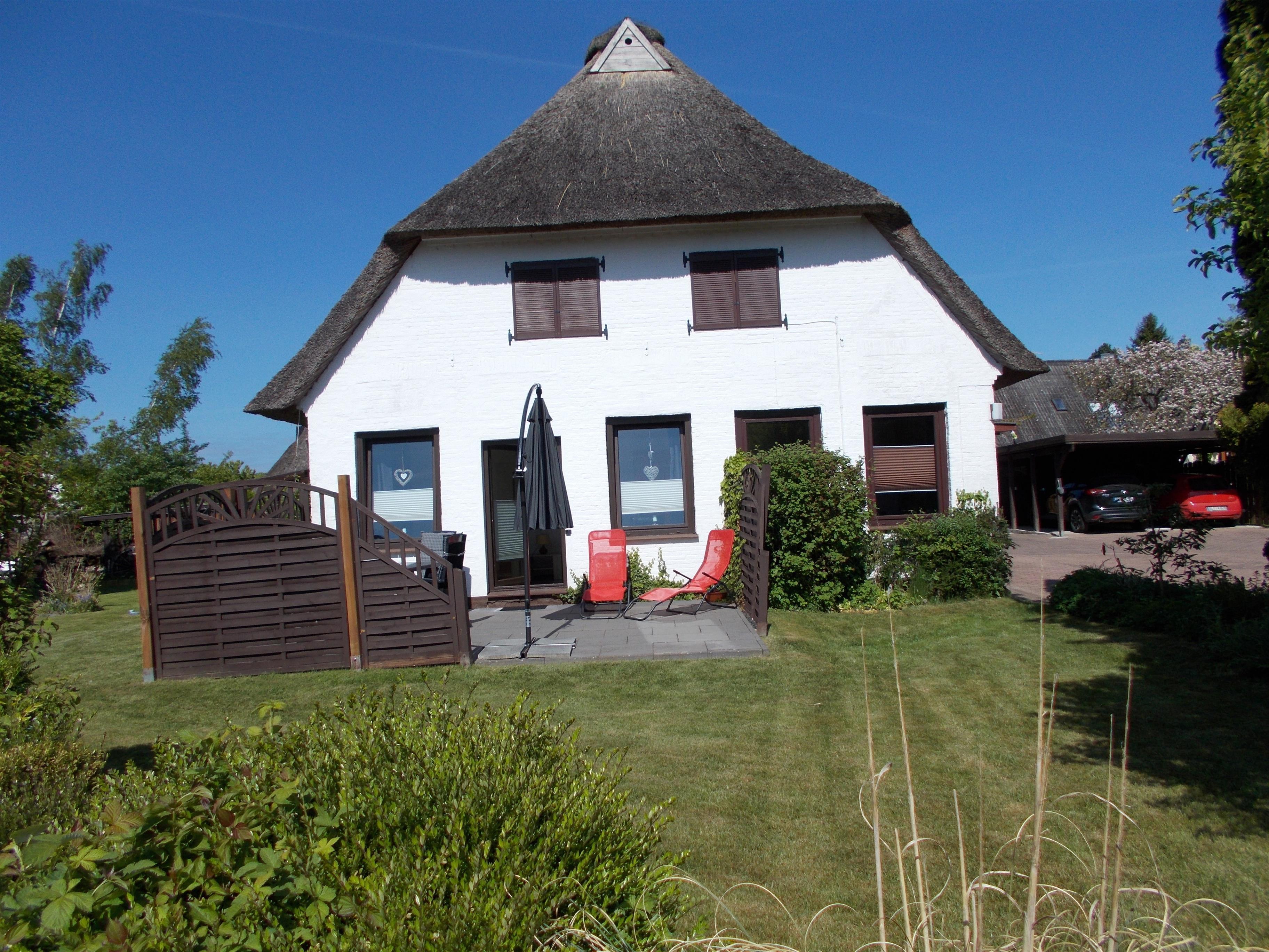 Reetgedecktes Mehrfamilienhaus mit schönem großen Garten, nicht eingezäunt, in ruhiger Umgebung. Eine Terrasse mit Sitzmöglichkeiten, Liegen, Tisch und Grill steht zur Verfügung.