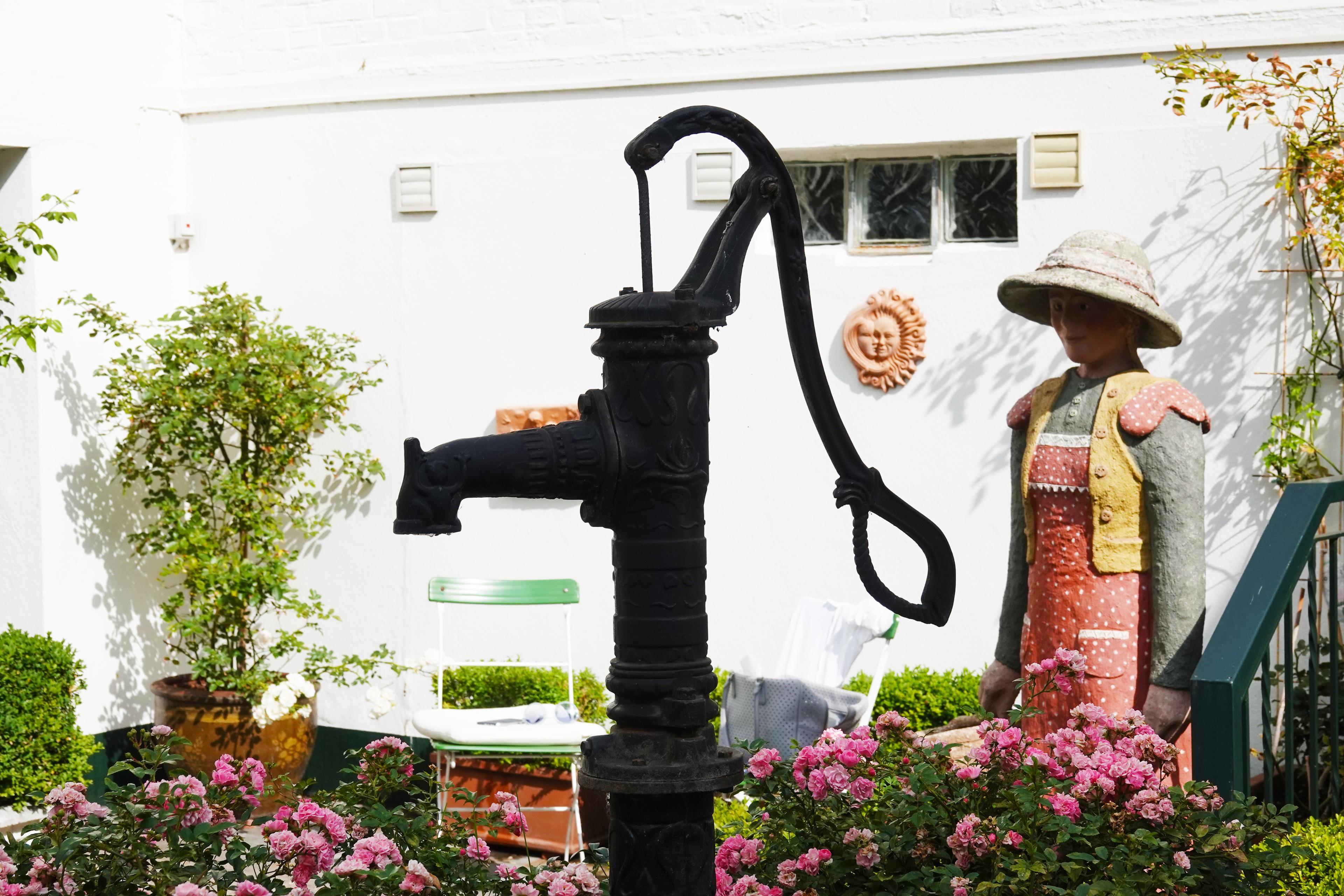Die Südseite des Gebäudekomplexes reiht sich als Stadthaus in die Häuserfronten der Mühlenstrasse ein, die Nordseite grenzt an die Straße Schanze. Hier befindet sich der Zugang zur Ferienwohnung Kappeln 334 sowie zum sehr schön gestalteten Innenhof, Rosen umrankt und mit Brunnen, Strandkorb sowie Sitzecken- eine Oase mitten in Kappeln.