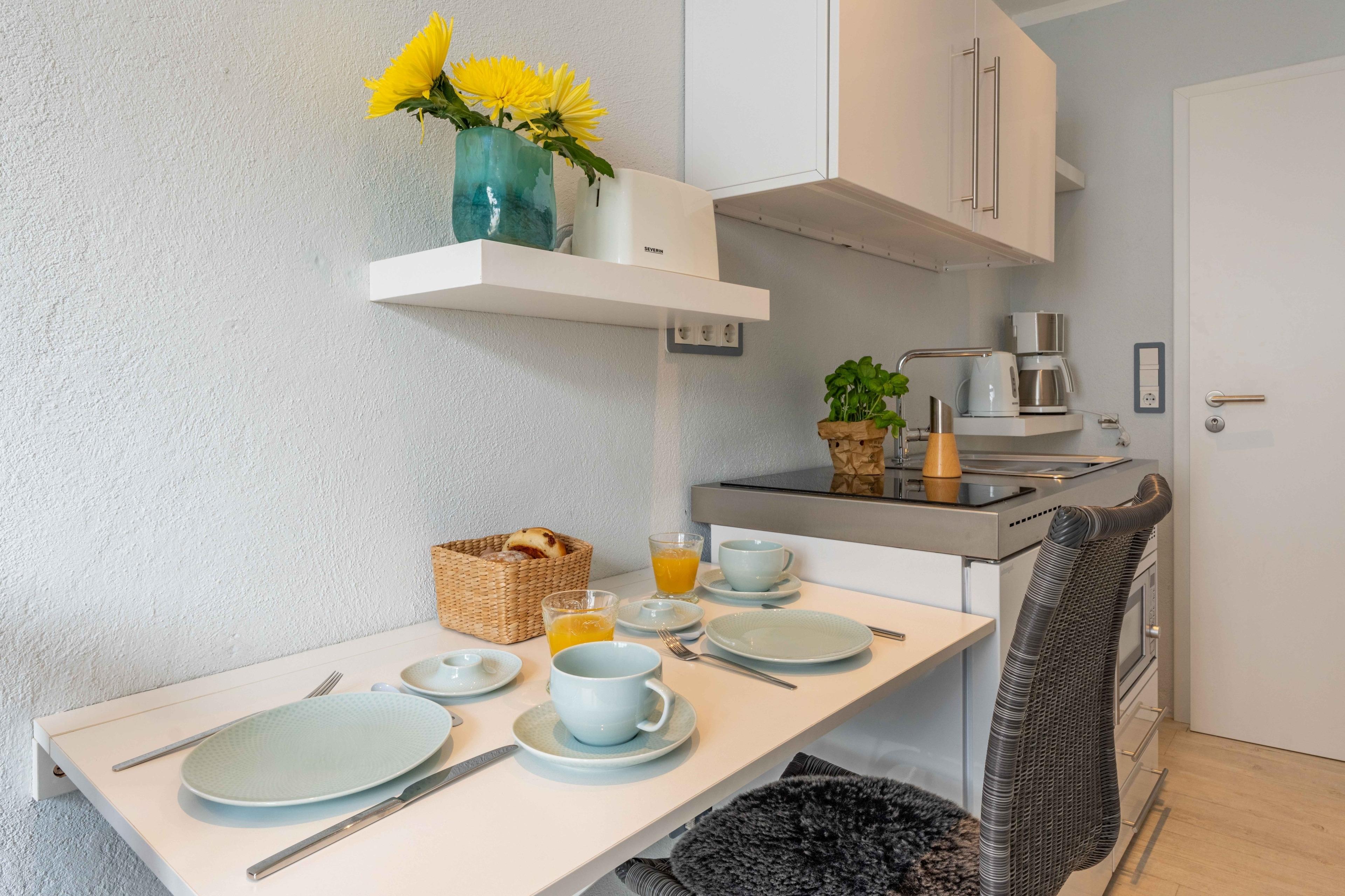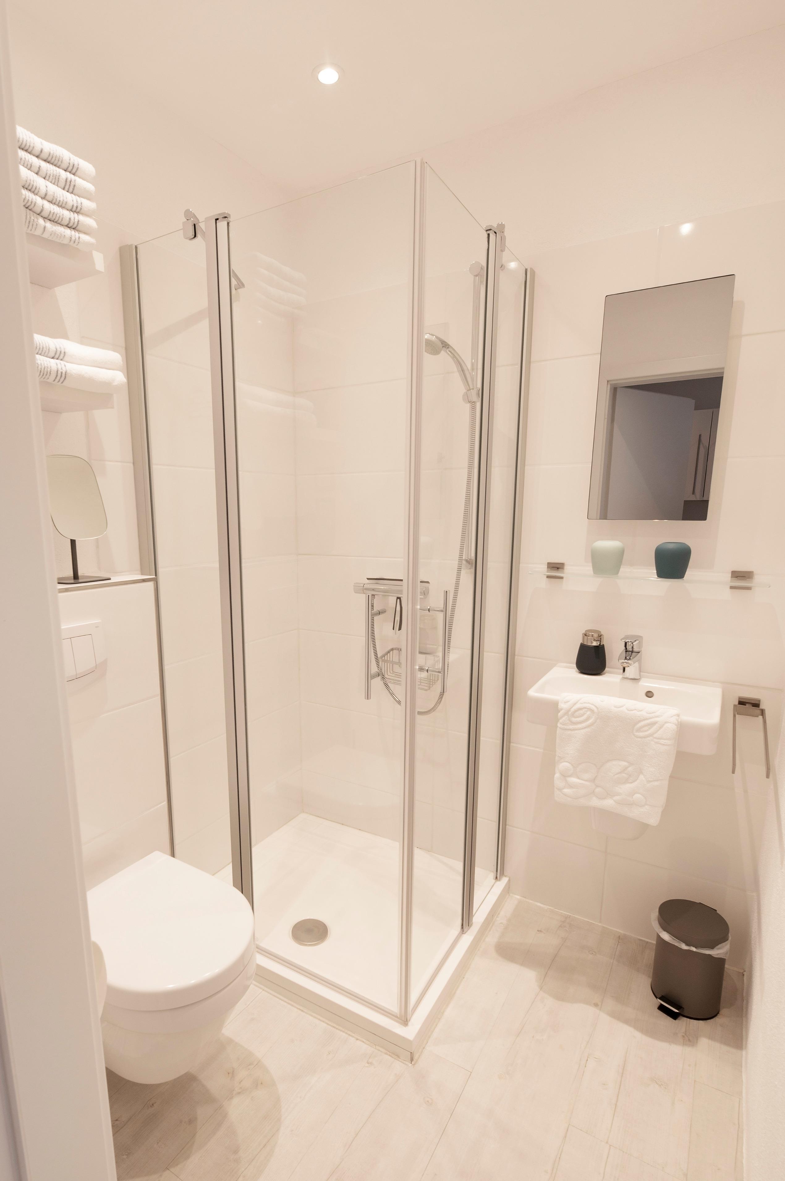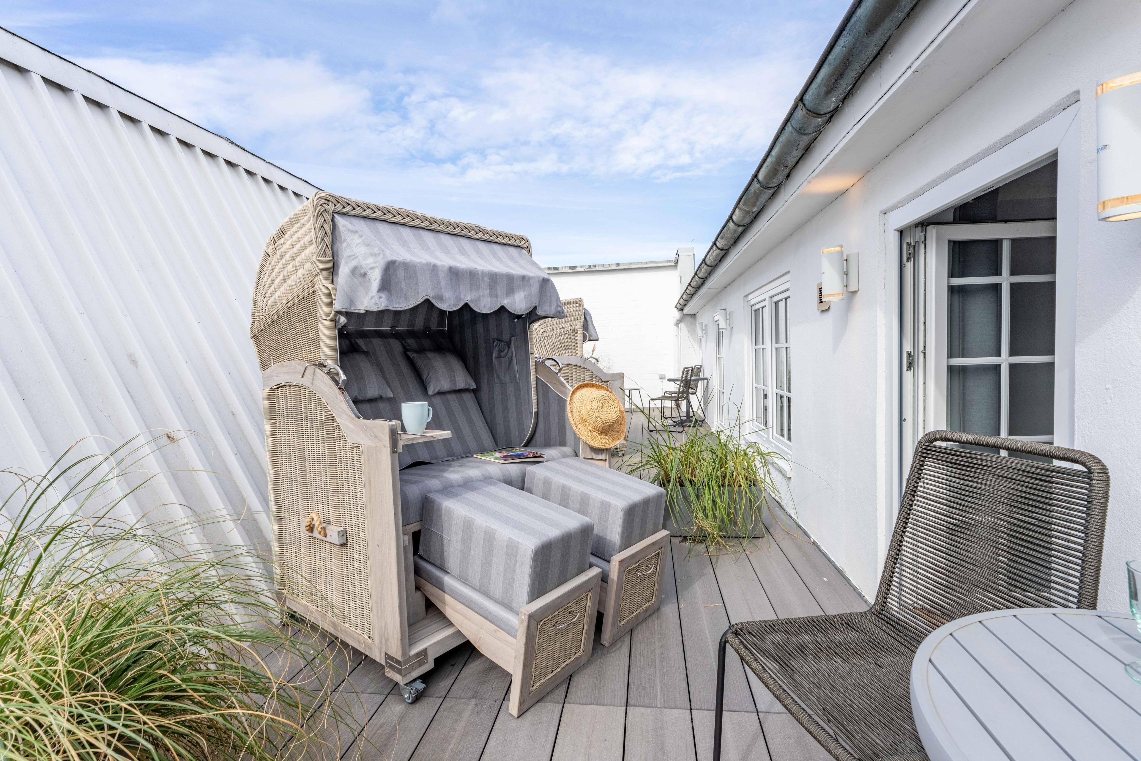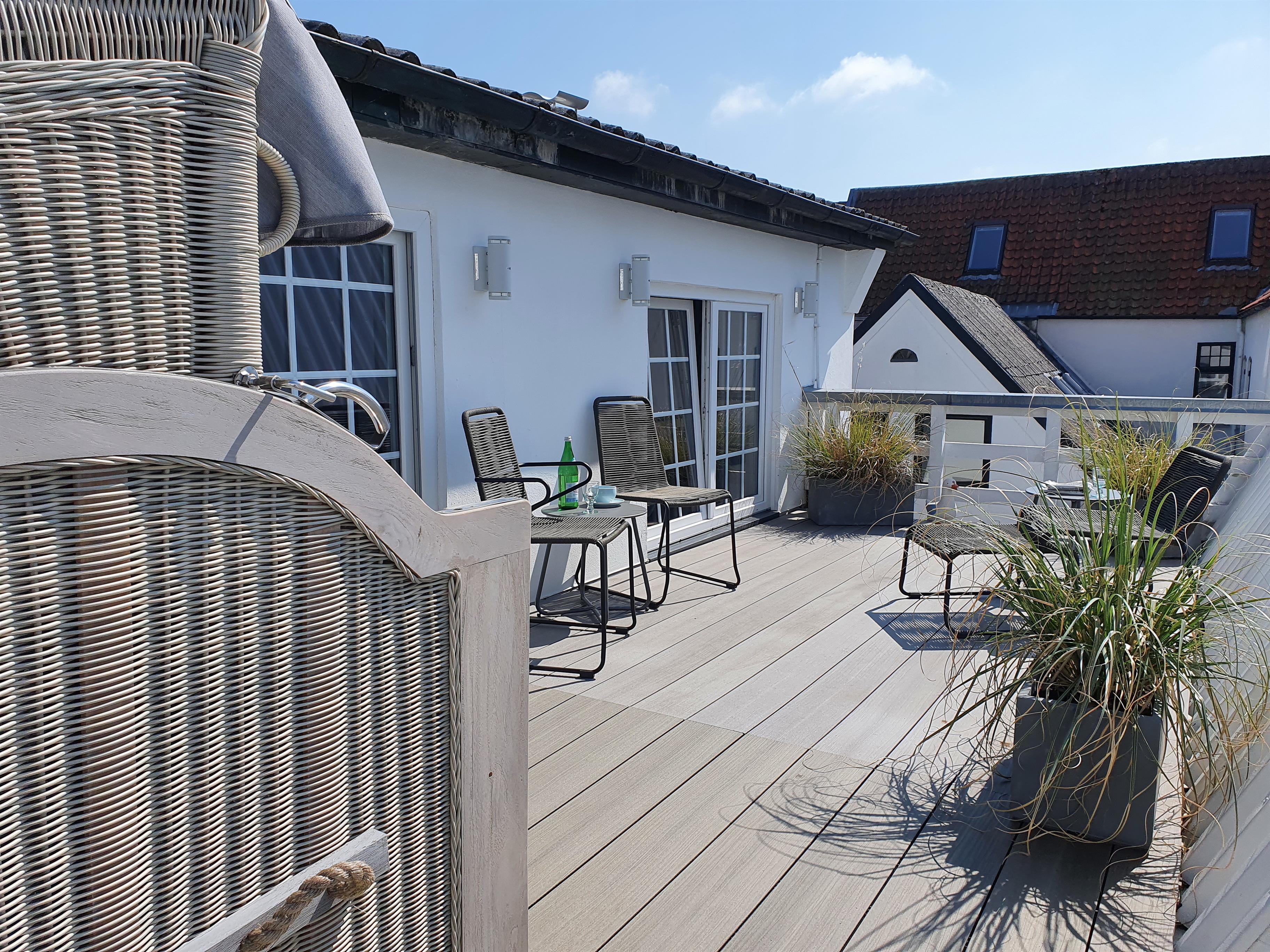 Auf 4 Sterne-Niveau und im norddeutschen Design wurde ein schönes und neues Apartment auf 47 m2 eingerichtet. 18 m2 davon gehören zu einer eigenen Dachterrasse. Das Apartment besitzt ein neues Bad mit WC, Dusche mit bodennahem Eintritt, einem Waschbecken mit Ablage, Wandhaken und Ablagefläche für Kosmetikutensilien. Außerdem stehen je 2 Handtücher, 2 Duschtücher sowie 2 Bademäntel, eine Badematte sowie ein Föhn zur Verfügung. Im Wohnbereich befinden sich am Eingang eine Garderobe und ein Ganzkörperspiegel. Die Pantryküche besteht aus Kühlschrank, Kochceranfeld, Mikrowelle und Kaffeemaschine, Toaster und Wasserkocher. Zur weiteren Ausstattung gehören Esstisch, Wandklapptisch, 2 komfortable Sesselstühle, ein HD TV und WLAN, ein Boxspringbett (1,60x2,00m) mit Superiortopper und zwei Leselampen + Ablage im Schlafbereich. Das Highlight ist eine eigene Dachterrasse, auf der man sich "weit weg vom Alltag - nur den Wolken und Möwen ganz nah" fühlt. Hier stehen Strandkorb, Lounge Chair und eine Essecke bereit. Im Innenhof mit mehreren Sitzecken warten zudem Strandkorb und Grill. Eine sichere abschließbare Fahrradunterstellmöglichkeit ist vorhanden. Parkgarage nach Verfügbarkeit.
