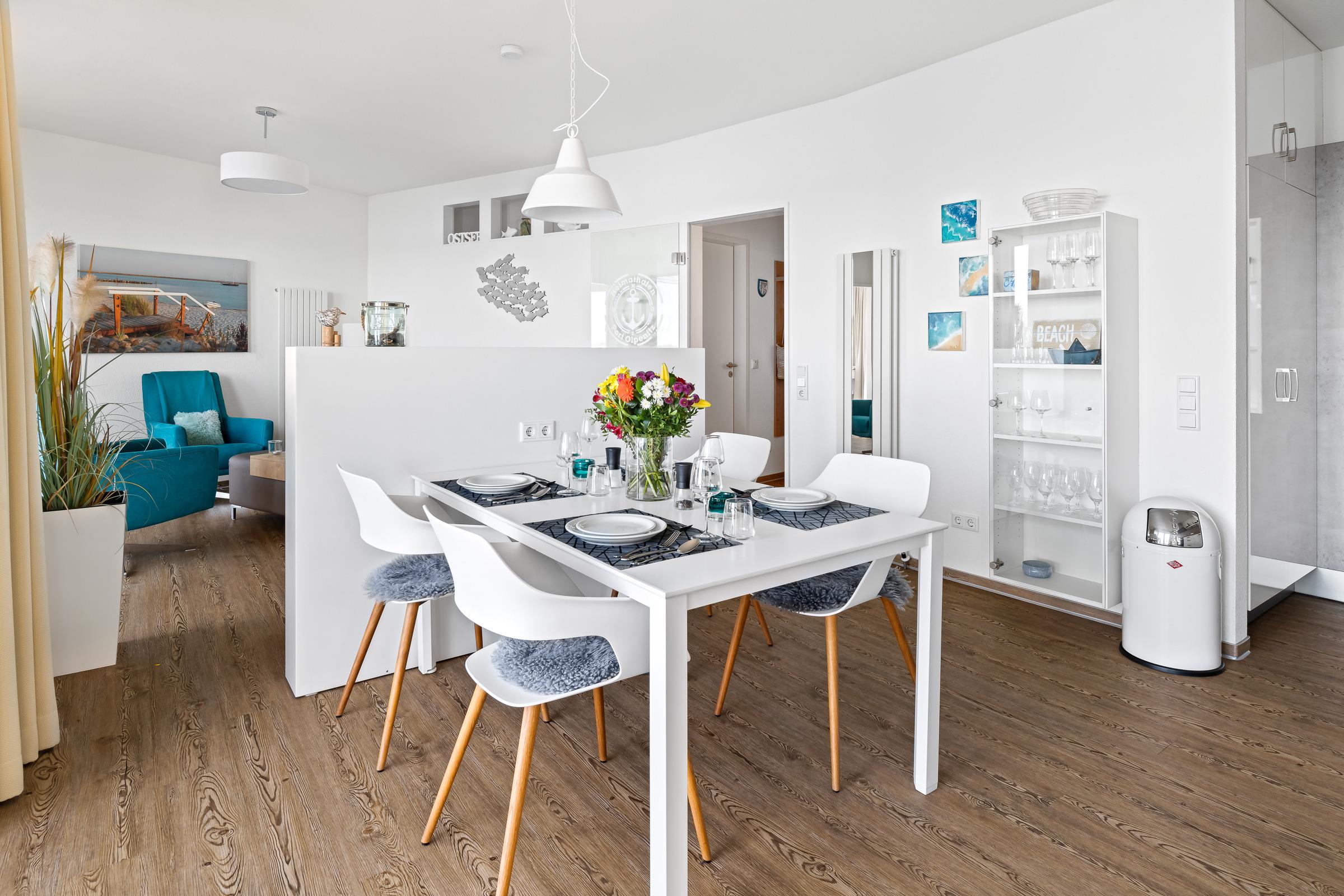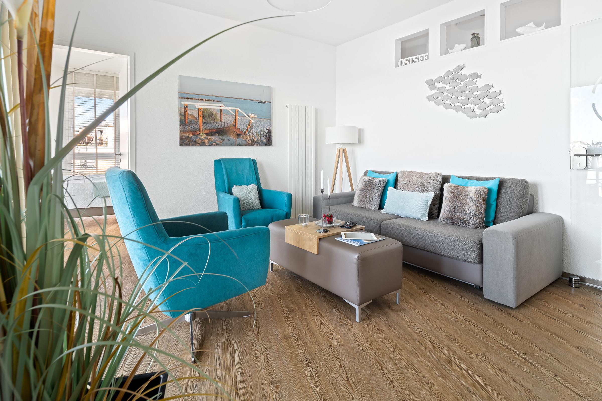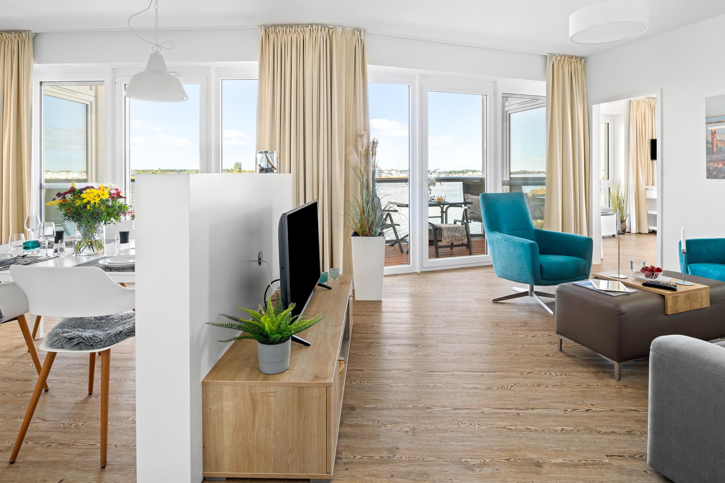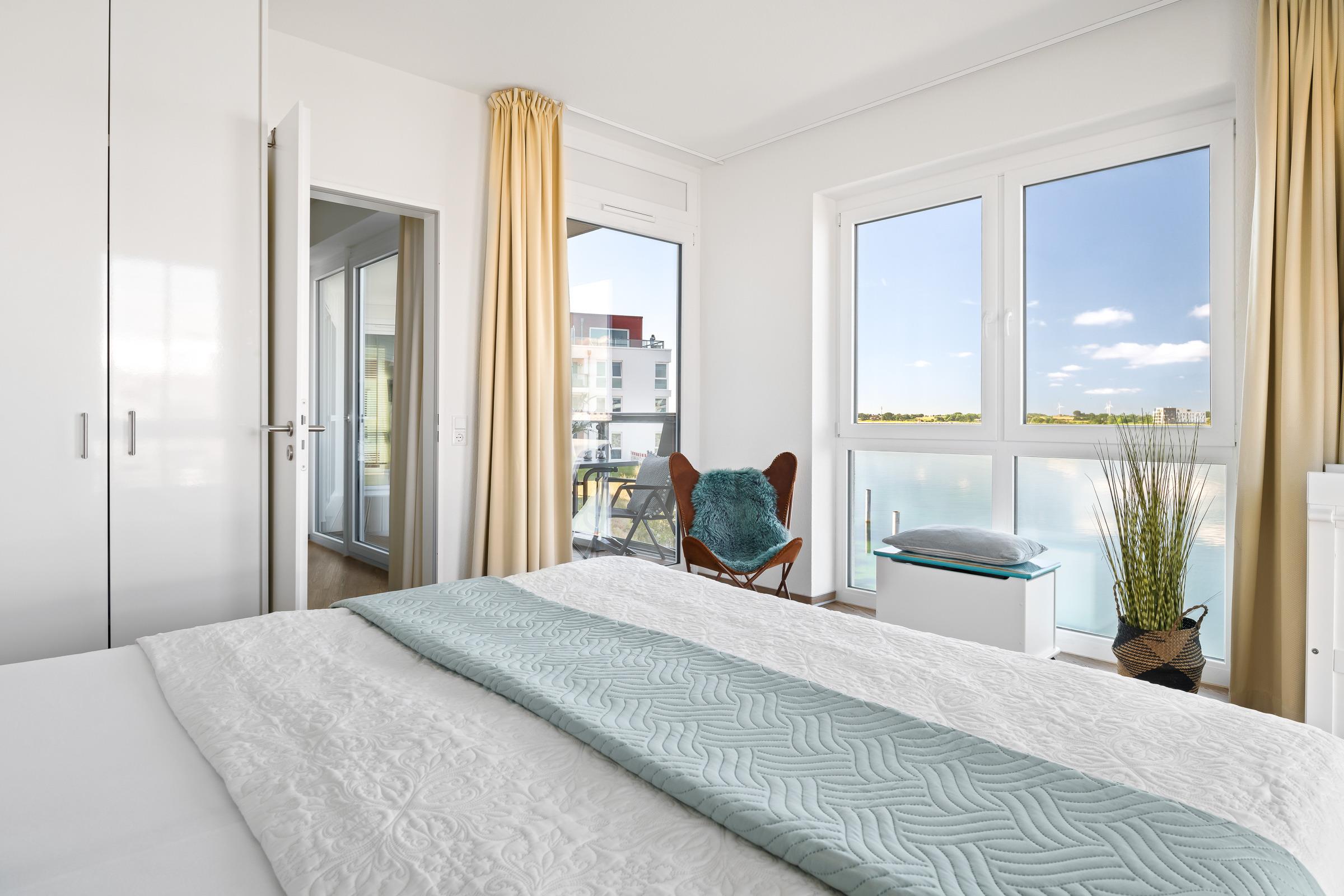 Sie werden eine umfangreiche Ausstattung mit vielen Extras vorfinden: eine Kaffeepadmaschine, eine Wickelkommode, eine Kinderspieletruhe, einen Hotelsafe und viele weitere Details. Durch die Süd-West-Ausrichtung des großen windgeschützten Balkons können Sie den Blick auf die Marina genießen. Die bodentiefen Fenster bieten auch an stürmischen Tagen eine Traumkulisse.