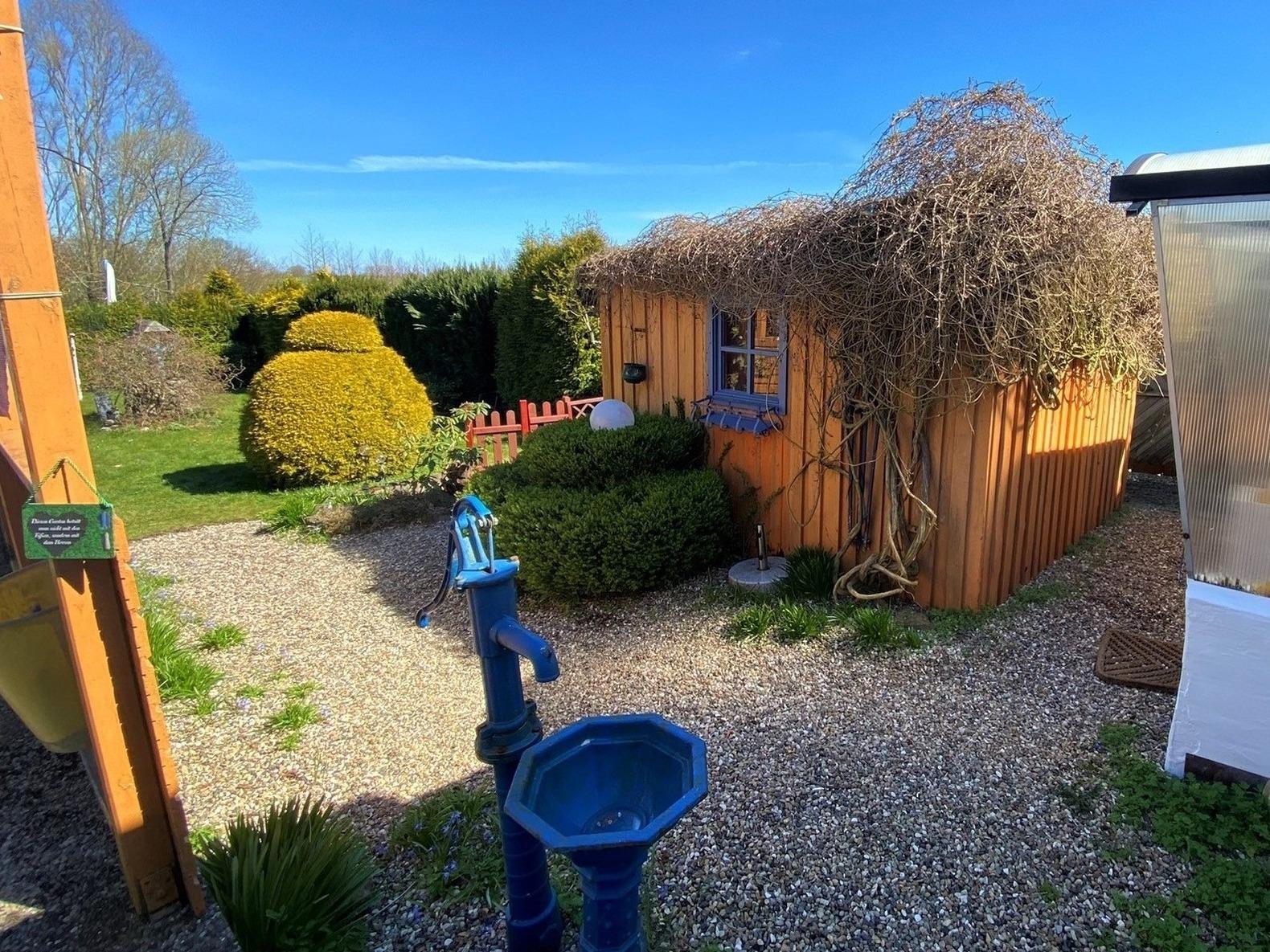 Auf Anfrage kann das Gartenhaus mitbenutzt werden. Hier befindet sich ein weiteres Badezimmer mit Dusche und WC sowie eine kleine Teeküche mit Herd, Kühlschrank, Spüle.