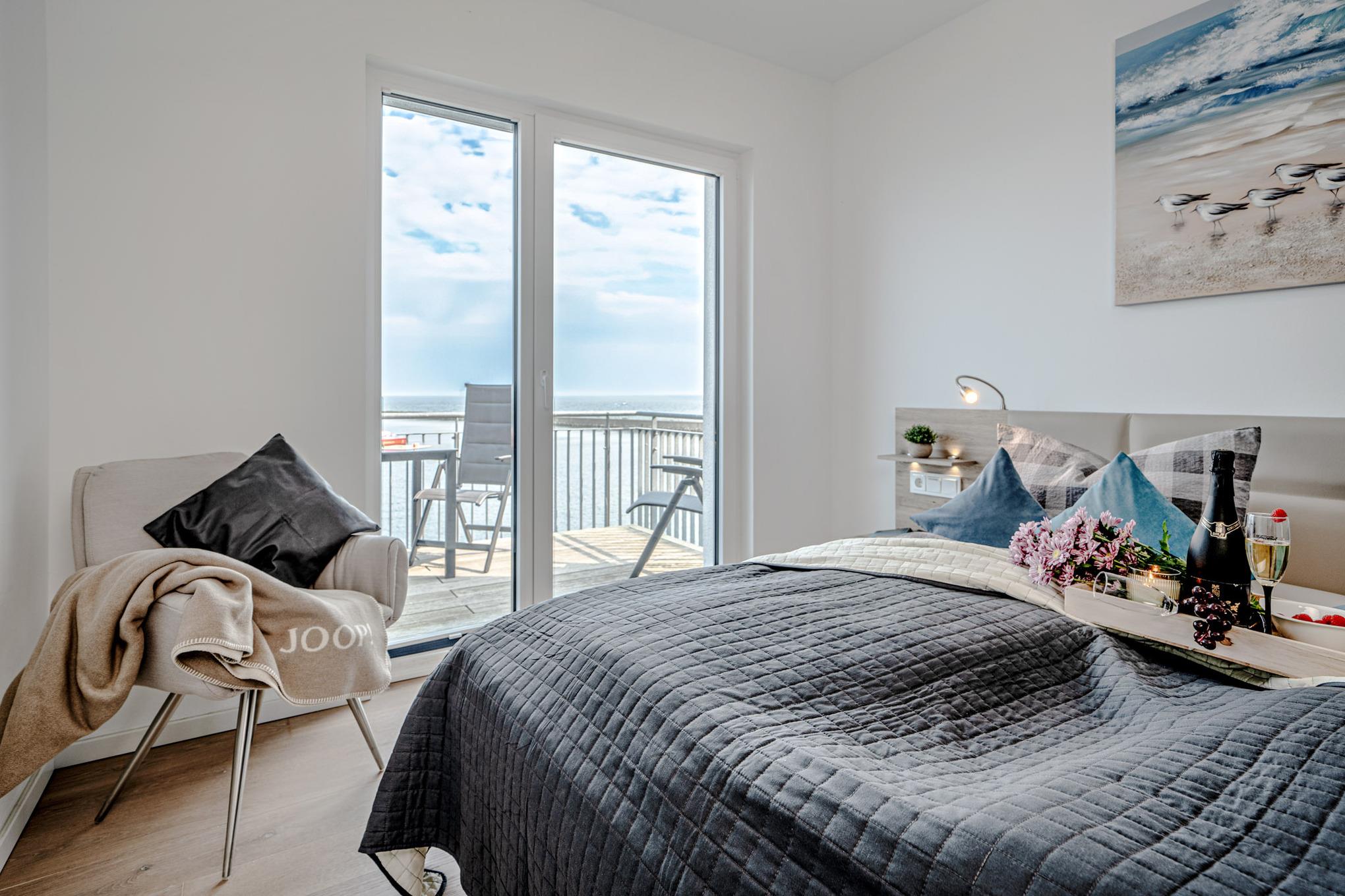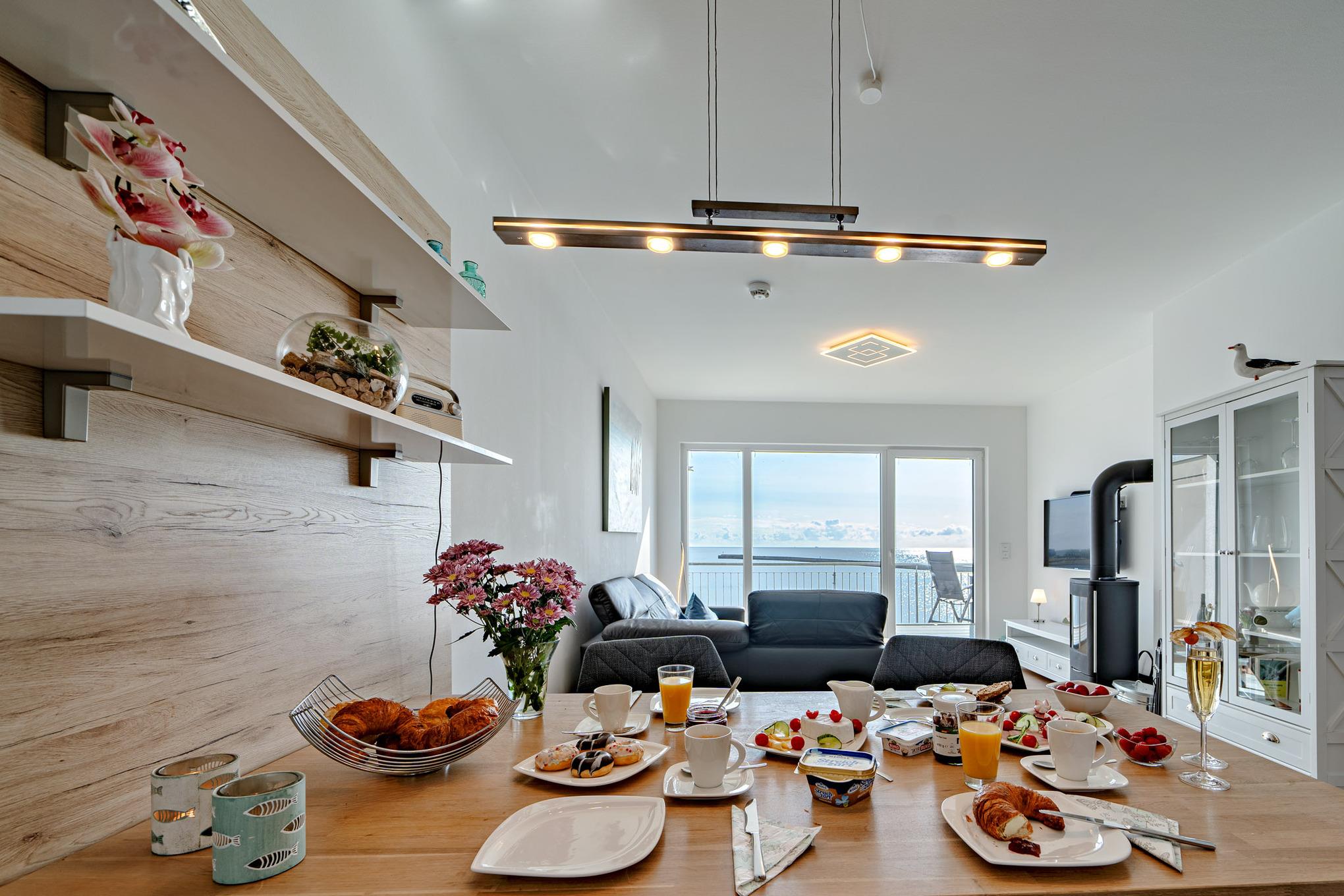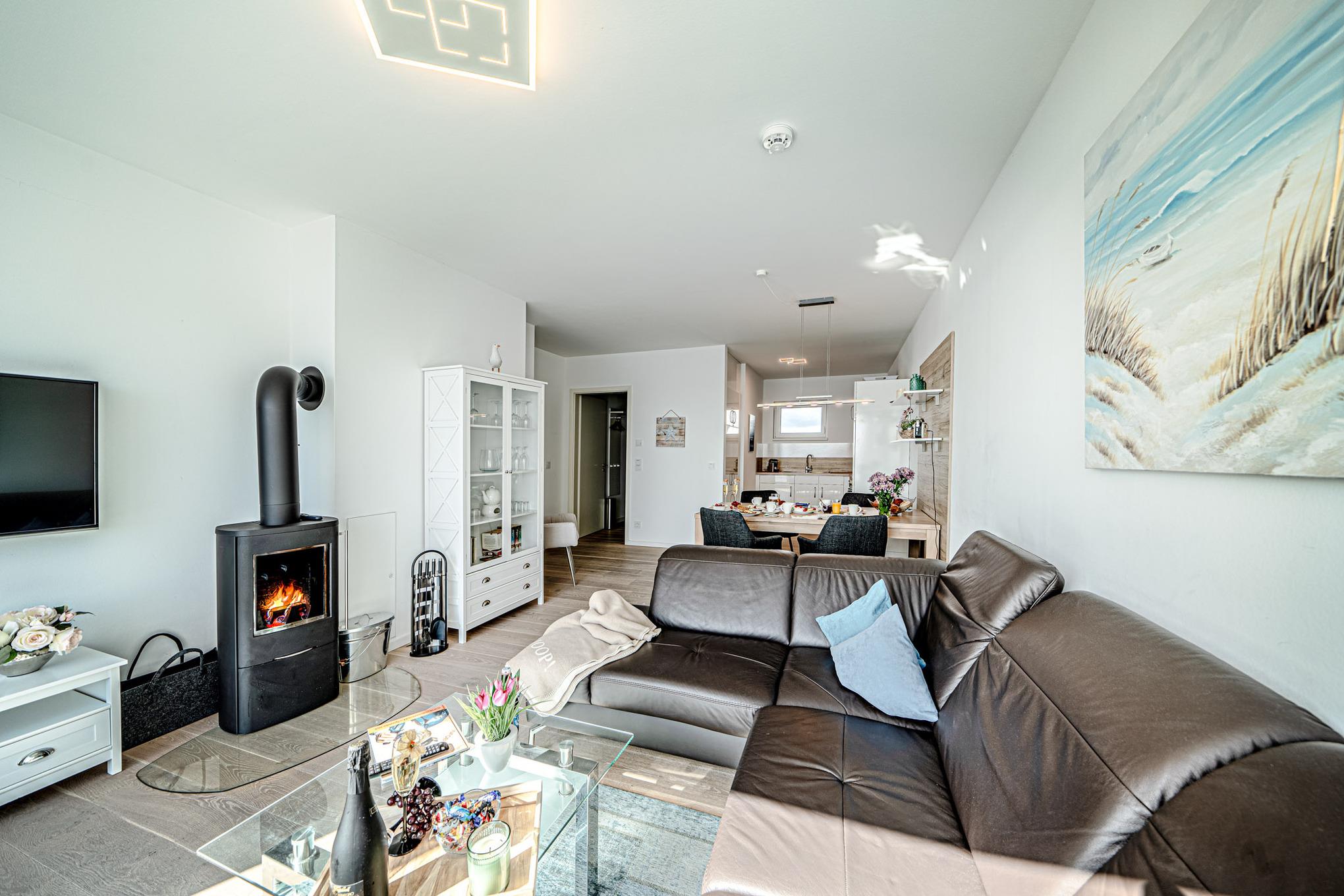 Im Fokus steht aber der perfekt umgesetzte lichtdurchflutete Wohn- und Essbereich mit Holz befeuertem Kaminofen, bodentiefen Panoramafenstern, welcher loftartig gestaltet ist, sodass alle Räume fließend ineinander übergehen und sich der Wohnbereich mit der Natur verbindet. Die Integration der offenen Küche mit hervorragender Ausstattung und funktionalem Design, steht dem gemütlichen Beisammensein auch beim Zubereiten von allerlei Köstlichkeiten nichts im Wege. Die Wasserkulisse vor dem Essbereich mit 180 Grad Panoramablick auf den gesamten Hafen und die Ostsee ist hierbei zum Greifen nah – das ist Ostseeflair. Den zweiten Nordbalkon (ca. 8m²) betritt man über den Wohnbereich, hier können es sich unsere Gäste auf einer zusätzlichen Bestuhlung gemütlich machen und bei einem Sundowner mit Abendsonne den Tag ausklingen lassen.