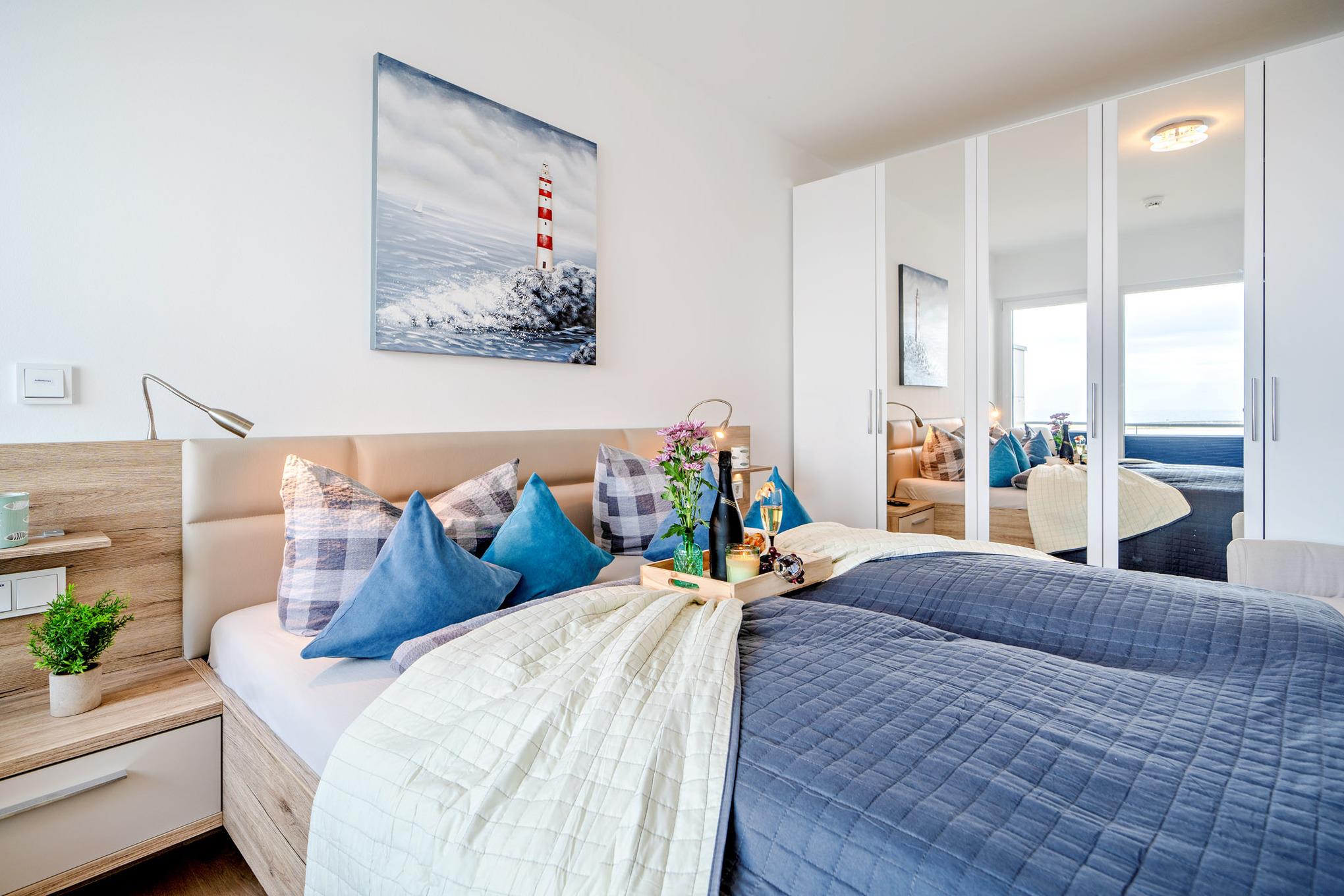 Bei dieser Wohnung sind spektakuläre Sonnenlichtspiele durch die zwei Balkone in Süd- und Nordausrichtung zu erwarten. Der Einrichtungsstil entspricht der exklusiven Lage der Ferienwohnung: Landhausstil gepaart mit klaren Farben und Formen versprechen Ruhe und Rückzug, während einzelne Farbakzente für erfrischende Leichtigkeit sorgen.