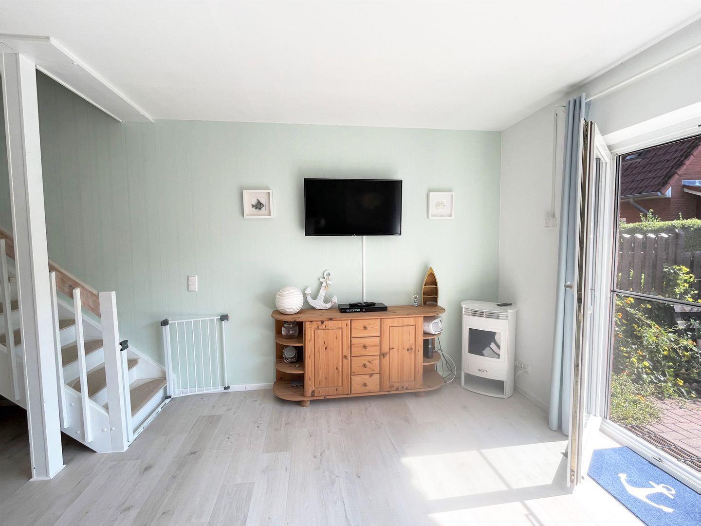 Der große Wohn- und Essbereich verfügt über eine gemütliche Sofaecke mit TV und einen Esstisch.