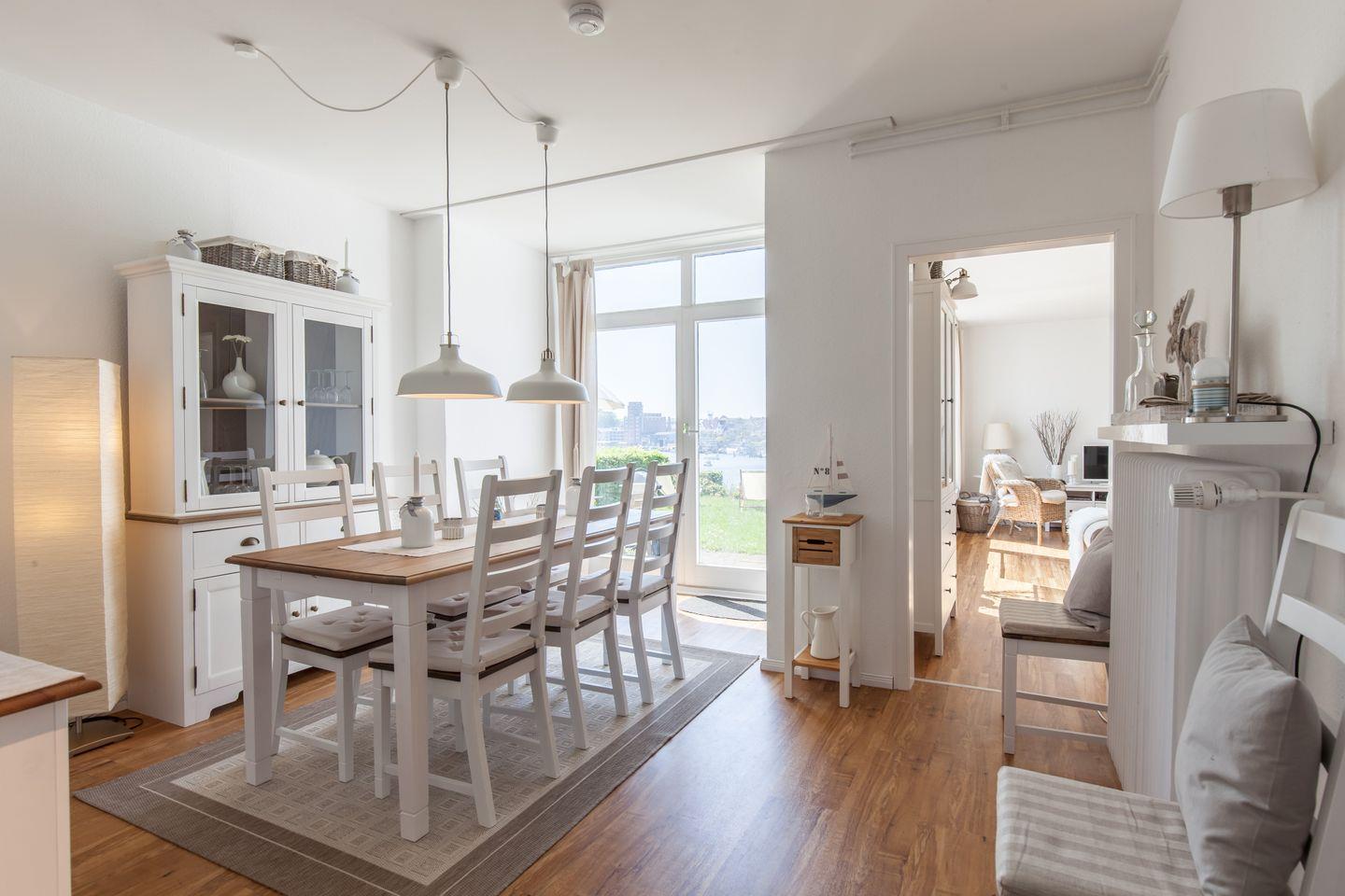 Das Esszimmer mit Terrassenzugang bildet mit einem traumhaften Schleiblick den Mittelpunkt der Wohnung und hat genug Platz für die ganze Familie.