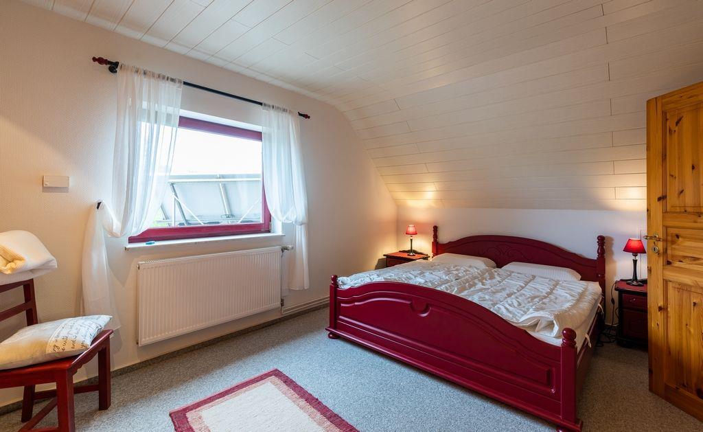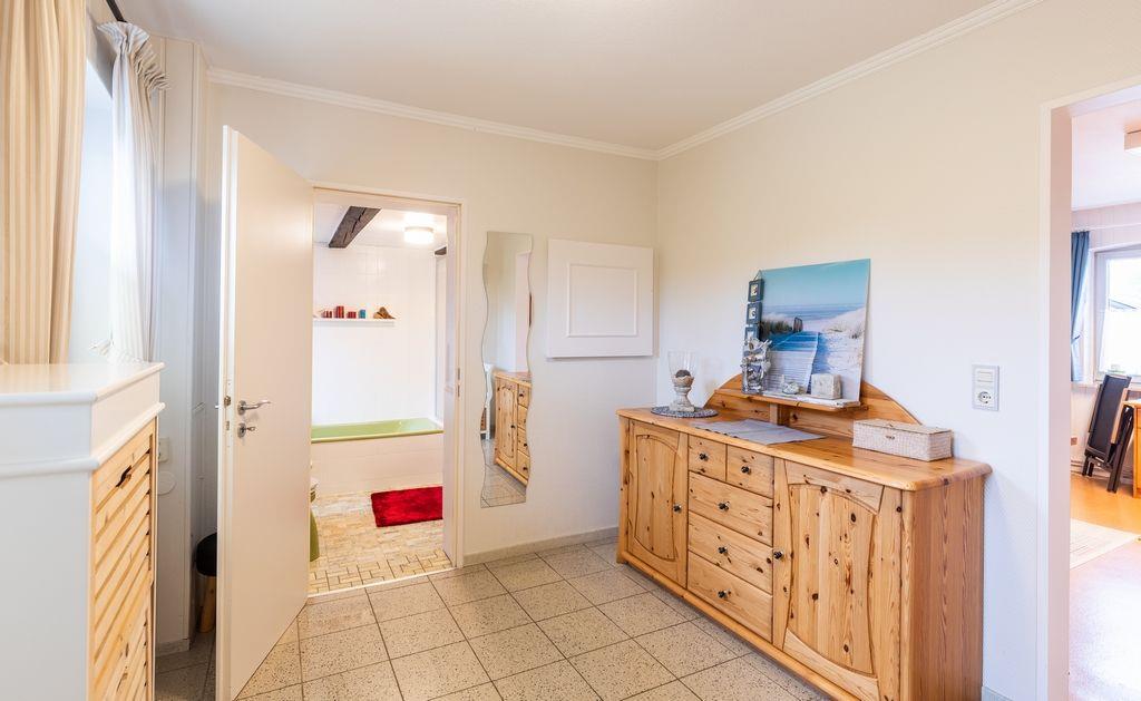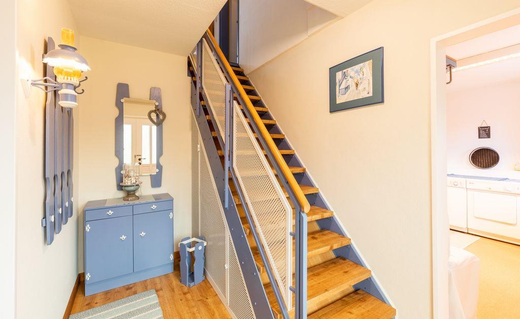 Im Obergeschoss des Hauses gelangen Sie durch einen offen gestalteten Raum, in welchem das Schlafsofa für eine mögliche 5te Person steht, u.a. in die eigentlichen Schlafräume: