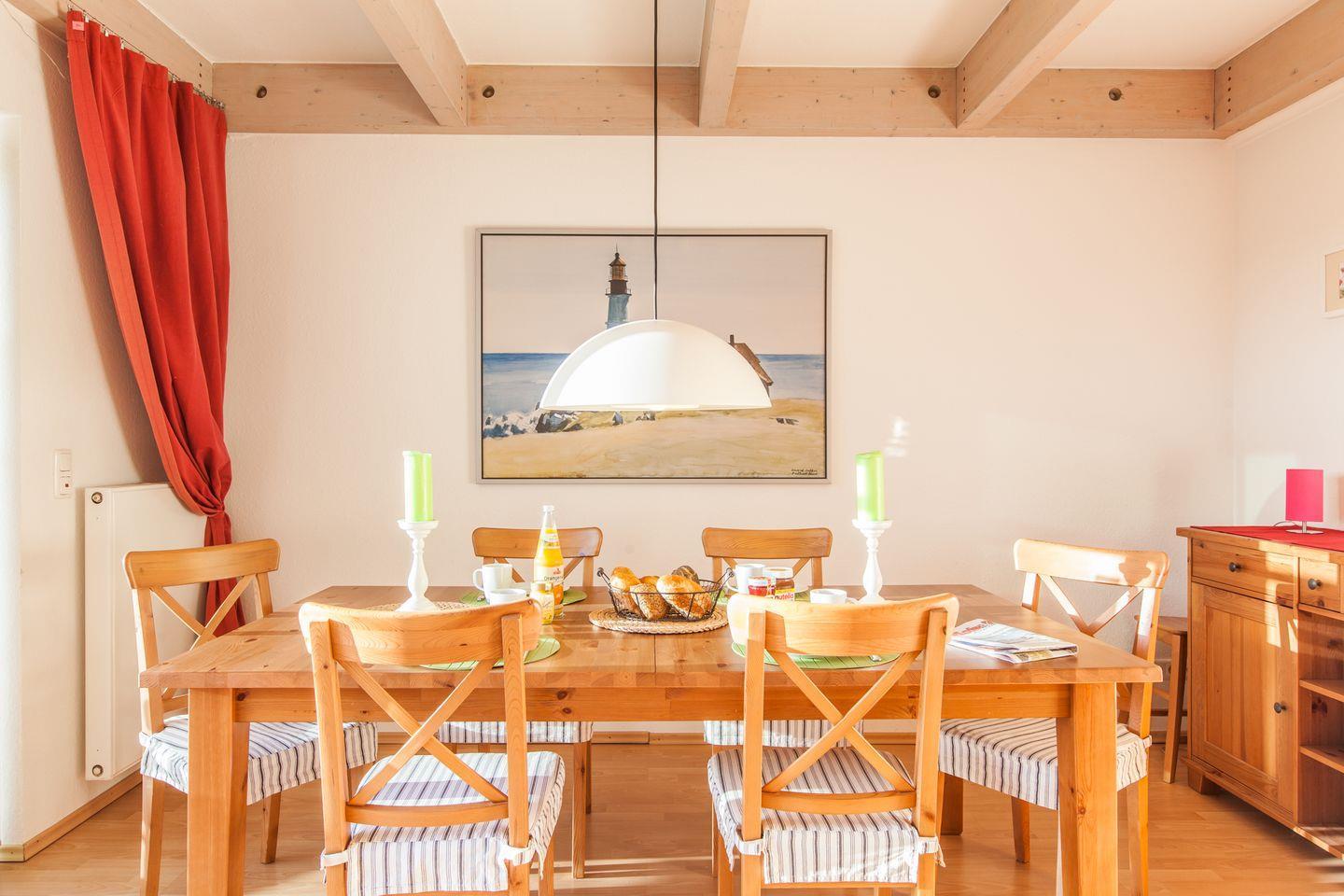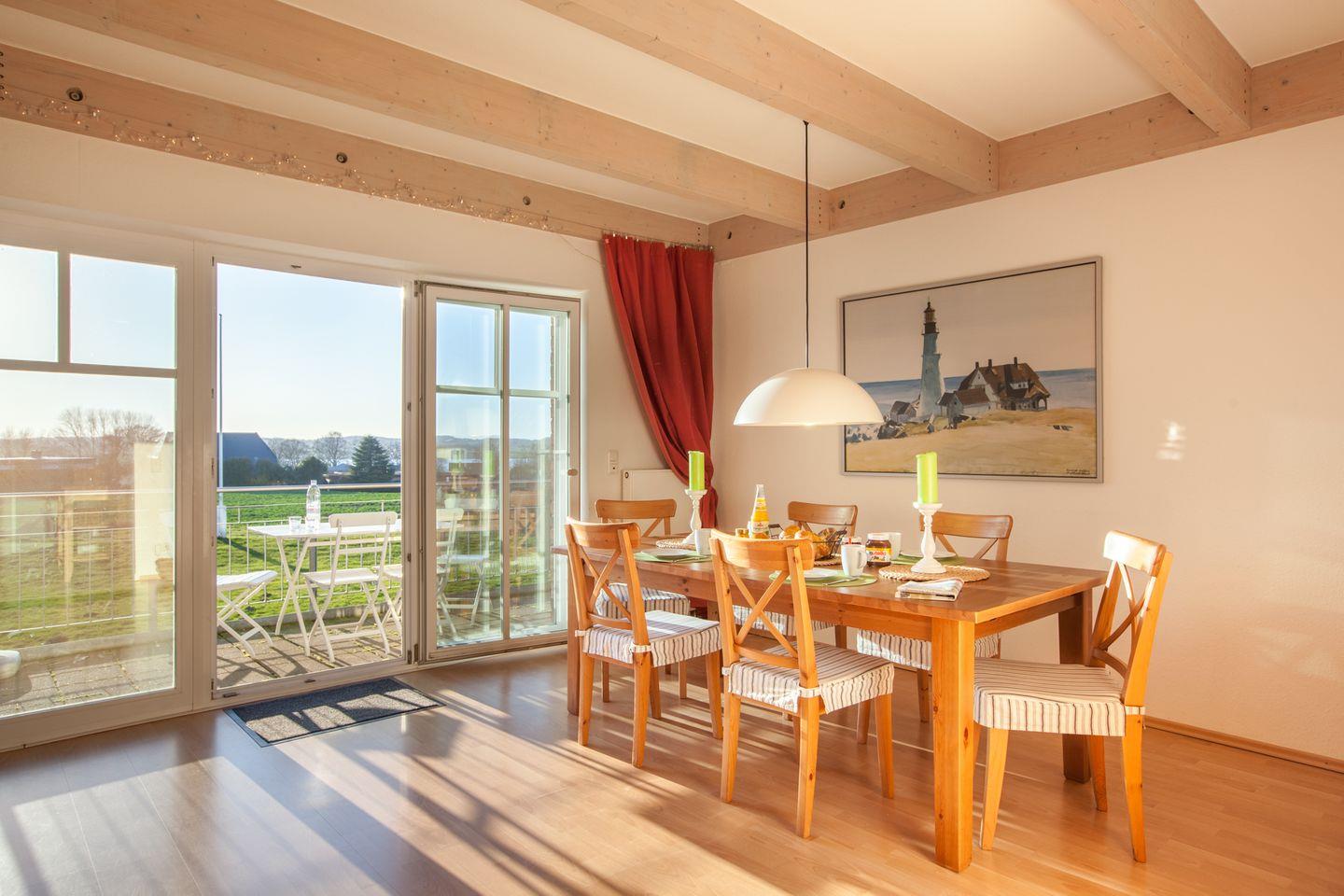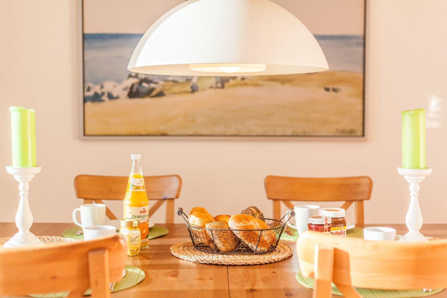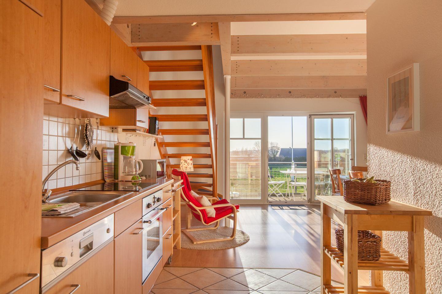 Der Innenbereich der Ferienwohnung ist sehr schön eingerichtet und heißt Sie mit bodentiefen Fenstern, einer Sofalandschaft mit Fernseher und viel Gemütlichkeit willkommen. Die komplett ausgestattete Küche mit Essbereich lässt ebenfalls keine Wünsche offen.
