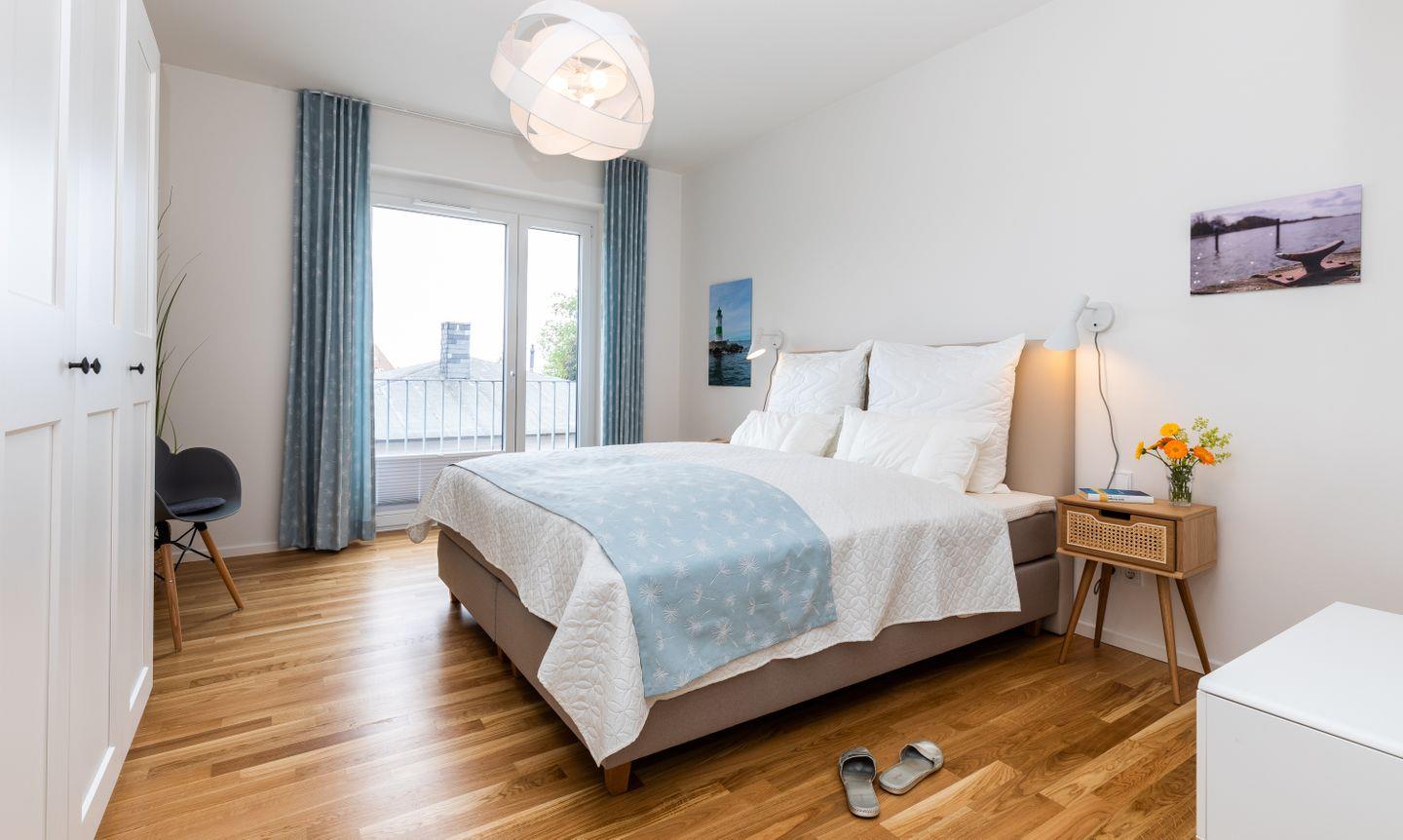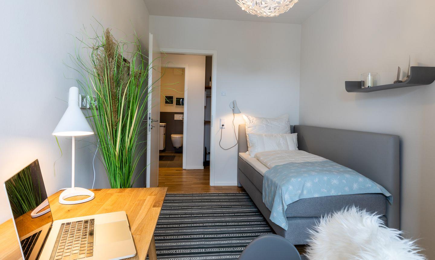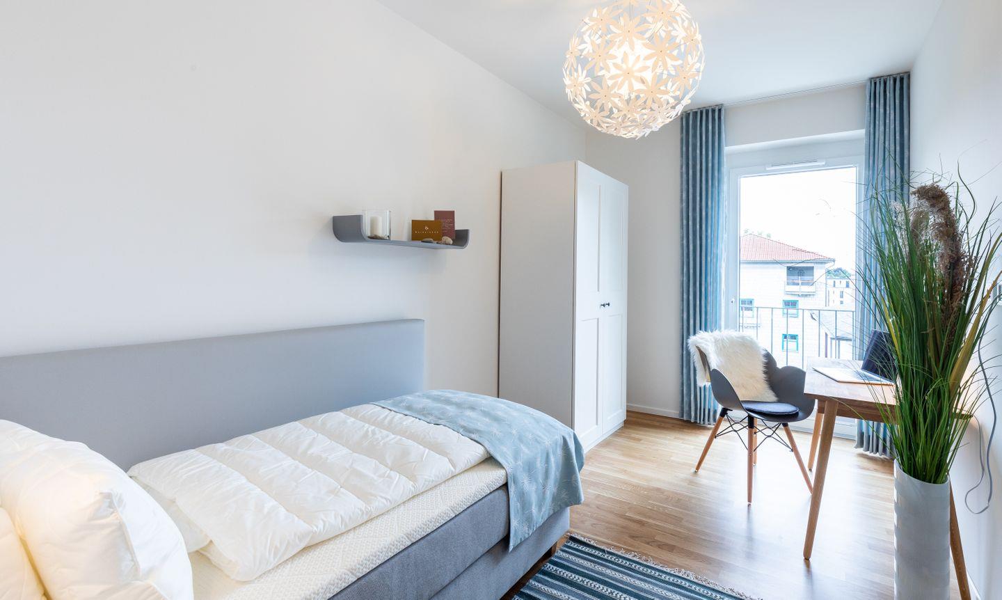 Beide Schlafzimmer der Wohnung sind mit Boxspringbetten der Größe 180x200 cm und 90x200 cm ausgestattet und bieten darüber hinaus geräumige Kleiderschränke. Das Einzelbettschlafzimmer verfügt außerdem über einen Schreibtisch, für beispielsweise Home-Office-Arbeiten. Wäschepakete (Bettbezüge und Handtücher) sind optional gegen Gebühr dazu buchbar