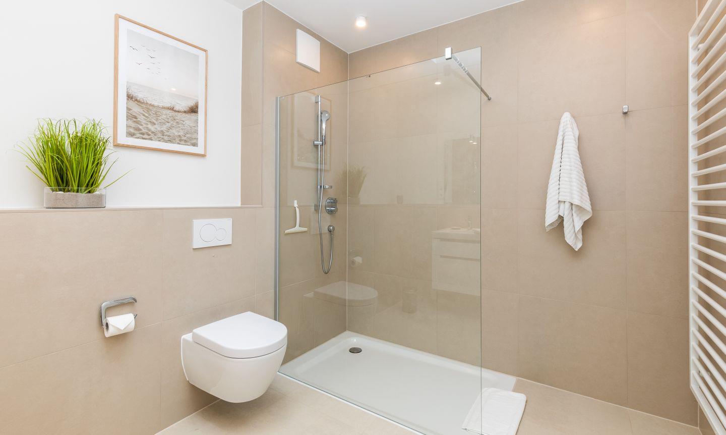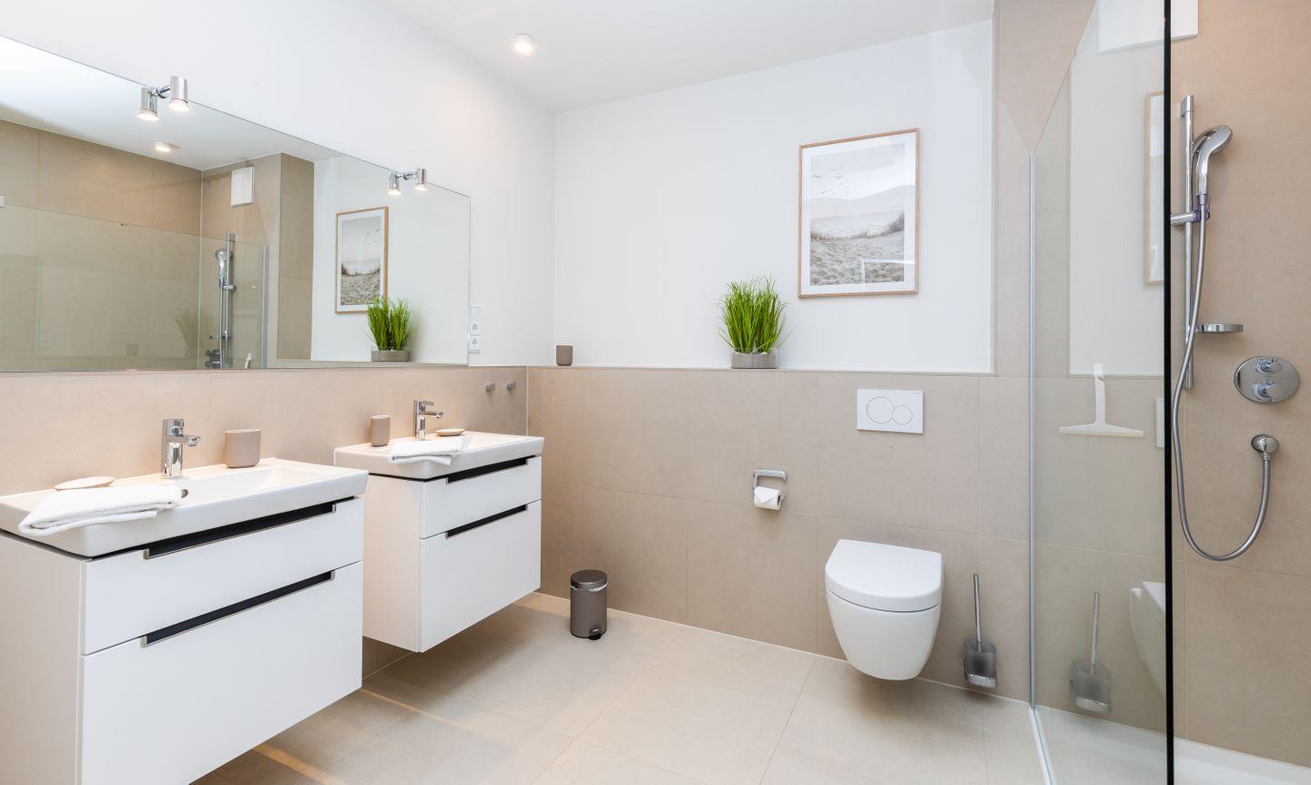Für Komfort sorgen die beiden Badezimmer (ebenerdiges Duschbad + Gäste WC). Alle Fenster in der Wohnung sind mit elektrischen Fliegengittern bzw. Sonnenschutz ausgestattet. Eine Waschmaschine steht Ihnen kostenfrei im Abstellraum zur Verfügung.