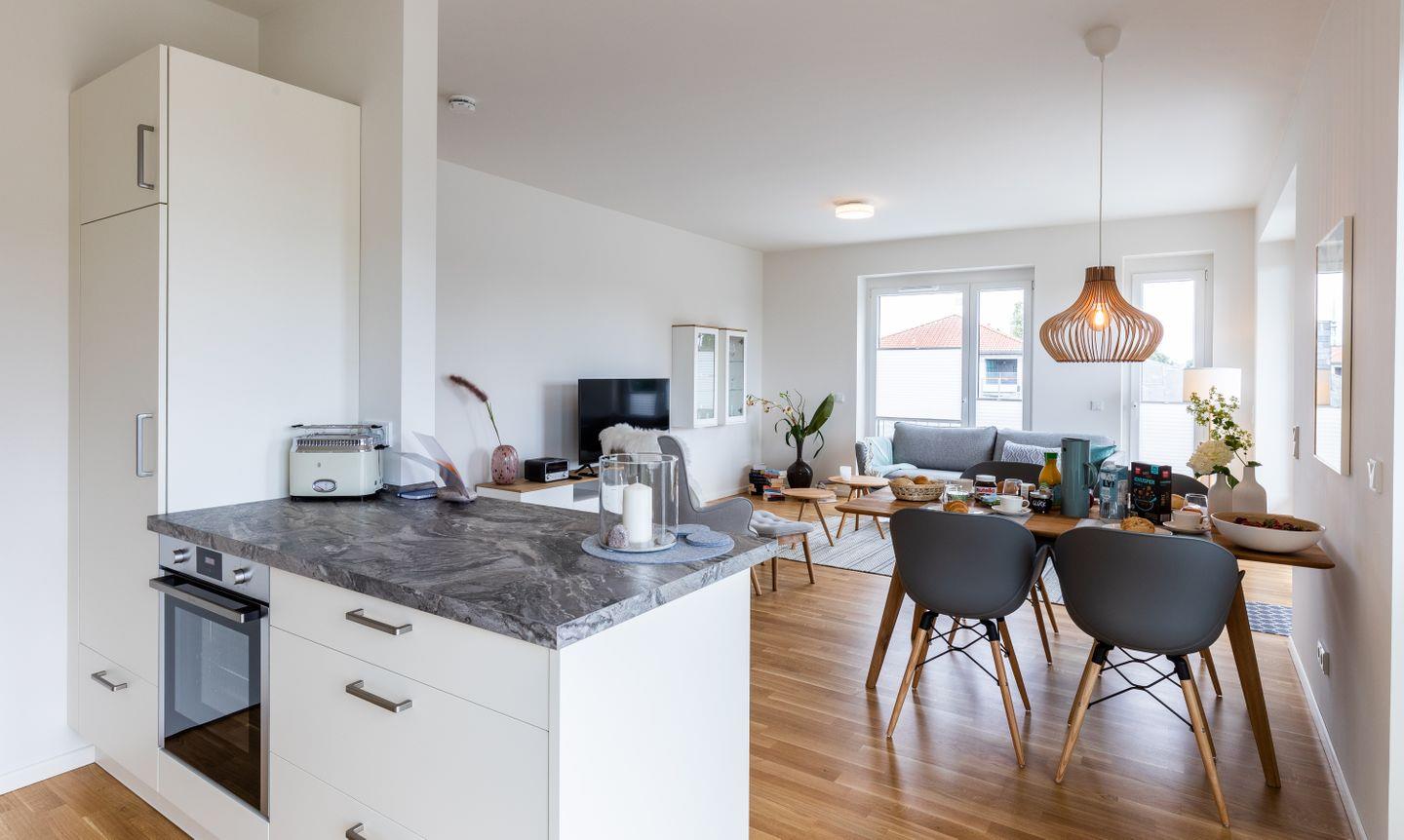 Der helle Wohn-/ Essbereich mit direktem Blick auf die Schlei ist ausgestattet mit einer hochwertigen Einbauküche, sowie einem Esstisch und bequemen Sitzmöglichkeiten für entspannte Stunden. Zusätzlich befindet sich hier der Zugang zum großzügigen, überdachten Balkon, welcher mit Gartenmöbeln und einem Elektrogrill bestückt ist.