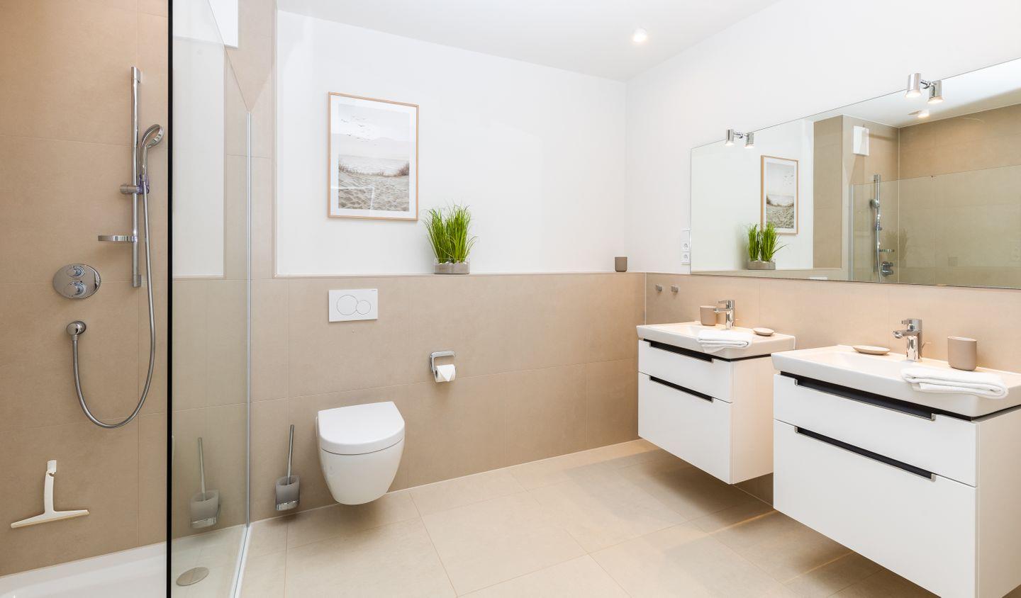 Für Komfort sorgen die beiden Badezimmer (ebenerdiges Duschbad + Gäste WC). Alle Fenster in der Wohnung sind mit elektrischen Fliegengittern bzw. Sonnenschutz ausgestattet. Eine Waschmaschine steht Ihnen kostenfrei im Abstellraum zur Verfügung.