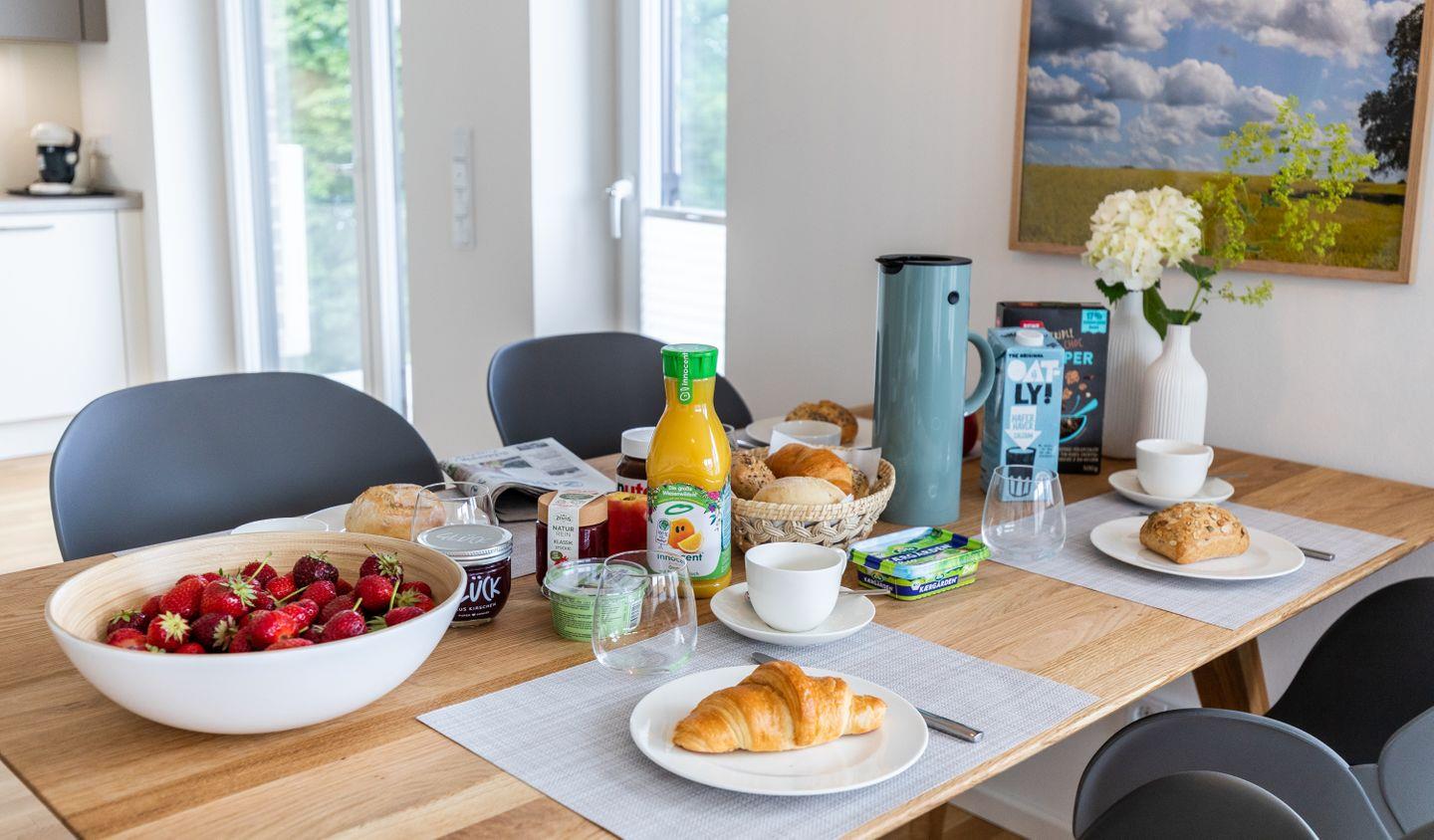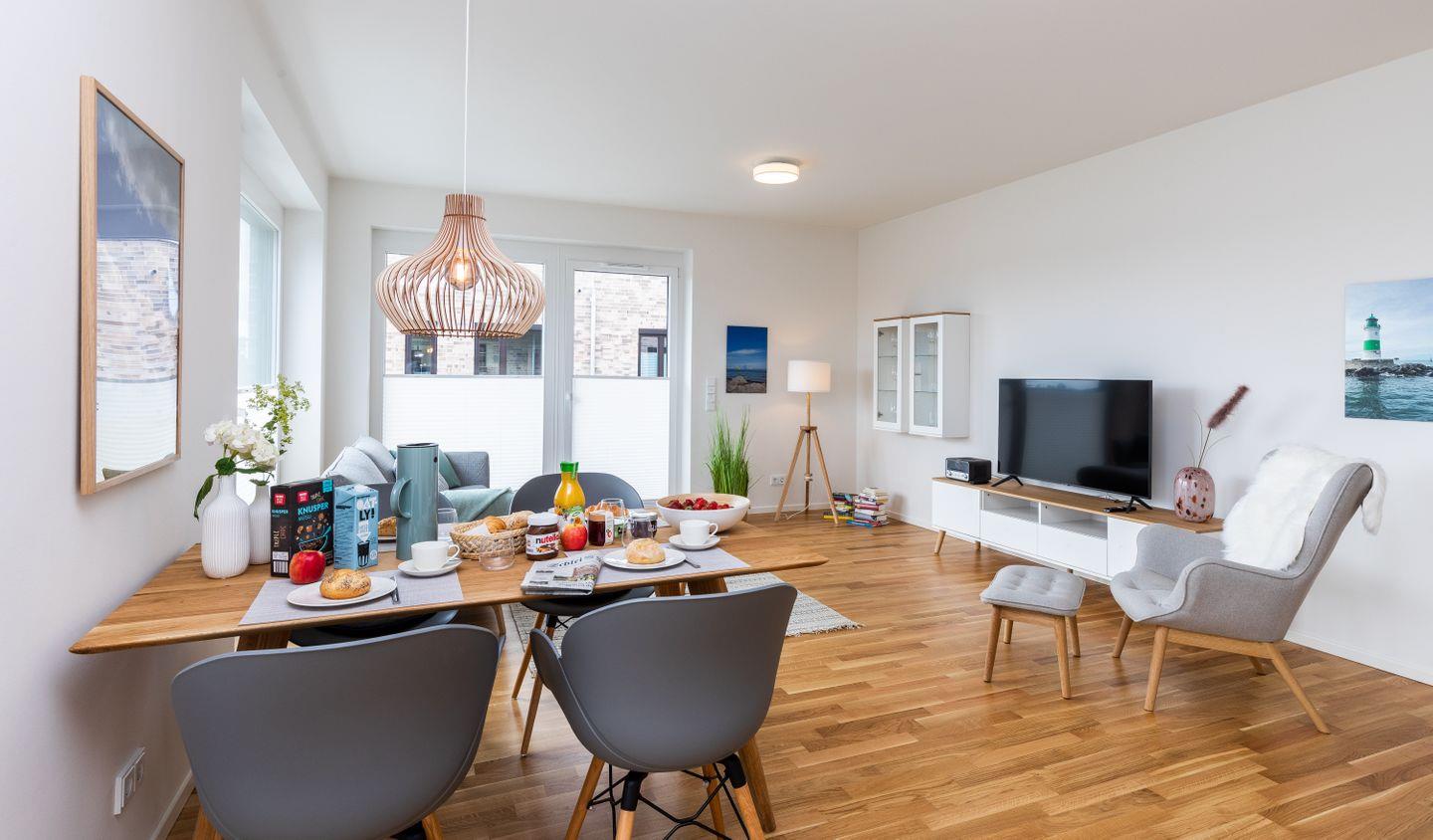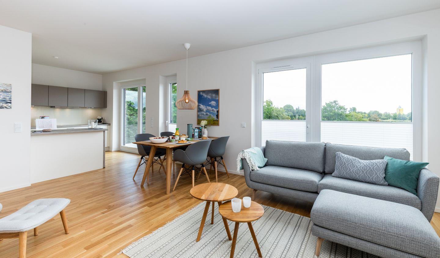 Der helle Wohn-/ Essbereich mit direktem Blick auf die Schlei ist ausgestattet mit einer hochwertigen Einbauküche, sowie einem Esstisch und bequemen Sitzmöglichkeiten für entspannte Stunden. Zusätzlich befindet sich hier der Zugang zu den Balkonen, welche mit Gartenmöbeln und einem Elektrogrill bestückt sind.