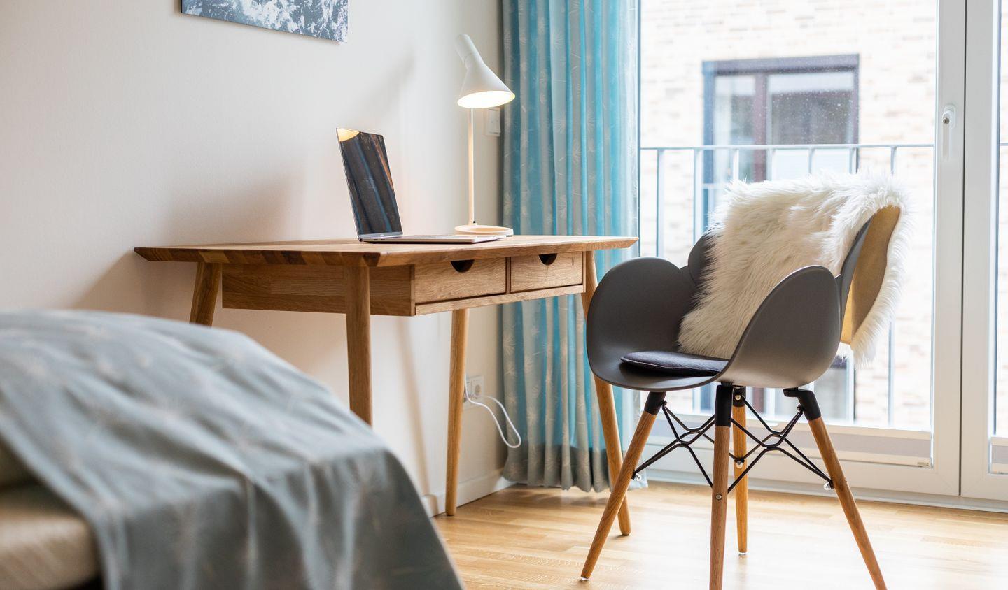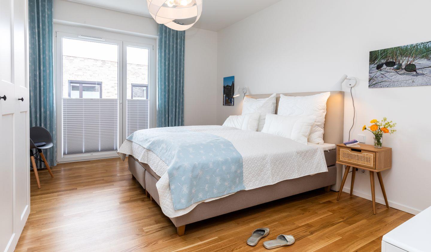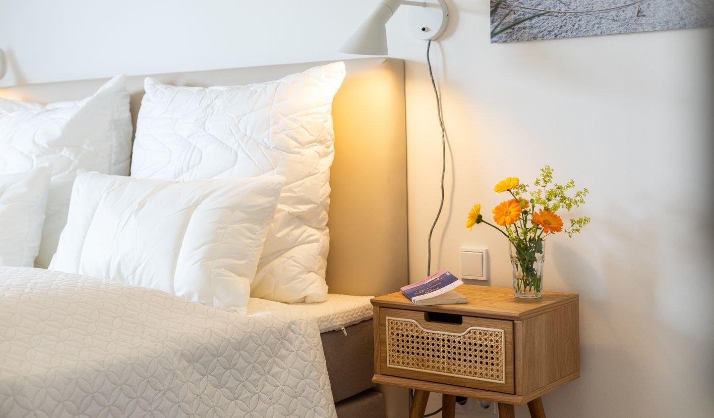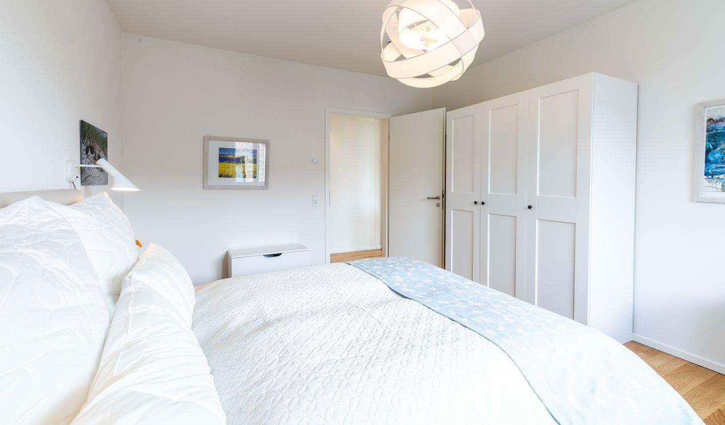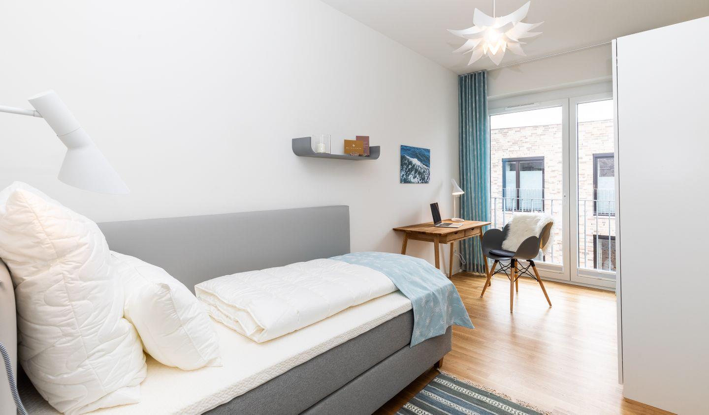 Beide Schlafzimmer der Wohnung sind mit Boxspringbetten der Größe 180x200 cm und 90x200 cm ausgestattet und bieten darüber hinaus geräumige Kleiderschränke. Das Einzelbettschlafzimmer verfügt außerdem über einen Schreibtisch, für beispielsweise Home-Office-Arbeiten.