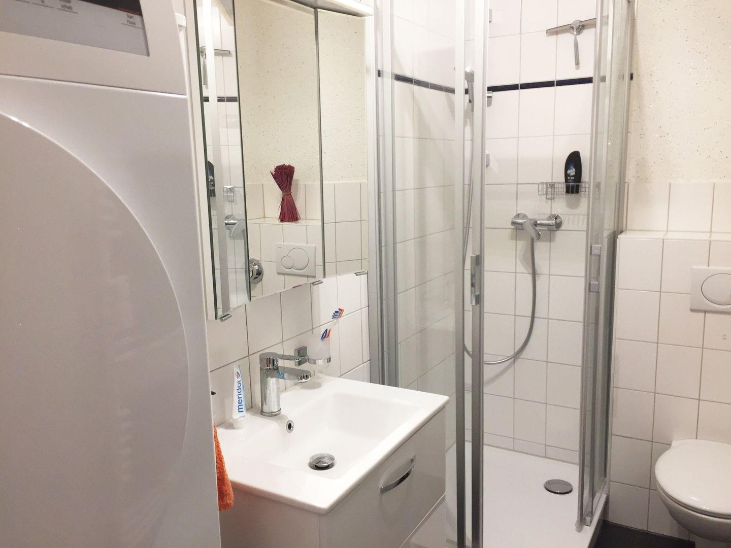 Das Schlafzimmer ist mit Doppelbett (180x200 cm), das Badezimmer mit Dusche, Handtuchtrockner, Waschmaschine und Trockner ausgestattet.