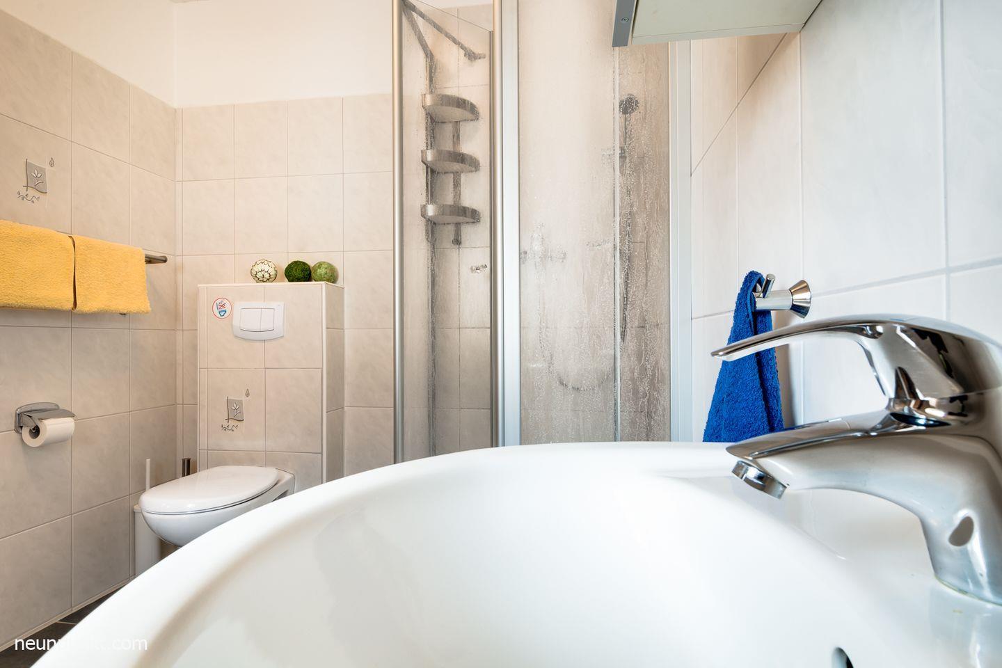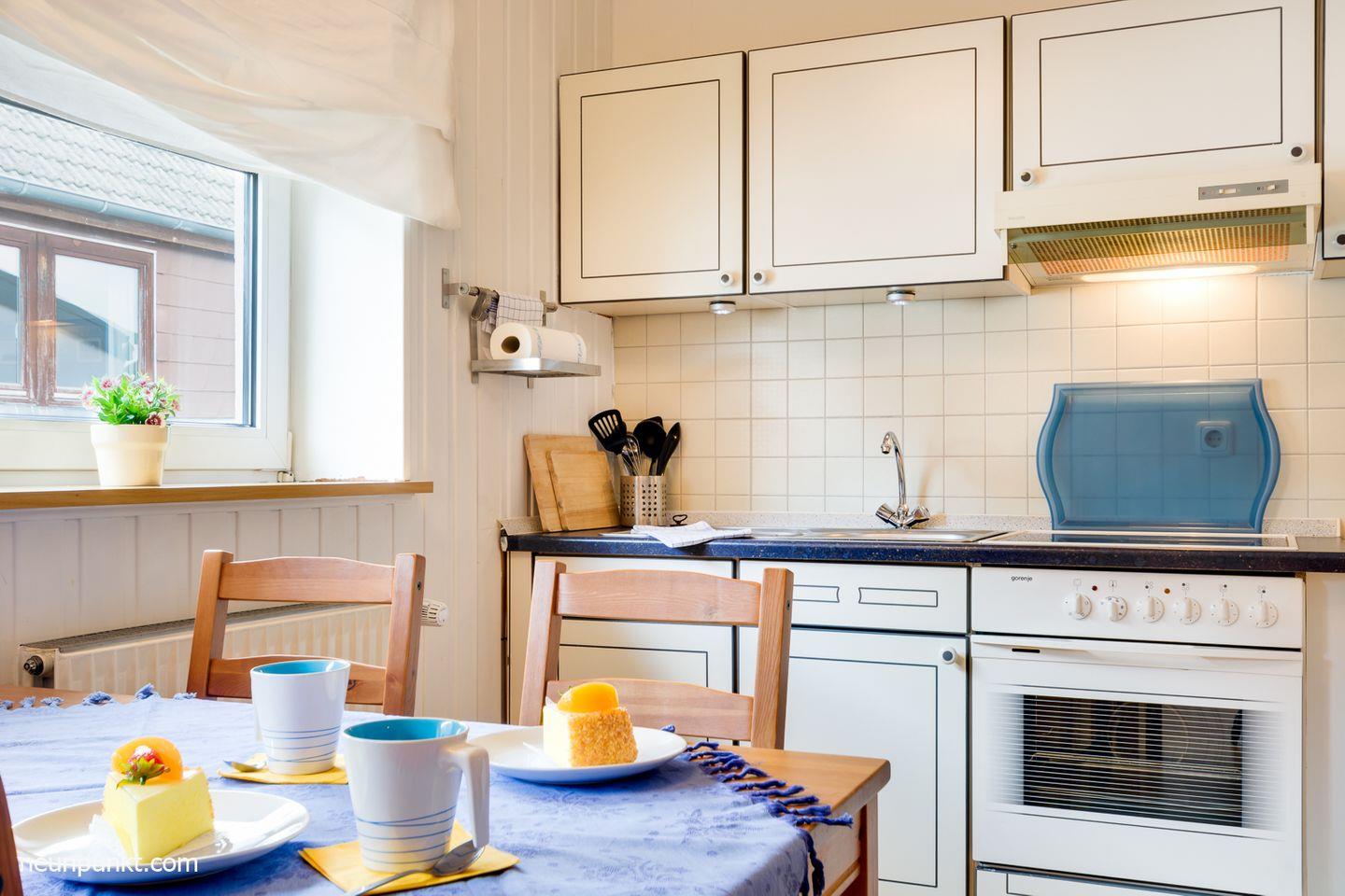 Der Wohnbereich verfügt über ein gemütliches Sofa, einen Esstisch und eine gut eingerichtete, offene Küche. Das Schlafzimmer ist mit einem Doppelbett und einem Kleiderschrank ausgestattet. Ein Badezimmer mit einer Dusche rundet die schöne Ferienwohnung ab.