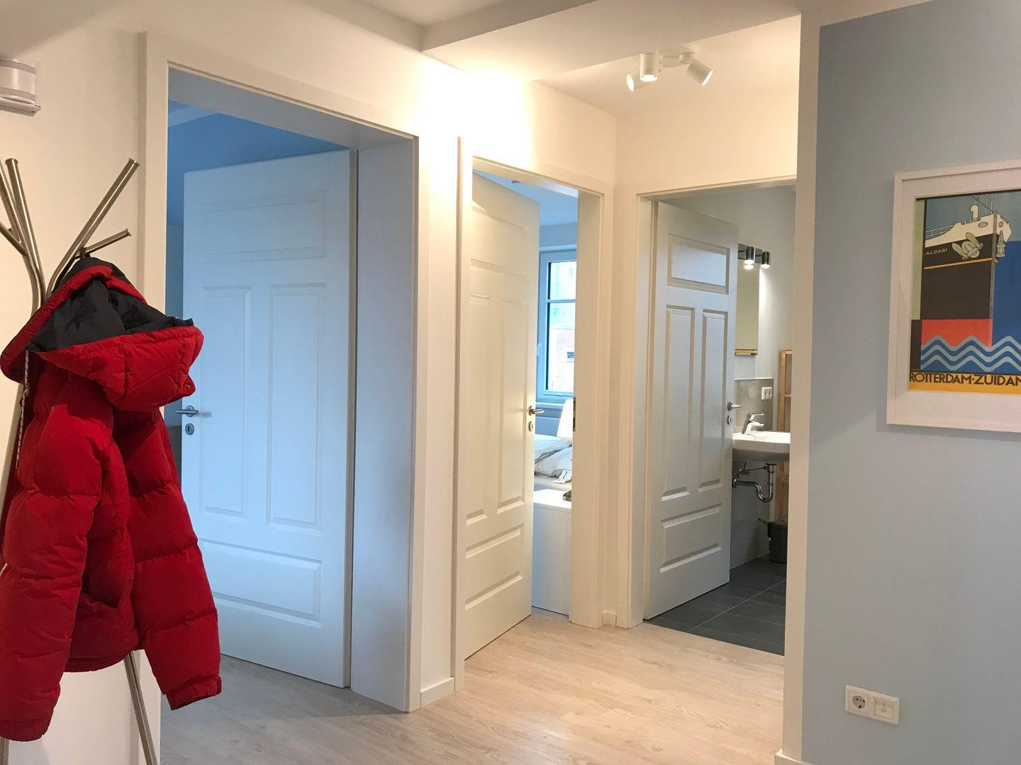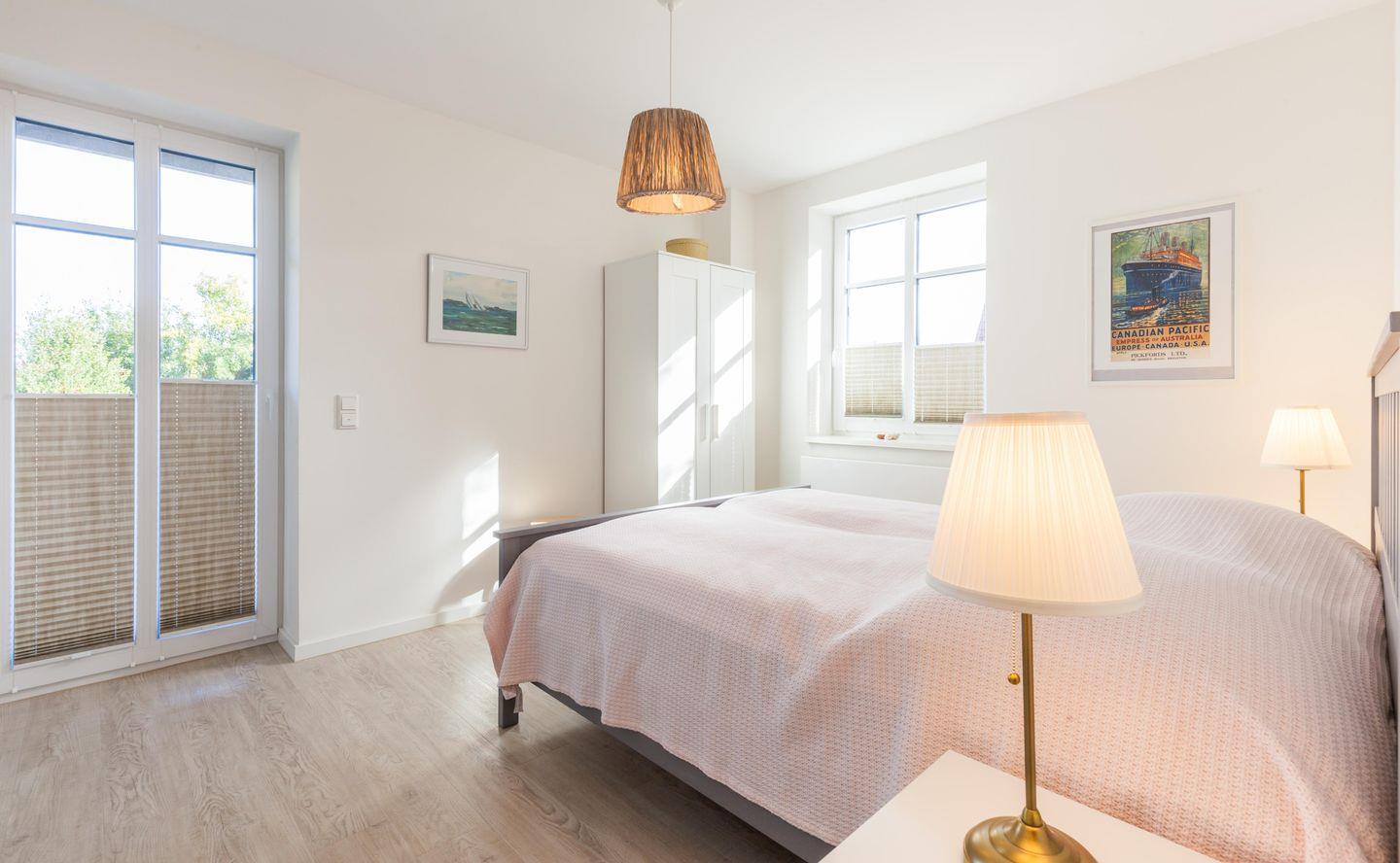 Links von der Eingangsdiele befinden sich die beiden Doppelschlafzimmer (jeweils 2x 80x200cm), welche auch einen Zugang zur großzügigen Terrasse und dem Garten haben.