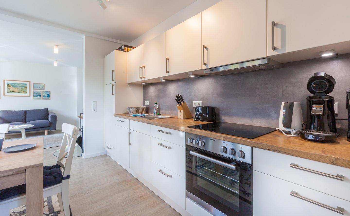 Das Wohnzimmer ist mit Kaminofen und großem Flat-Screen gemütlich gestaltet. Die angrenzende Küche mit Geschirrspülmaschine, Backofen, Ceranfeld, Toaster, Senseo-Padmaschine, etc. lässt gegenüber der heimischen Küche keinerlei Wünsche offen.