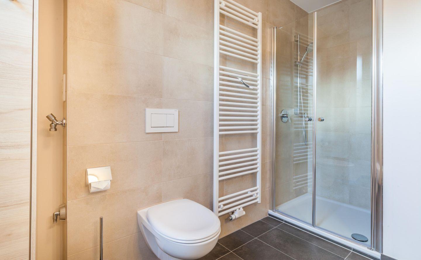 Das wohlige Bad bietet eine Glasdusche mit bequemer Einstiegshöhe.