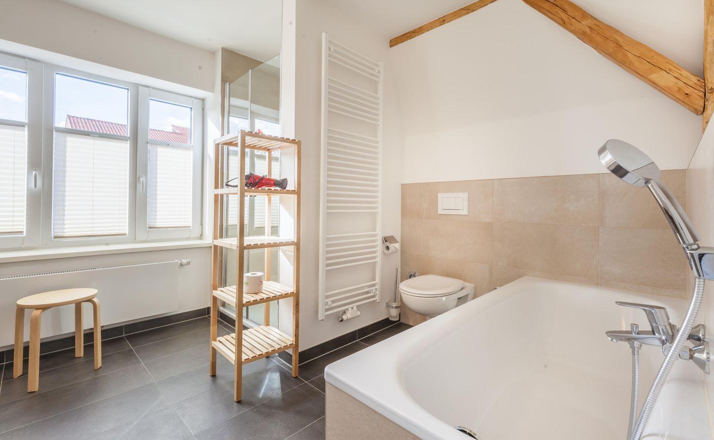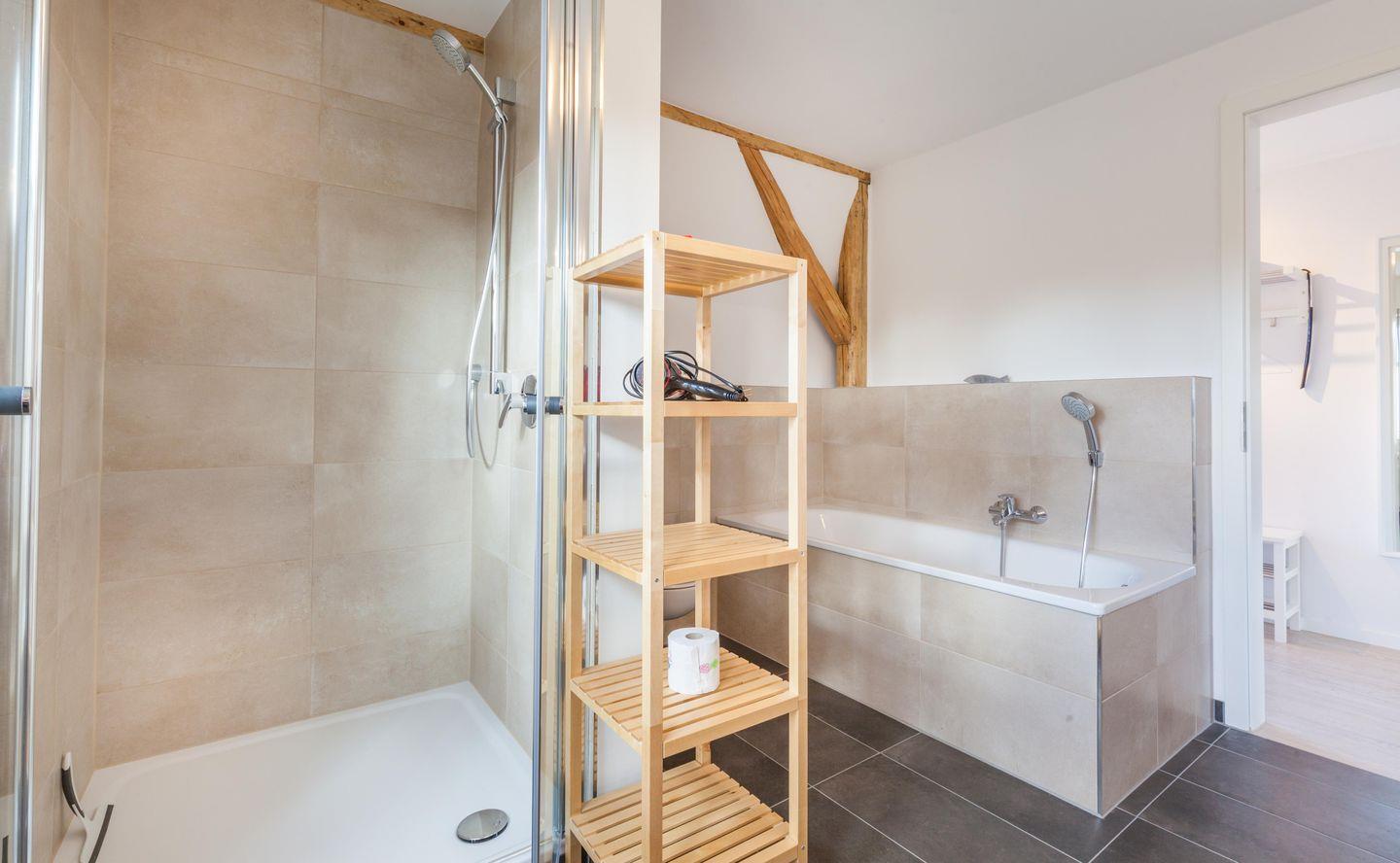 Eine Dusche mit bequemer Einstiegshöhe, eine große Badewanne, sowie 2 Waschbecken machen das großzügige Badezimmer zum Wohlfühlort.