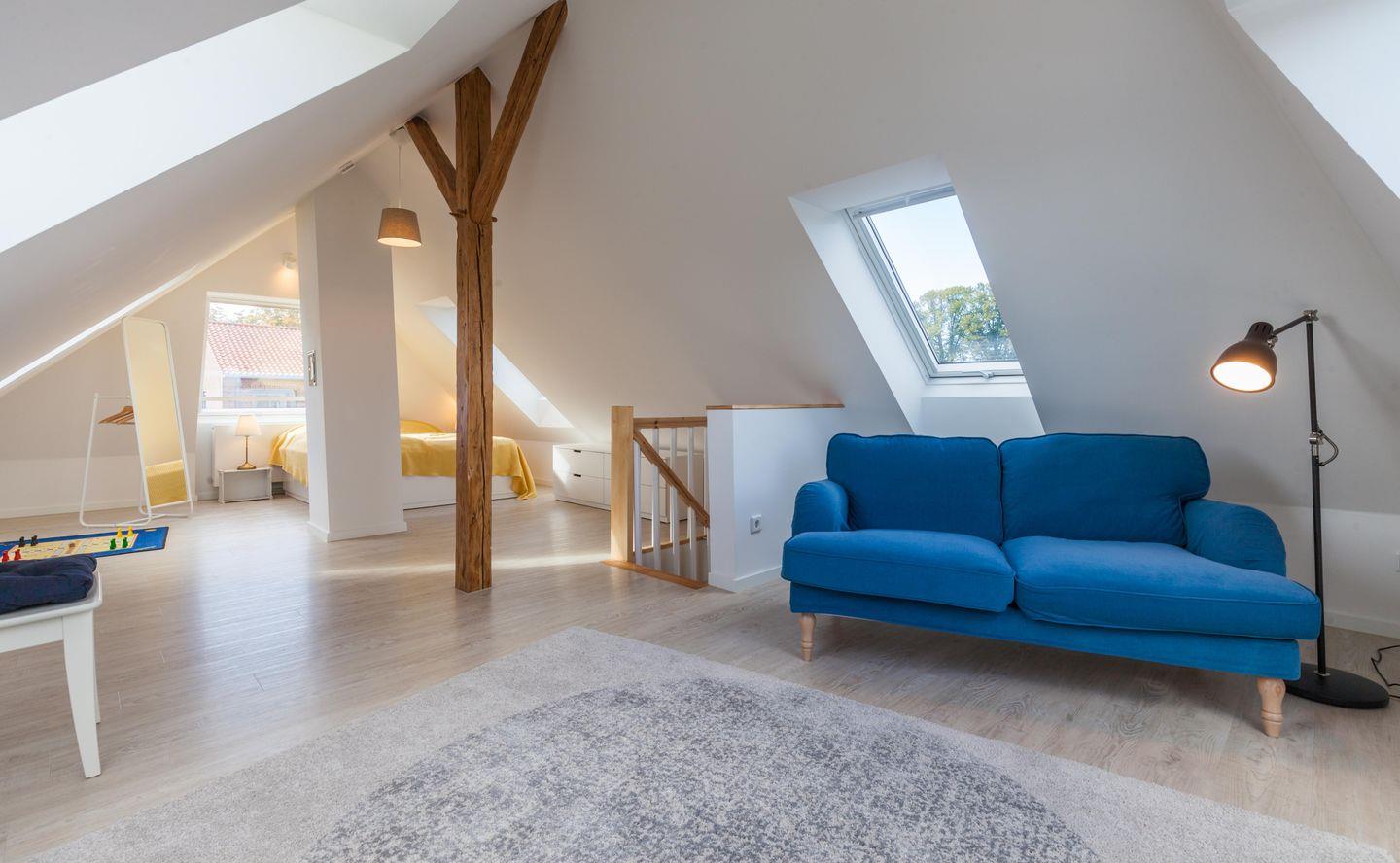 Im Dachgeschoss befindet sich ein weiterer Schlafraum (160x200cm) für 2 Personen. Von der gemütlichen Sofaecke können Sie hier den Kindern beim Spielen zusehen.