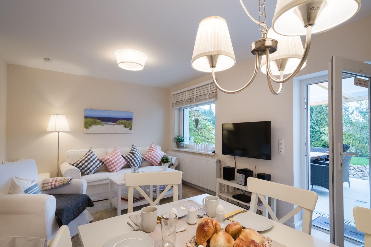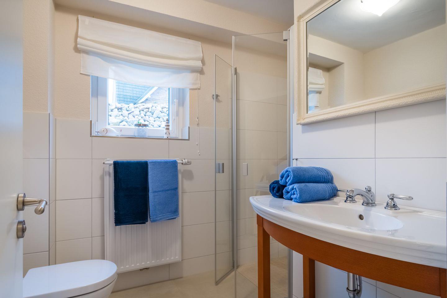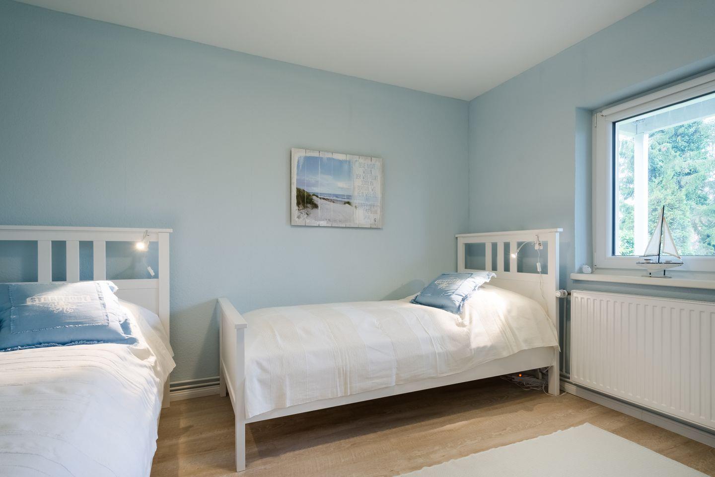 Die Ferienwohnung befindet sich im Souterrain mit separatem Eingang und teilt sich auf in ein gemütliches Wohn-/ Esszimmer mit offener Küche (Ceranfeld, Geschirrspüler) und Terrassenzugang, ein Schlafzimmer mit einem Doppelbett (2x 90x200cm) inklusive TV, ein Schlafzimmer mit 2 Einzelbetten (jeweils 90x200 cm), ein Schlafzimmer mit Etagenbett (jeweils 90x200 cm), ein modernes Duschbad und ein zusätzliches Gäste-WC.