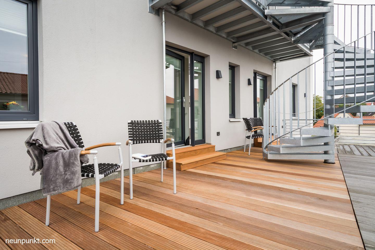 Zur Ferienwohnung gehört eine Terrasse mit Bestuhlung und einem Sonnenschirm.