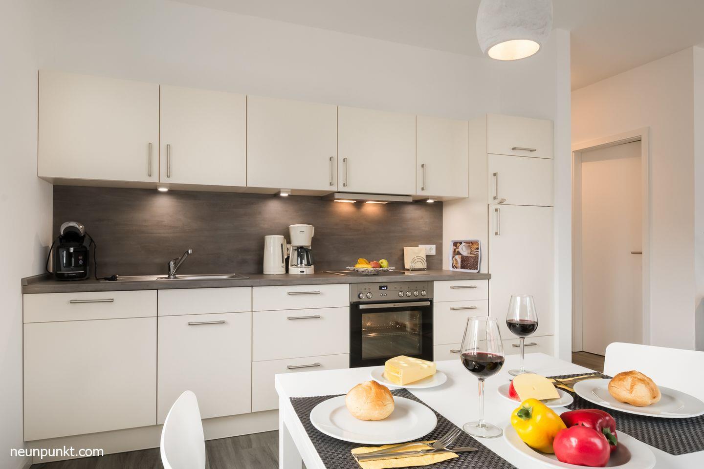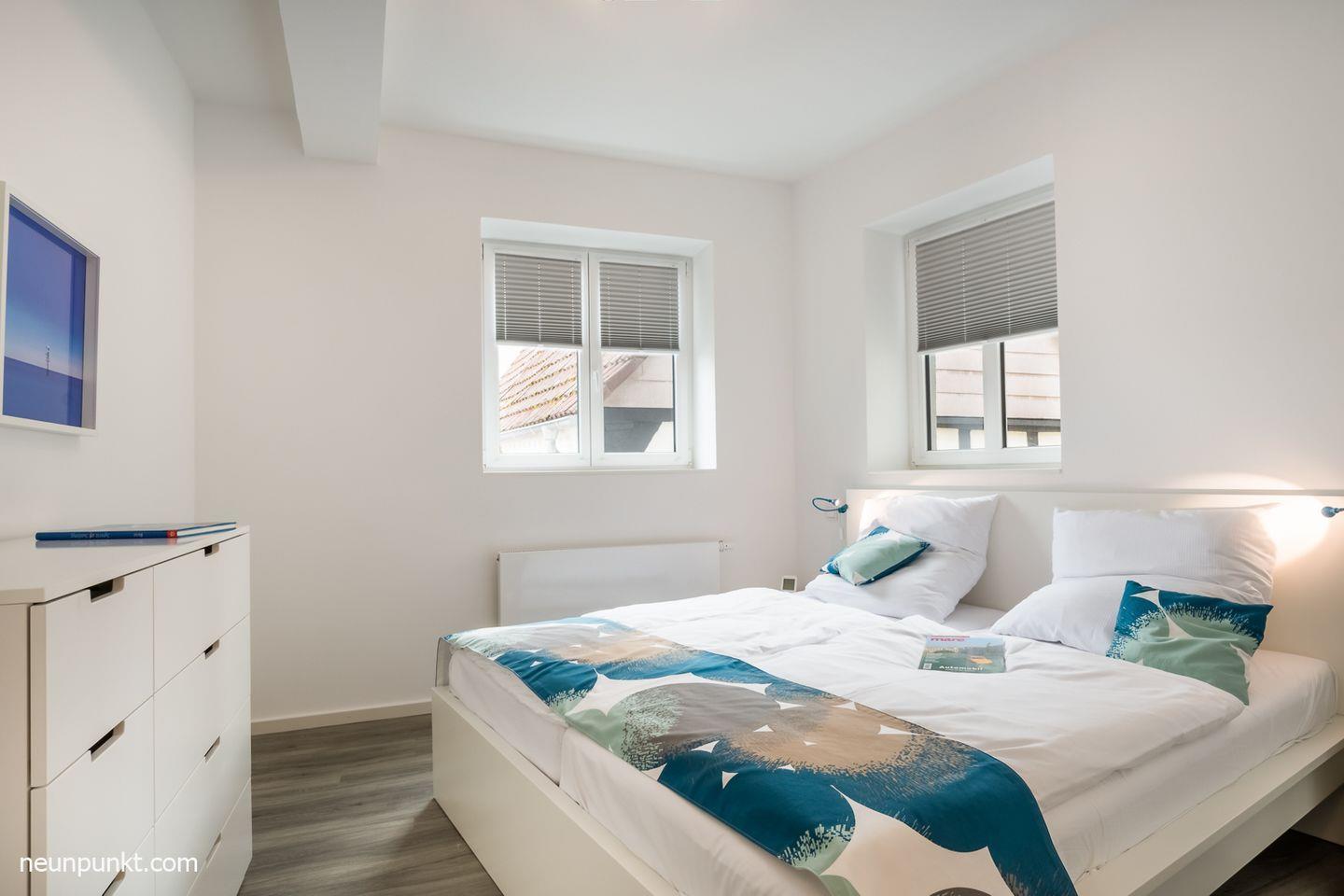 Die Ferienwohnung teilt sich auf in einen Flur mit Garderobe, einen begehbaren Kleiderschrank, ein Badezimmer mit einer Dusche und einem Handtuchtrockner, ein Schlafzimmer mit Doppelbett (2x 90x200cm) und verstellbaren Lattenrosten, ein Wohn-/ Esszimmer mit offener und voll ausgestatteter Küche, sowie ein Blick auf die Schlei.