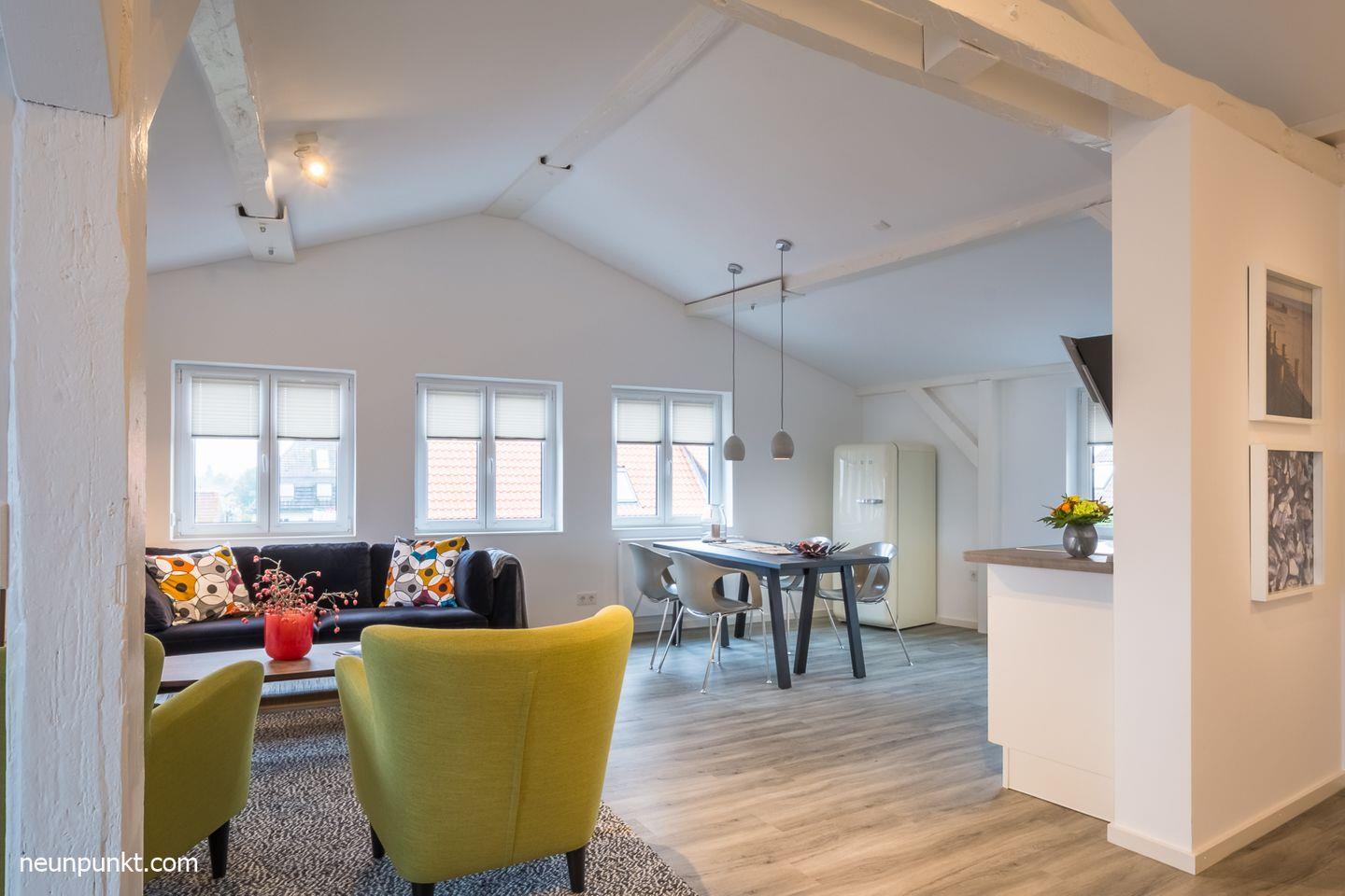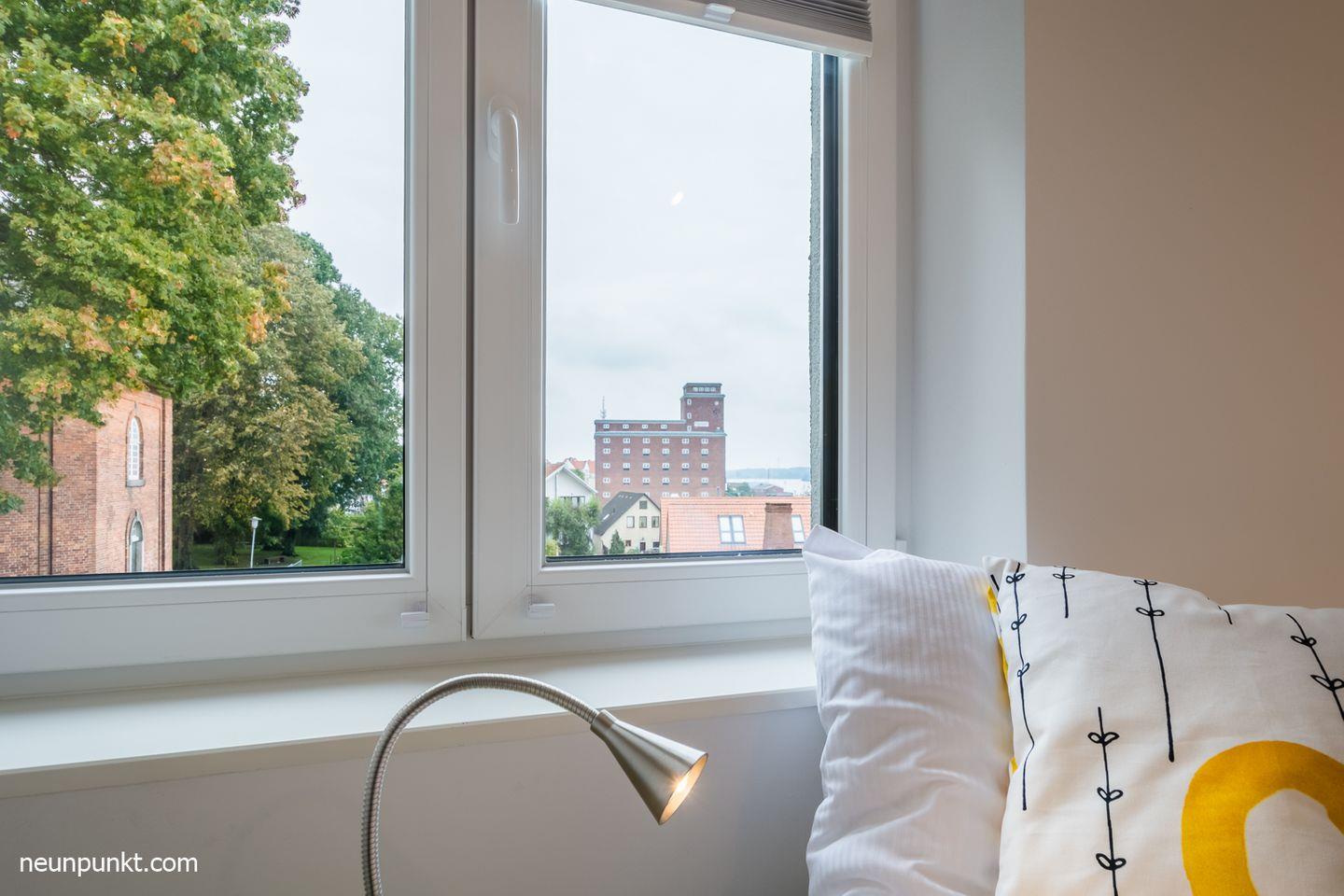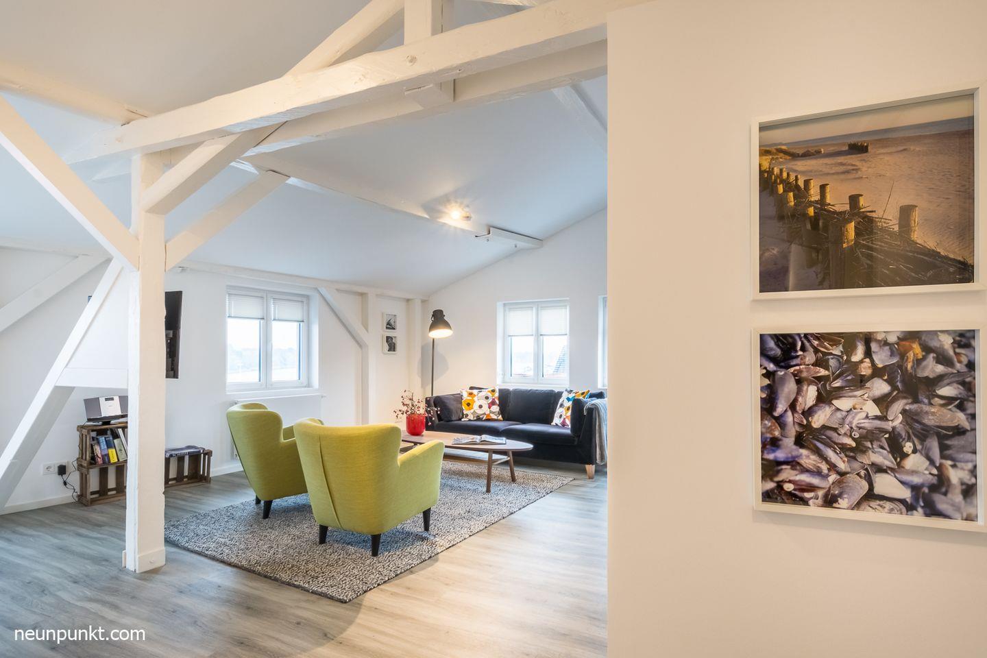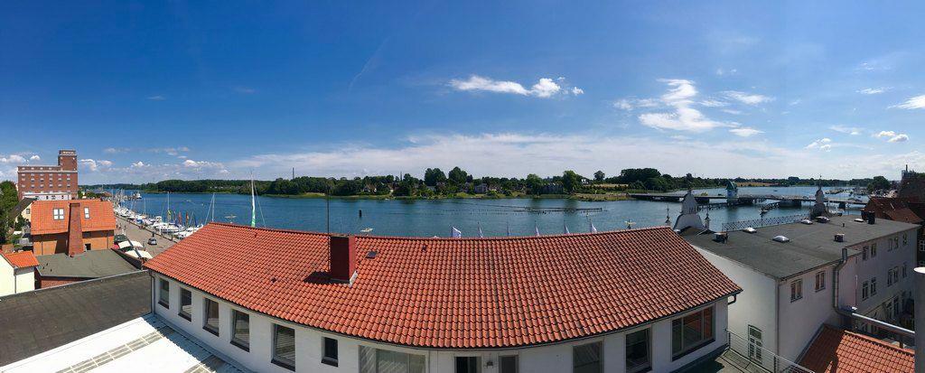 Die Ferienwohnung befindet sich im Dachgeschoss eines Mehrfamilienhauses und liegt oberhalb des Kappelner Hafens.