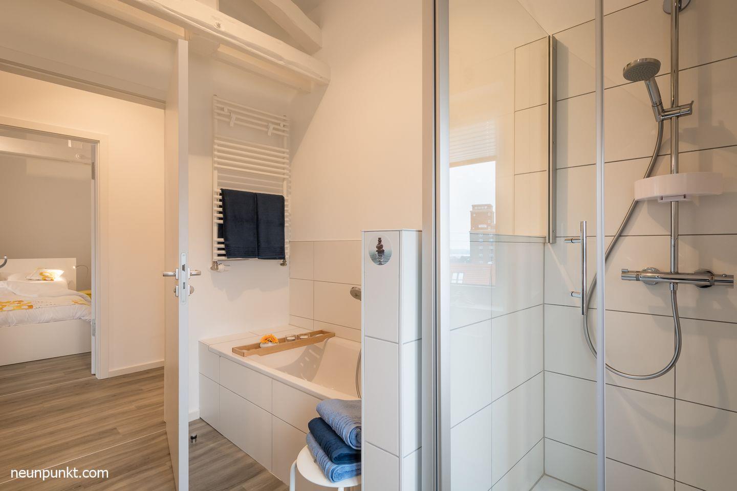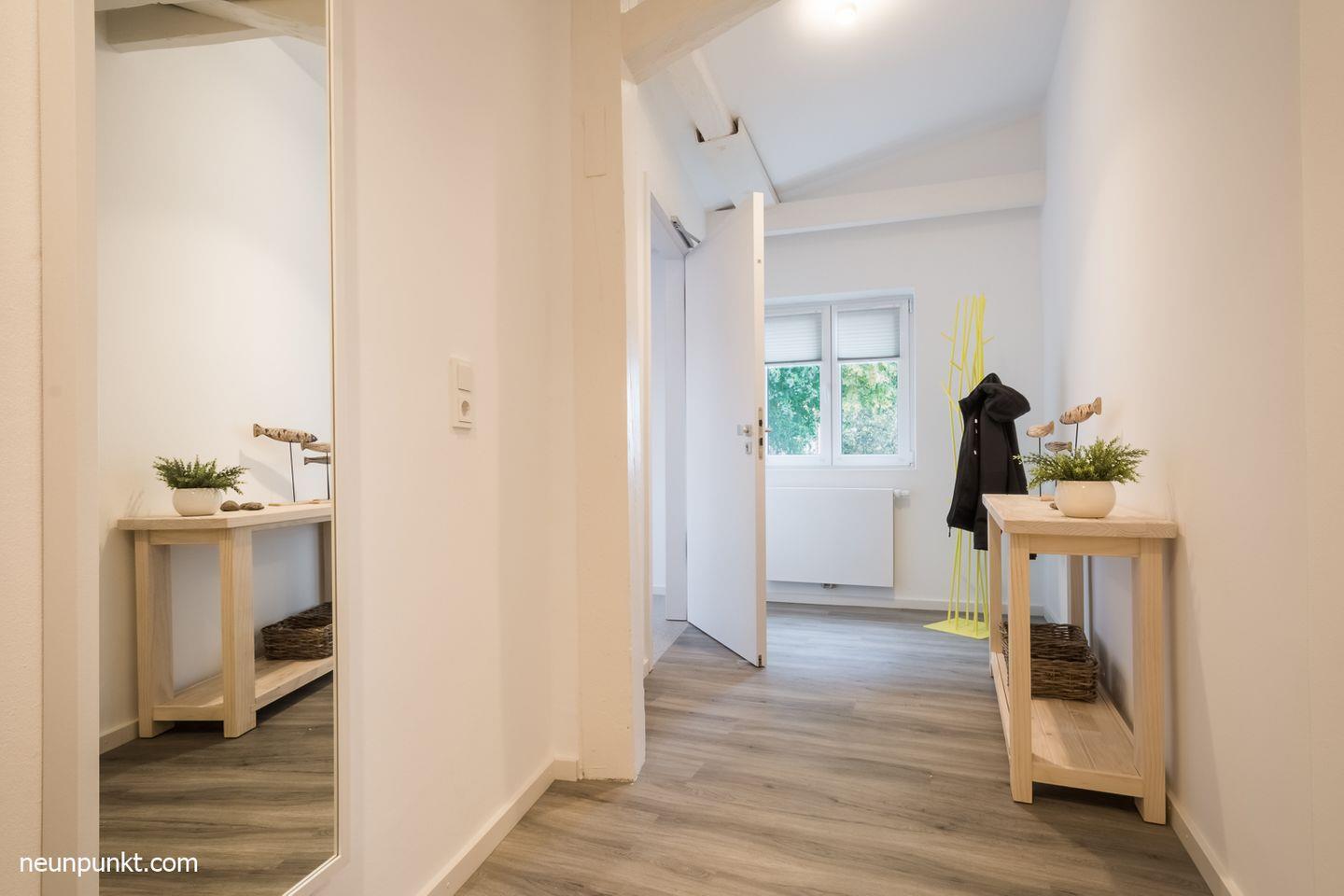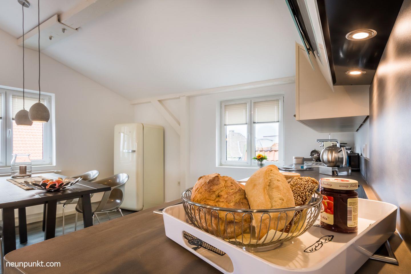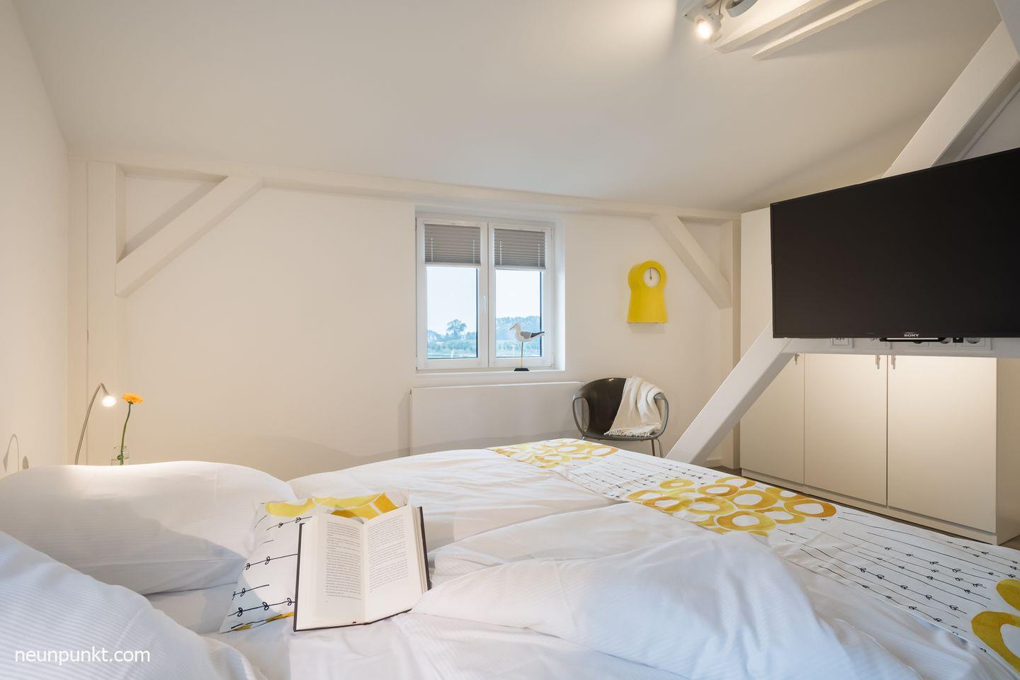 Die Ferienwohnung teilt sich auf in einen Flur mit Garderobe, ein Badezimmer mit Dusche, Wanne, Handtuchtrockner und Fenster, ein zusätzliches Gäste-WC mit Fenster, zwei Schlafzimmer (eines mit TV) mit Doppelbetten (2x 90x200cm) und verstellbaren Lattenrosten, ein Abstellraum, ein großzügiges Wohn-/ Esszimmer mit Kaminofen, offener und voll ausgestatteter Küche (Induktionsherd), sowie Vollblick auf die Schlei.