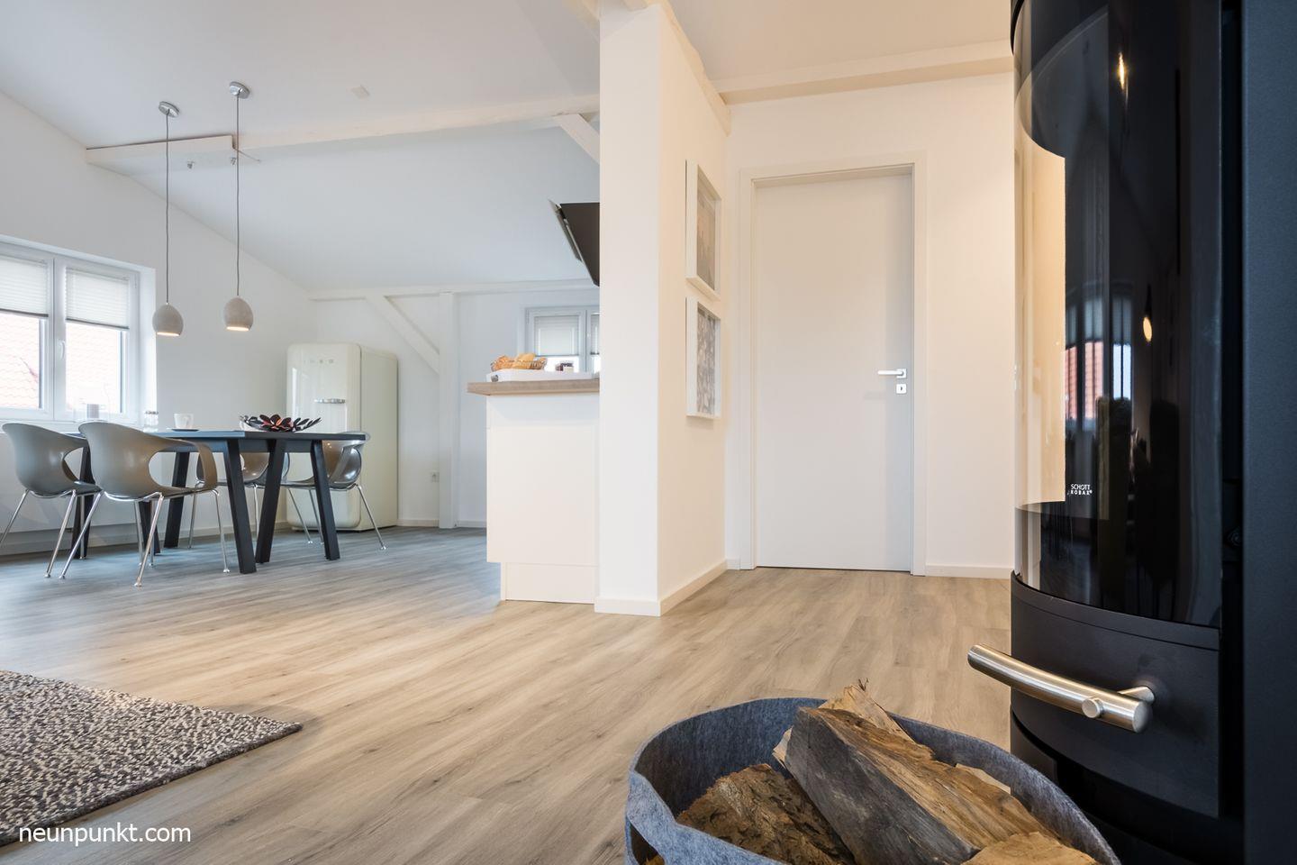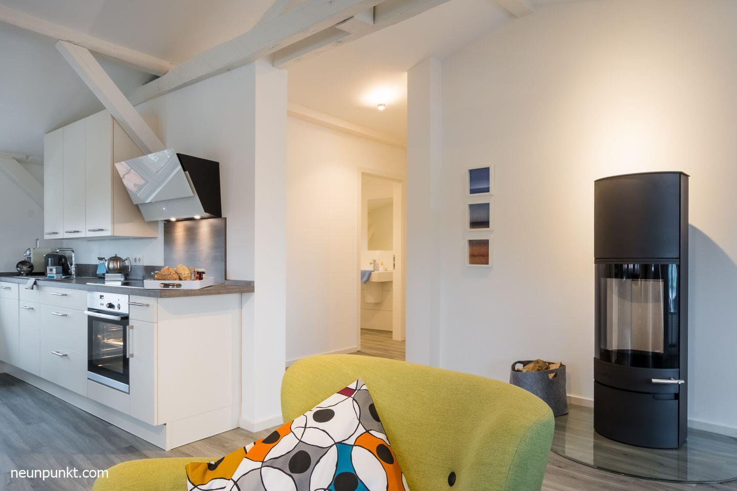 Die Ferienwohnung Heimathafen 5 in Kappeln bietet modernen Komfort mit Kamin und Blick auf die Schlei.