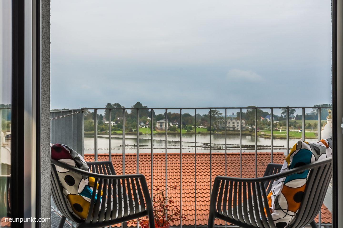 Zur Ferienwohnung gehört ein Balkon mit Bestuhlung und wunderschönem Schleiblick.
