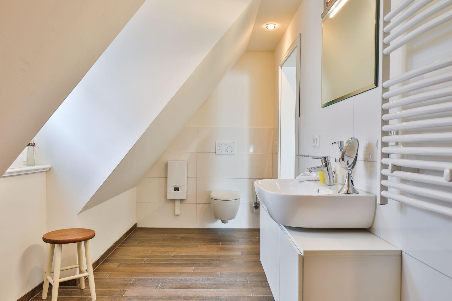 Das moderne Tageslichtbadezimmer verfügt über eine großzügige ebenerdige Dusche.