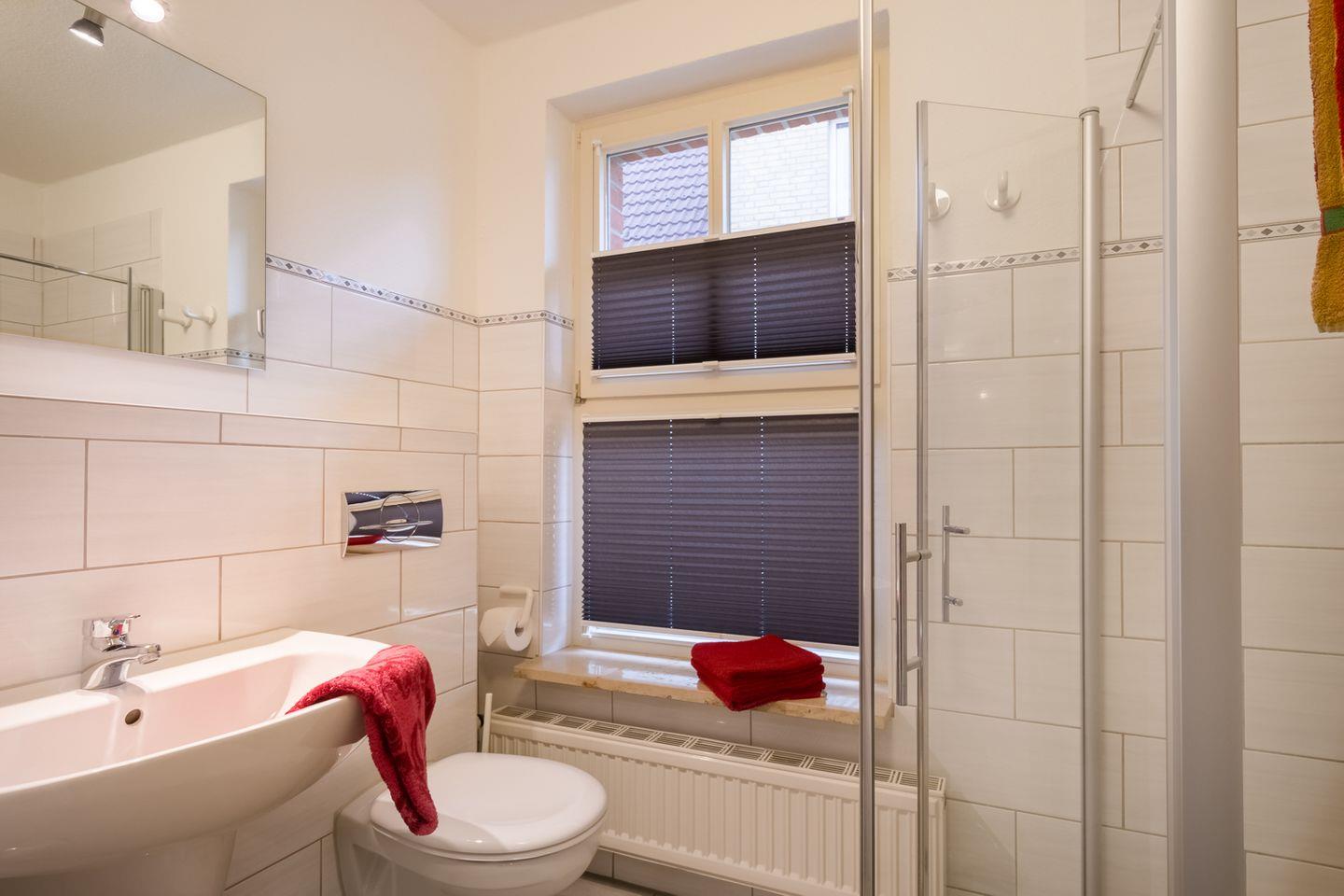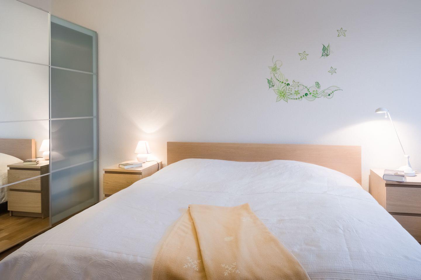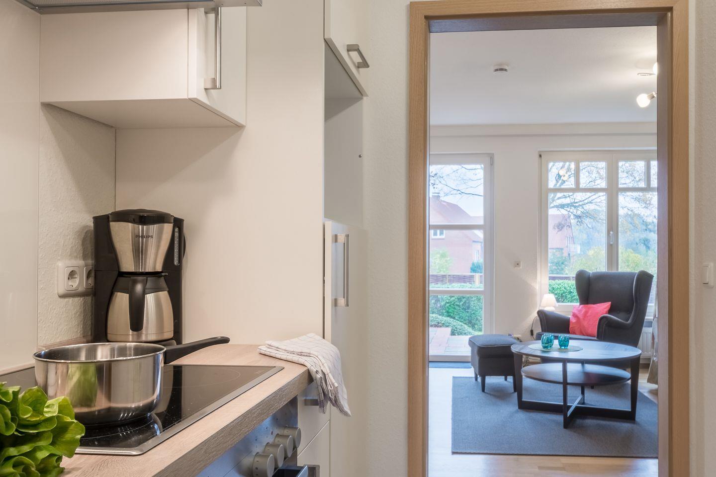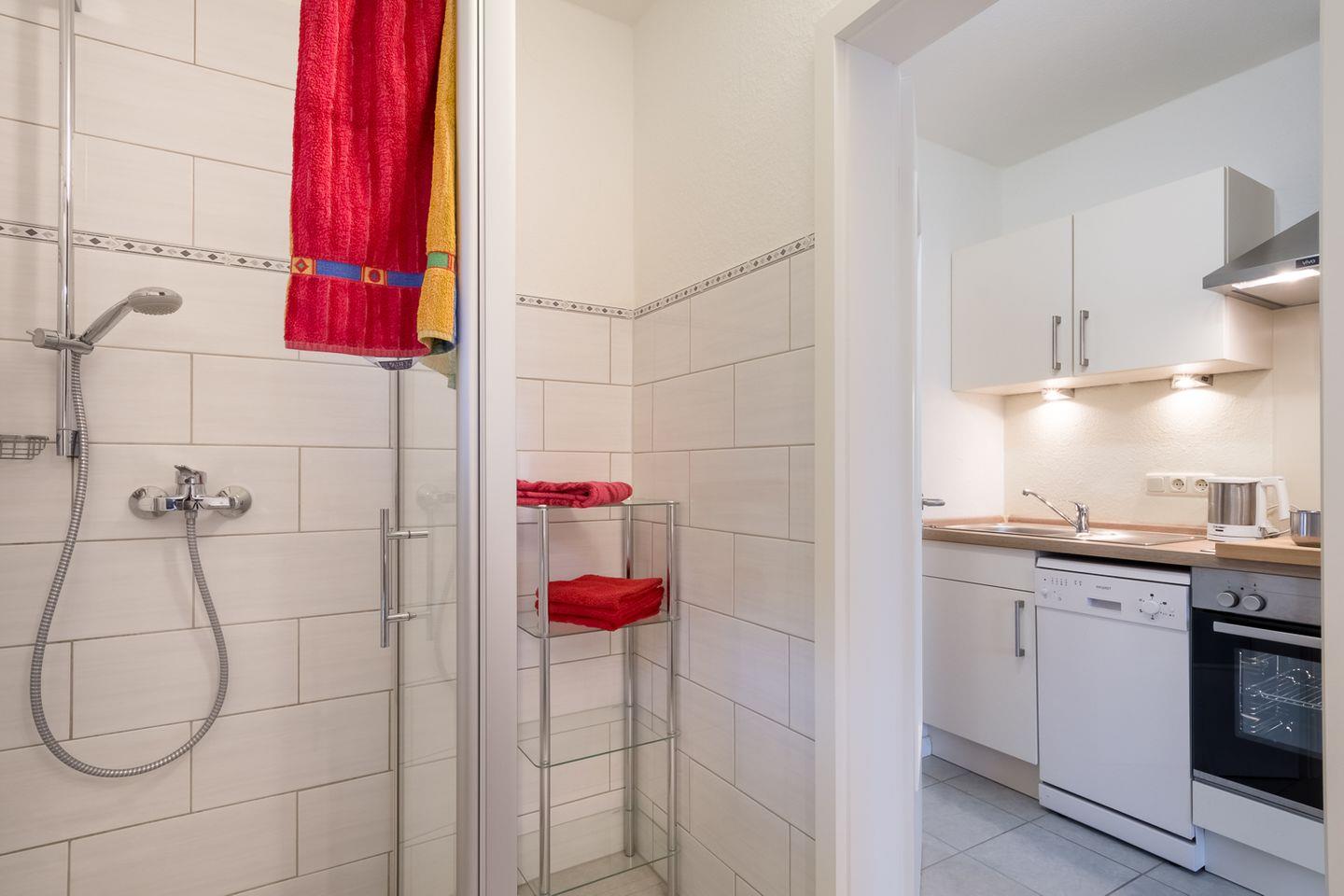 Von dem hellen Wohnzimmer mit Bodentiefen Fenstern, Esstisch und einem bequemen Sofa haben Sie Zugang zur möblierten Terrasse. In der gut eingerichteten Küche mit einer Mikrowelle und Geschirrspüler wird Ihnen auch im Urlaub das Kochen Spaß machen. Das Schlafzimmer ist mit einem Doppelbett, Kleiderschrank und kleiner Sitzgelegenheit eingerichtet. Im Badezimmer befindet sich ein großes Fenster, eine Dusche und ein Föhn.