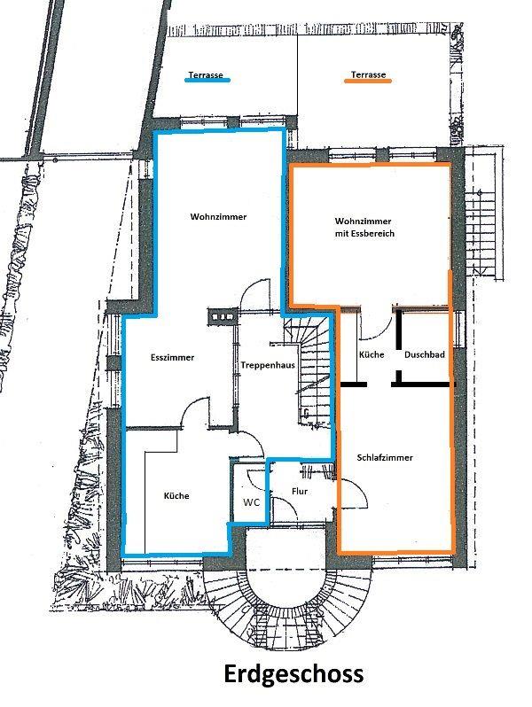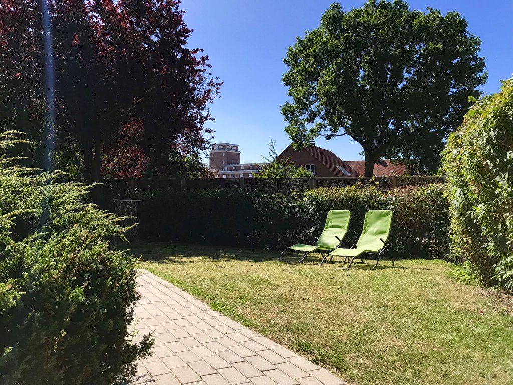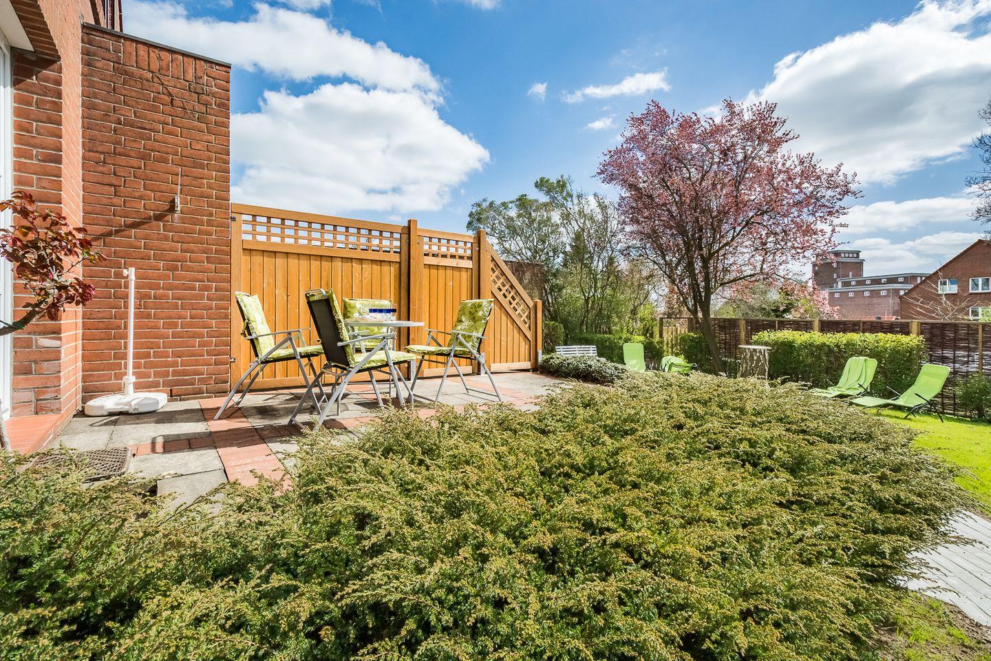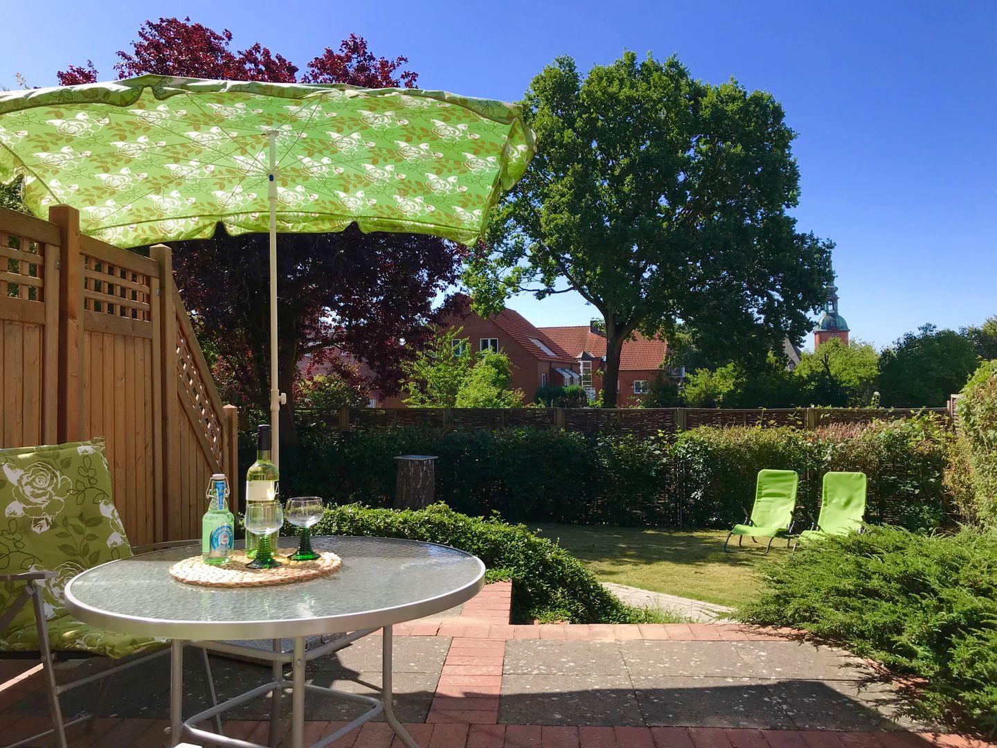 Von der Terrasse mit Sonnenschirm, Liegen und Grill haben Sie einen schönen Blick in den Garten.