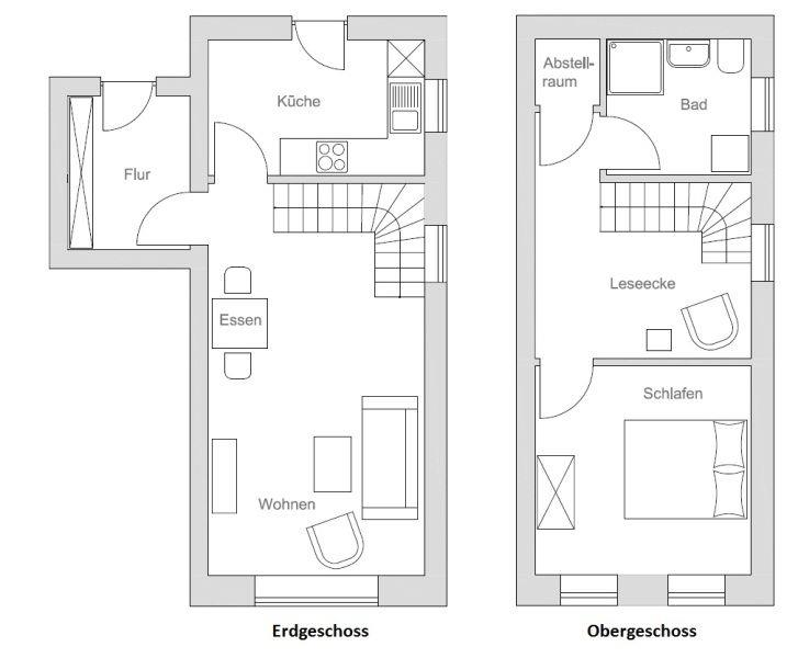 Das Obergeschoss bietet ein Duschbad, eine Leseecke, einen Abstellraum und ein Doppelschlafzimmer (2x 90x200 cm).