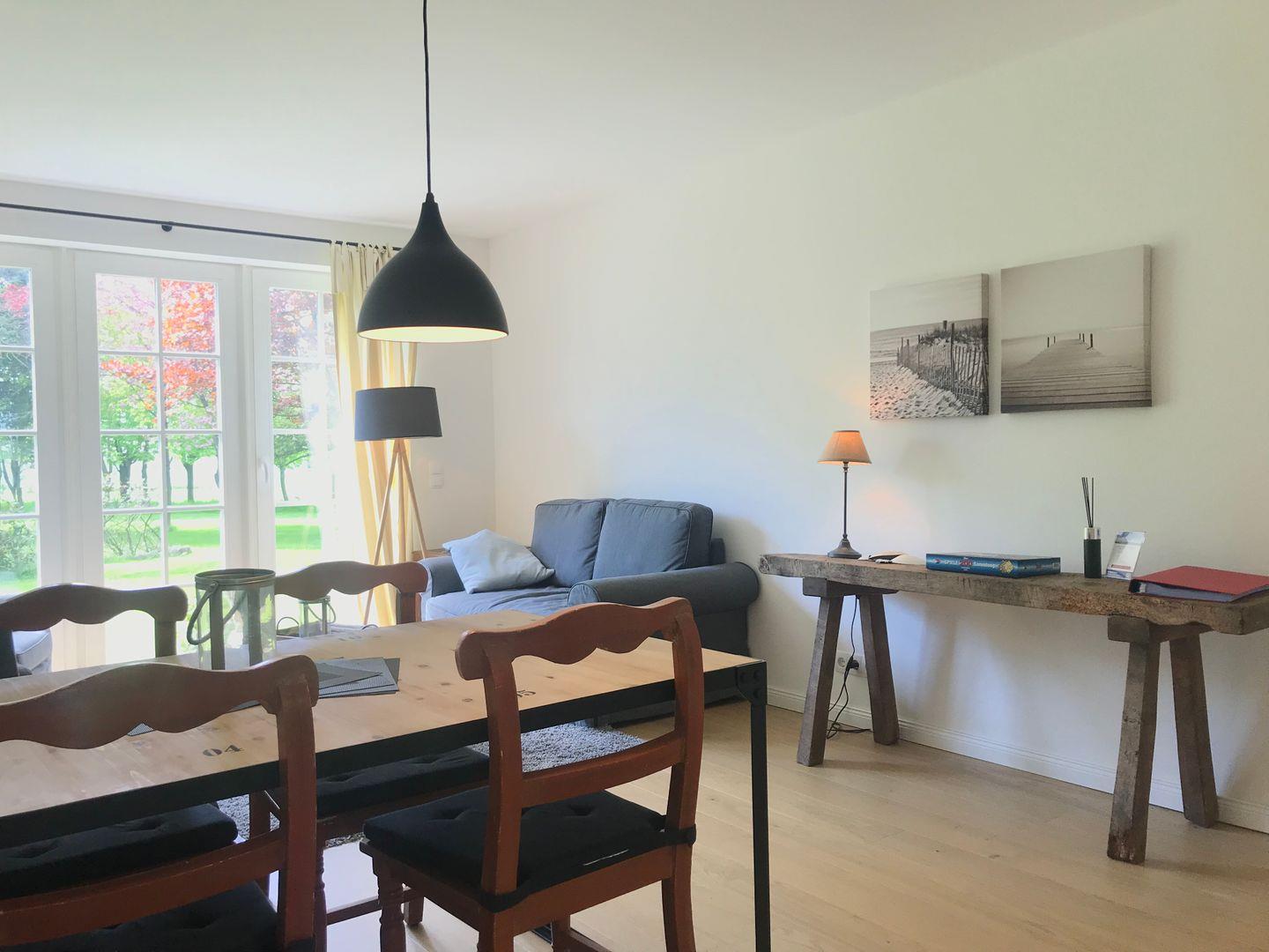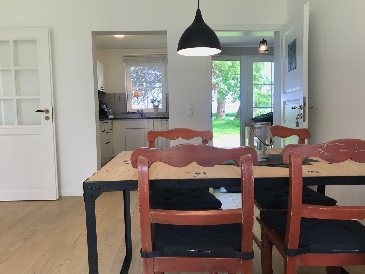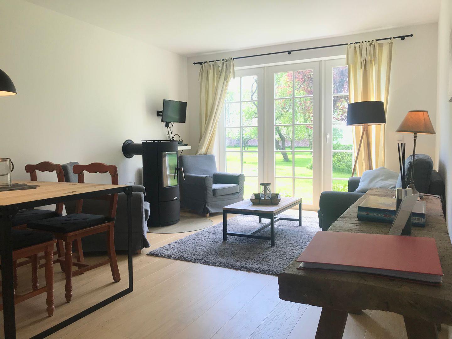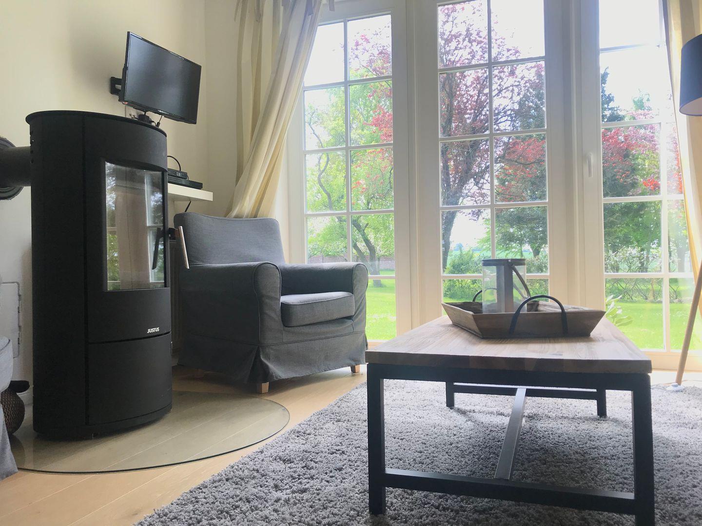 Das gemütliche Wohn-/ Esszimmer verfügt über einen Kaminofen für gemütliche Abende und einen herrlichen Ausblick in den Garten.