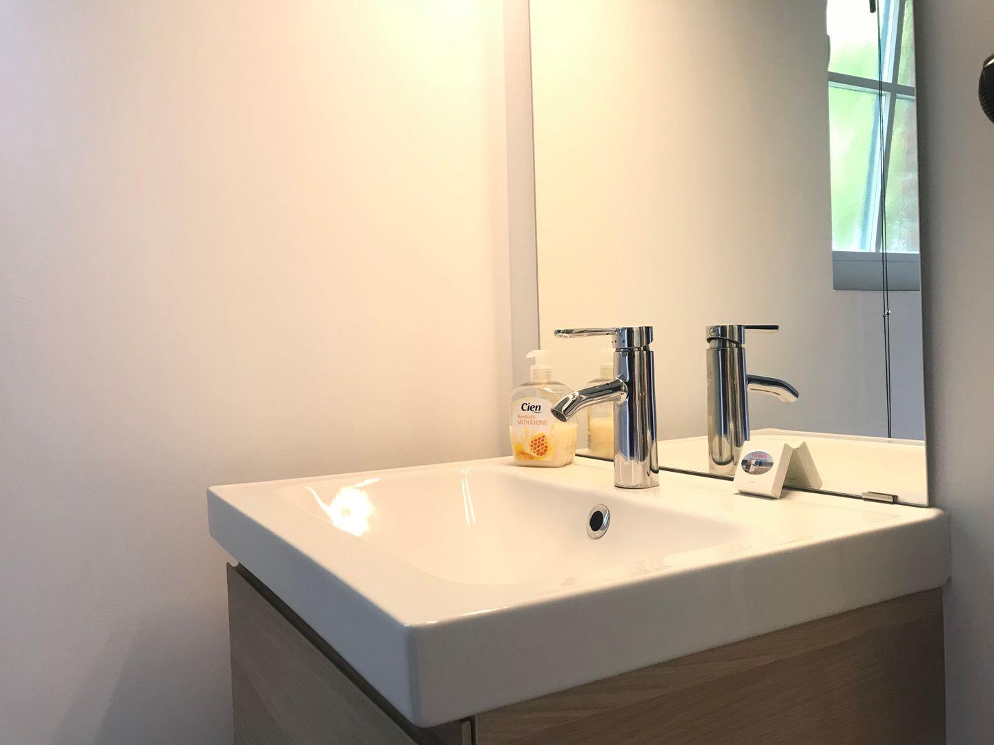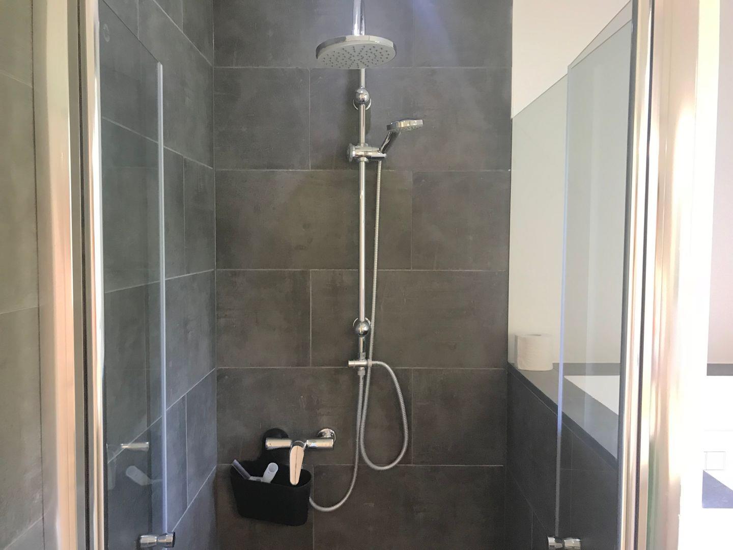 Im modernen Badezimmer befindet sich eine bodengleiche Dusche und ein Handtuchtrockner.