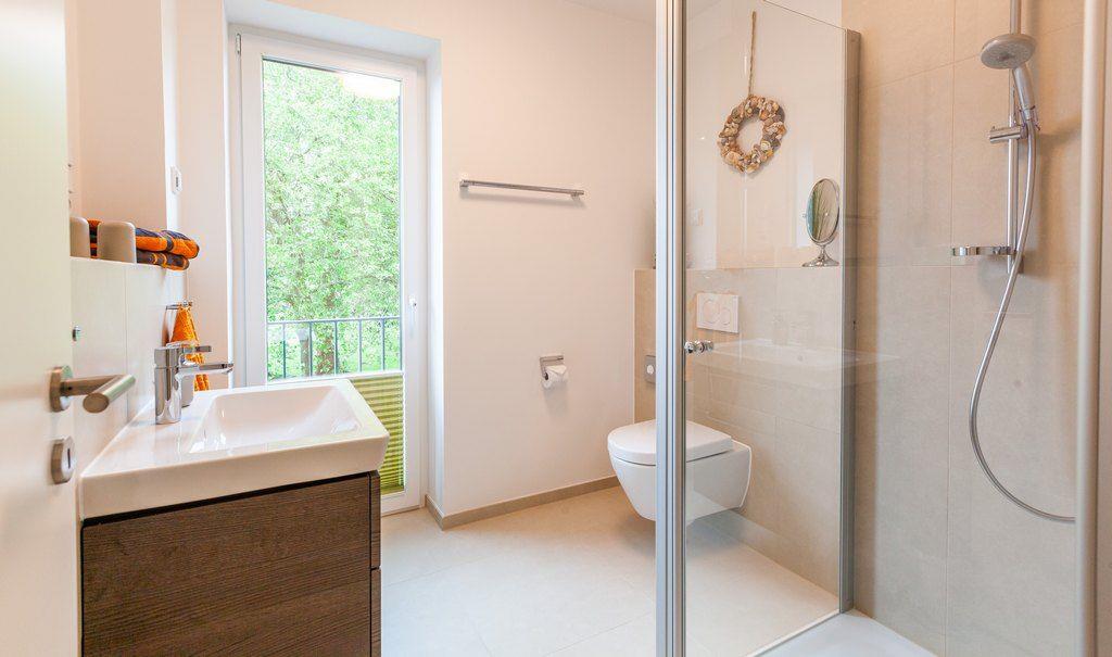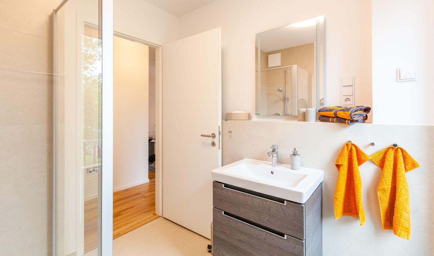Das Tageslichtbadezimmer bietet eine ebenerdige Dusche und weitere moderne Ausstattungen.