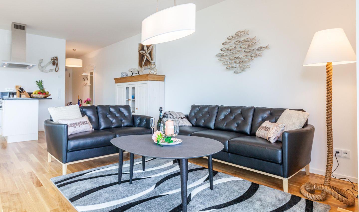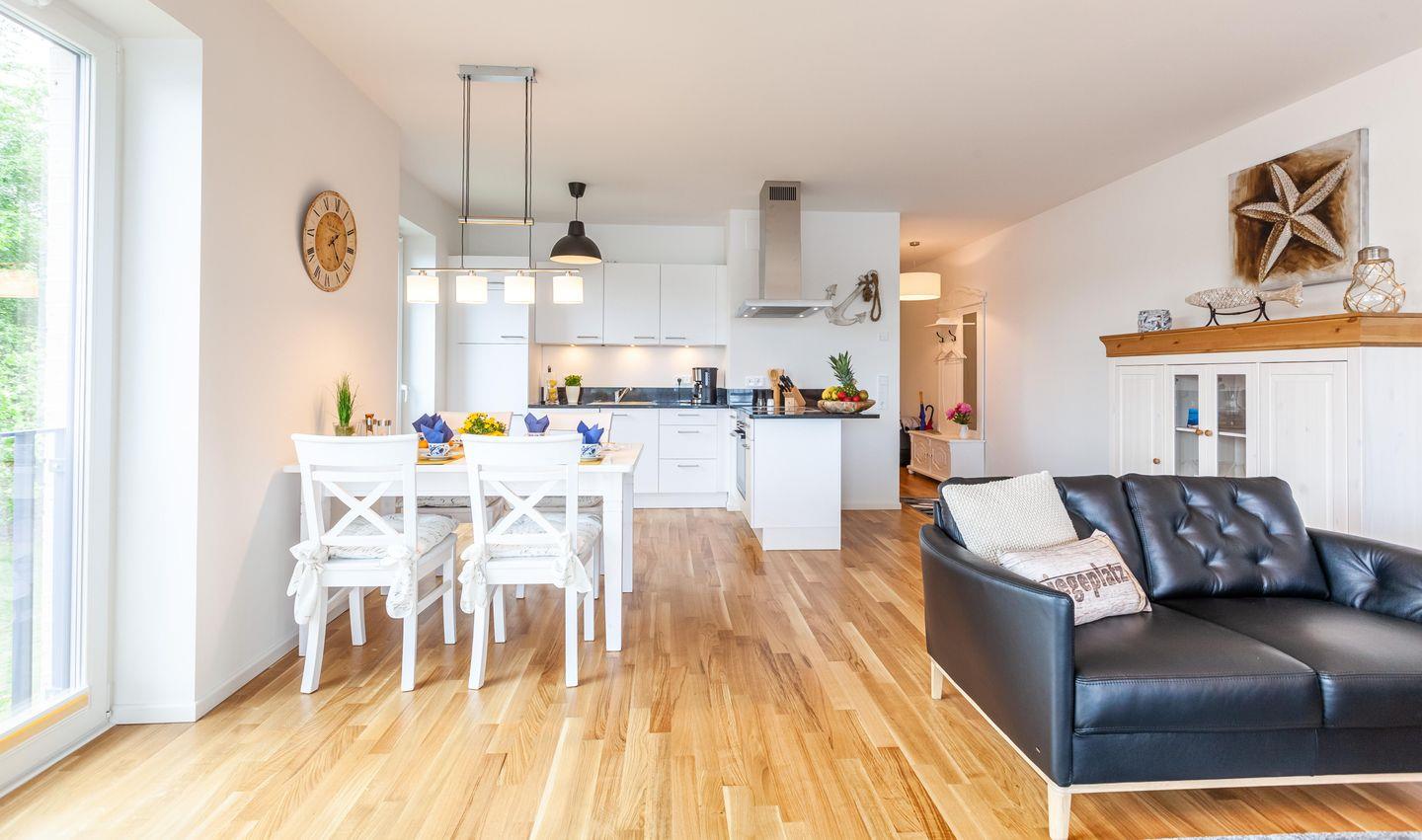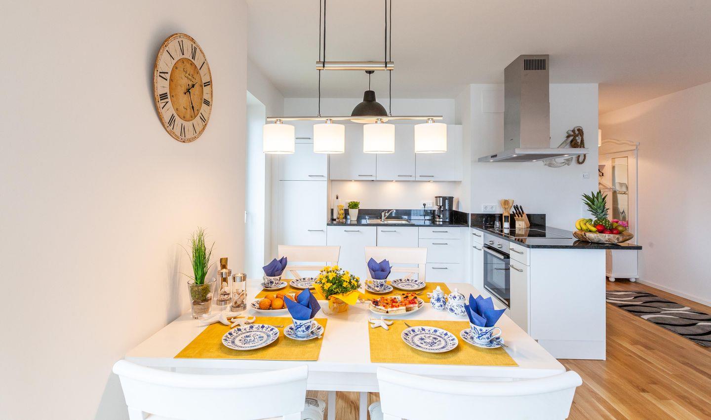 Der helle und weitläufige Wohn-/ Essbereich ist mit einer modernen Einbauküche, einem großzügigen Esstisch und weiteren bequemen Sitzmöglichkeiten ausgestattet.