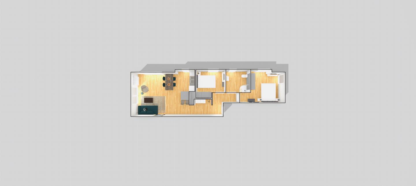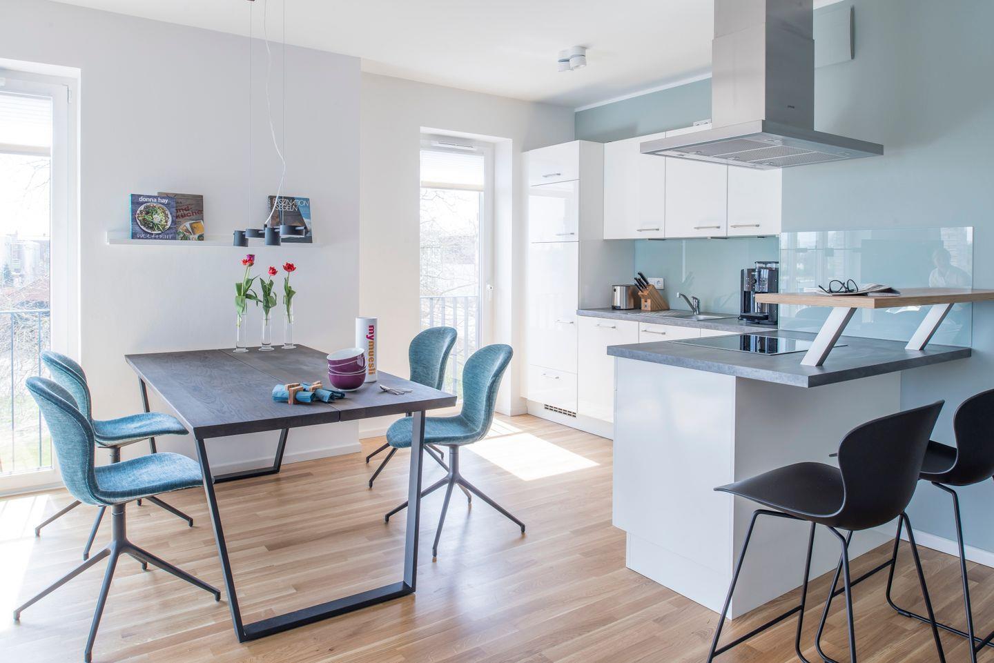 Das Appartement mit 76 qm liegt im 2. Obergeschoss des Hauses und der offene, moderne Wohn-/ Essbereich bietet Zugang zu einer Loggia (Gartenmöbel + Elektrogrill).