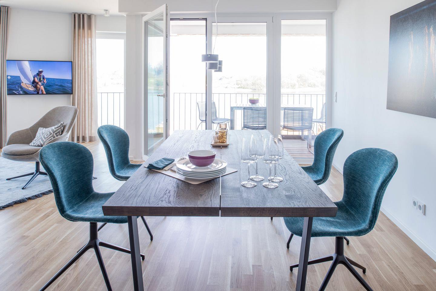 Bodentiefe Fenster und der offene Wohn-/ Essbereich mit angeschlossener Loggia (Gartenmöbel + Elektrogrill), erlauben einen Panoramablick über die Schlei.