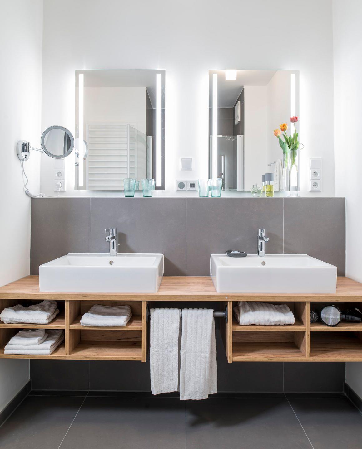 Das Badezimmer ist mit einem Doppelwaschtisch und einer ebenerdigen Dusche ausgestattet.