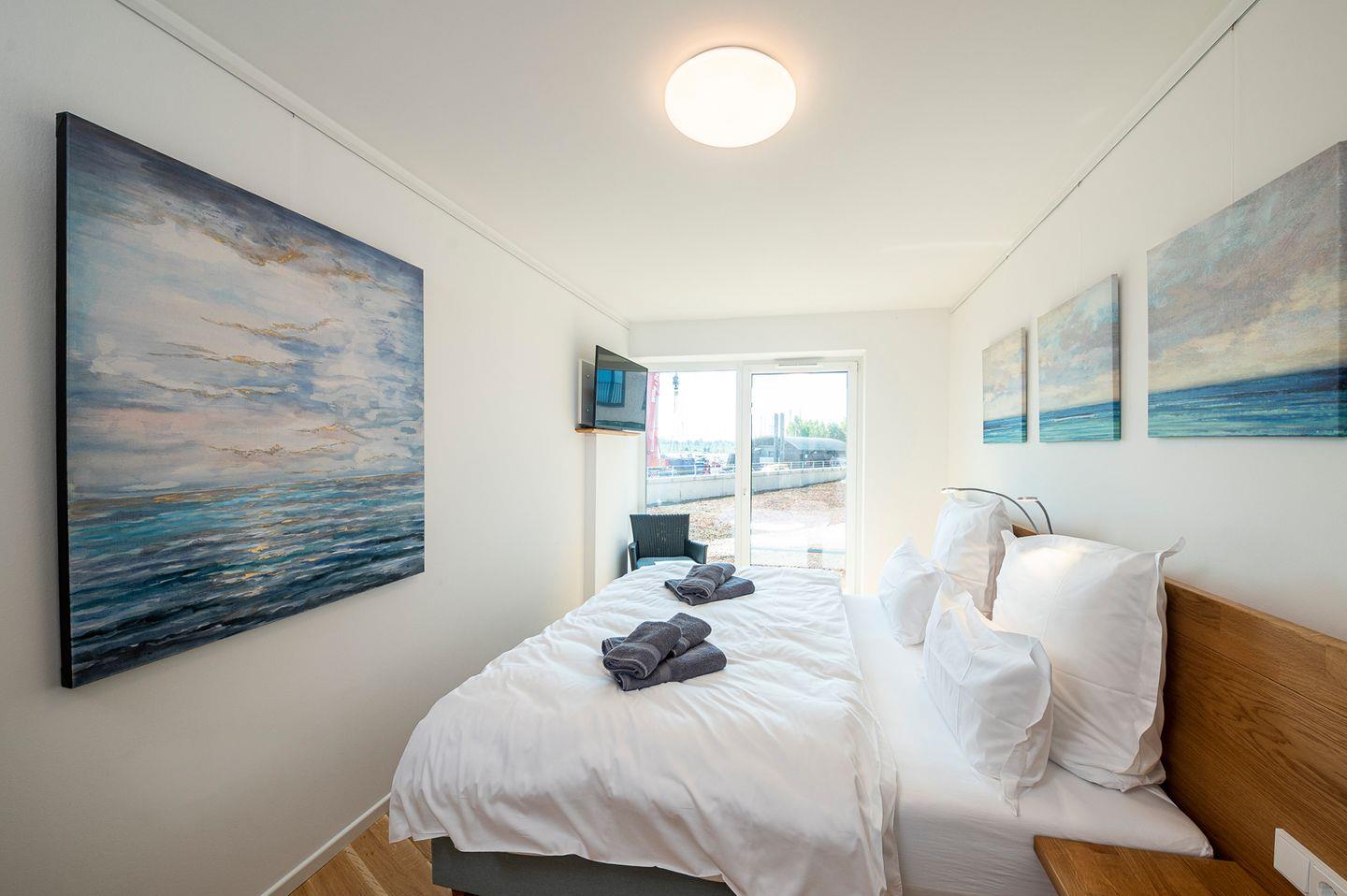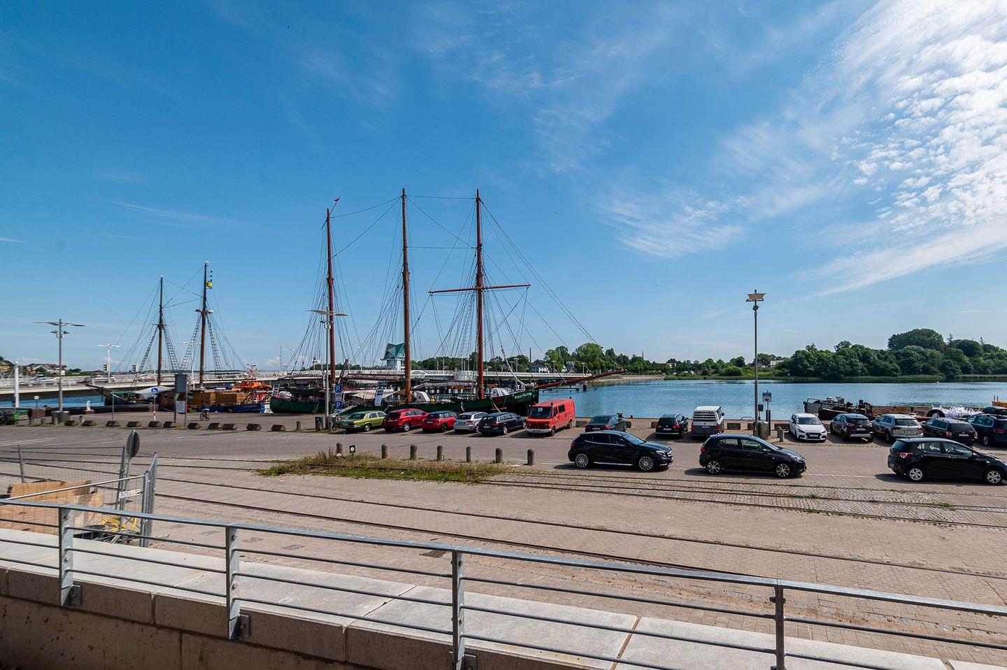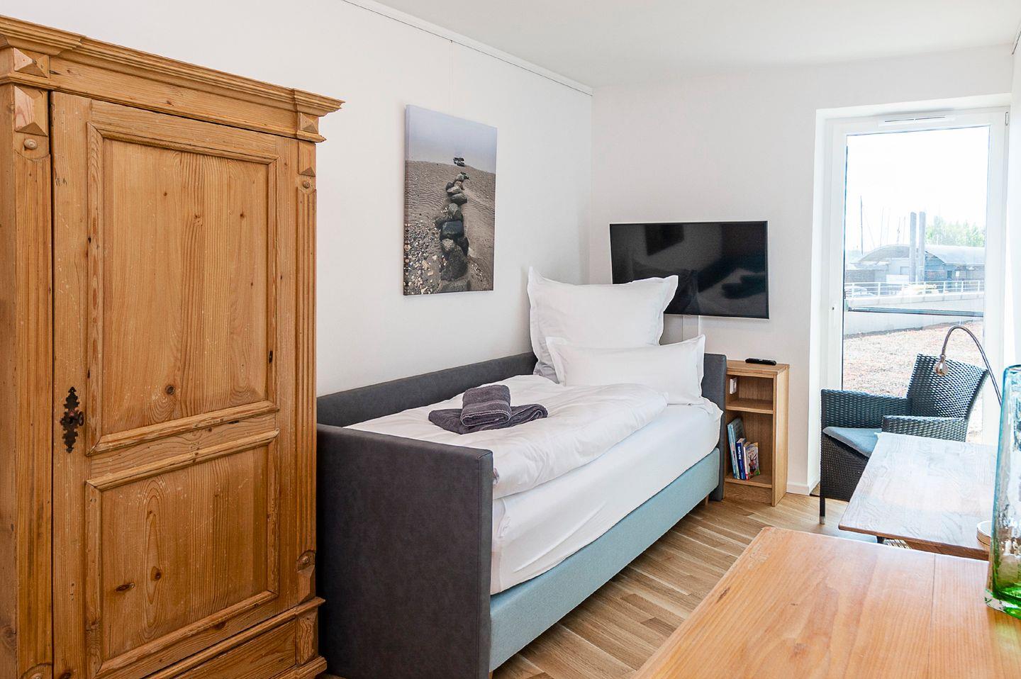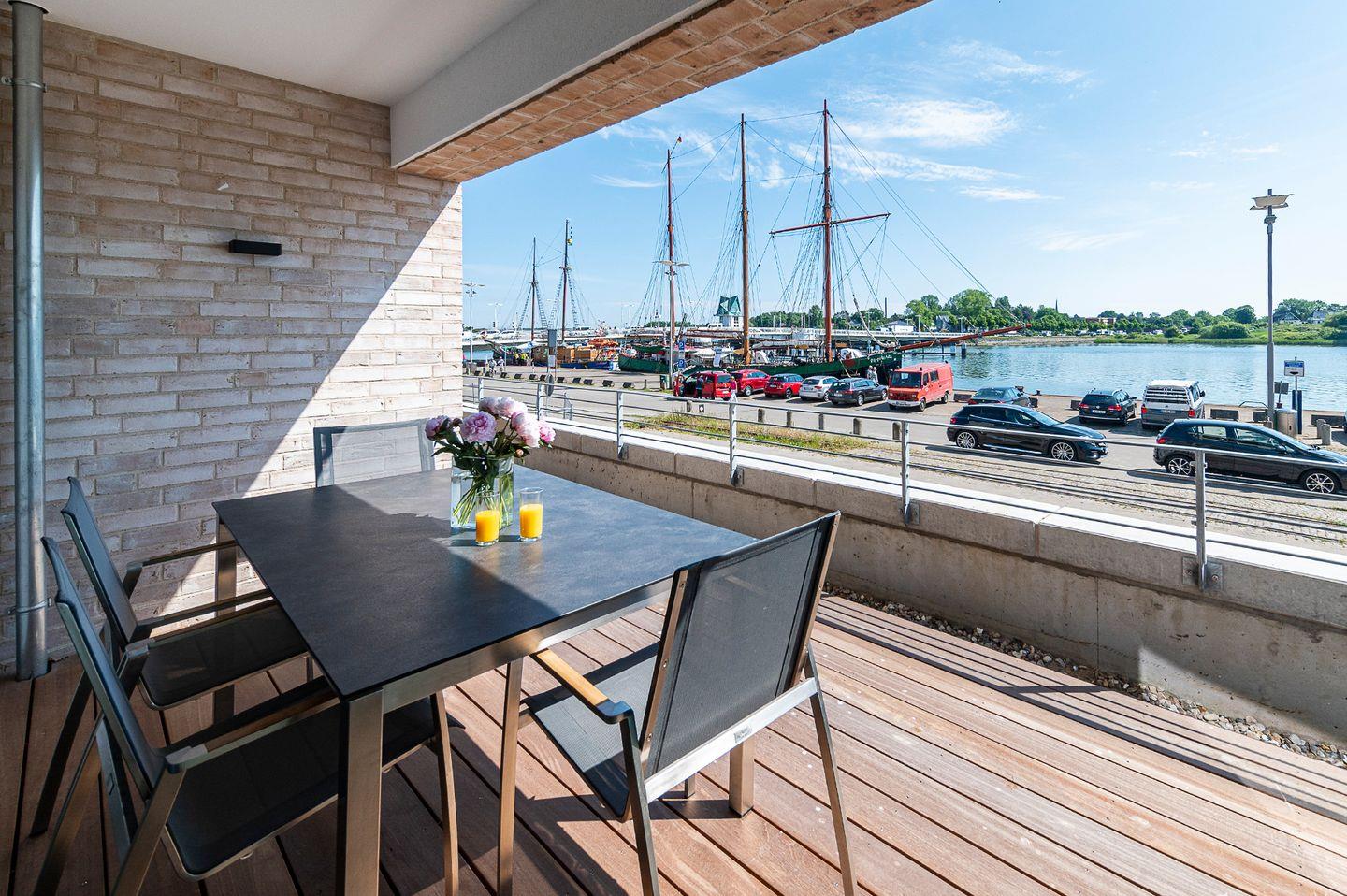 Das Appartement „Reling“ liegt in erster Reihe zur Schlei im Erdgeschoss des Speicherquartiers in Kappeln.