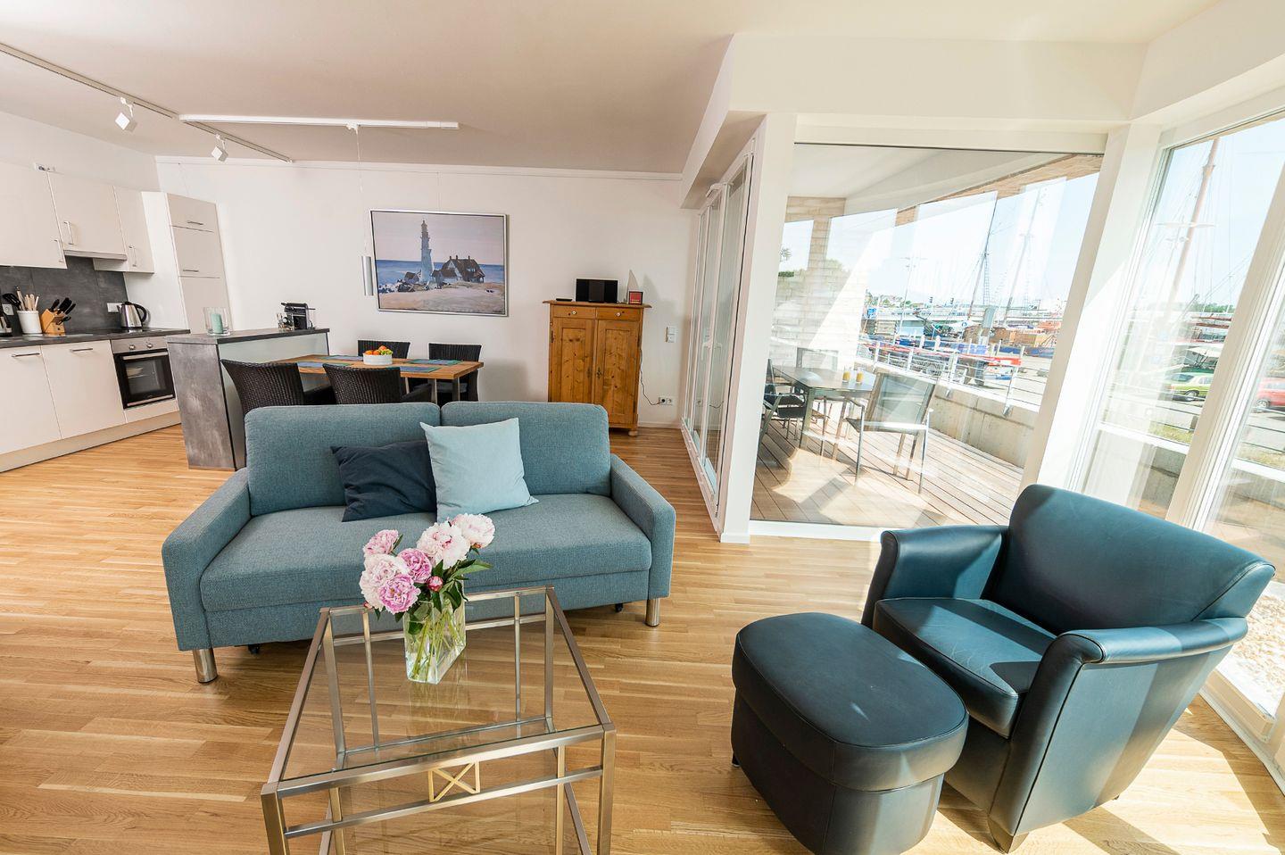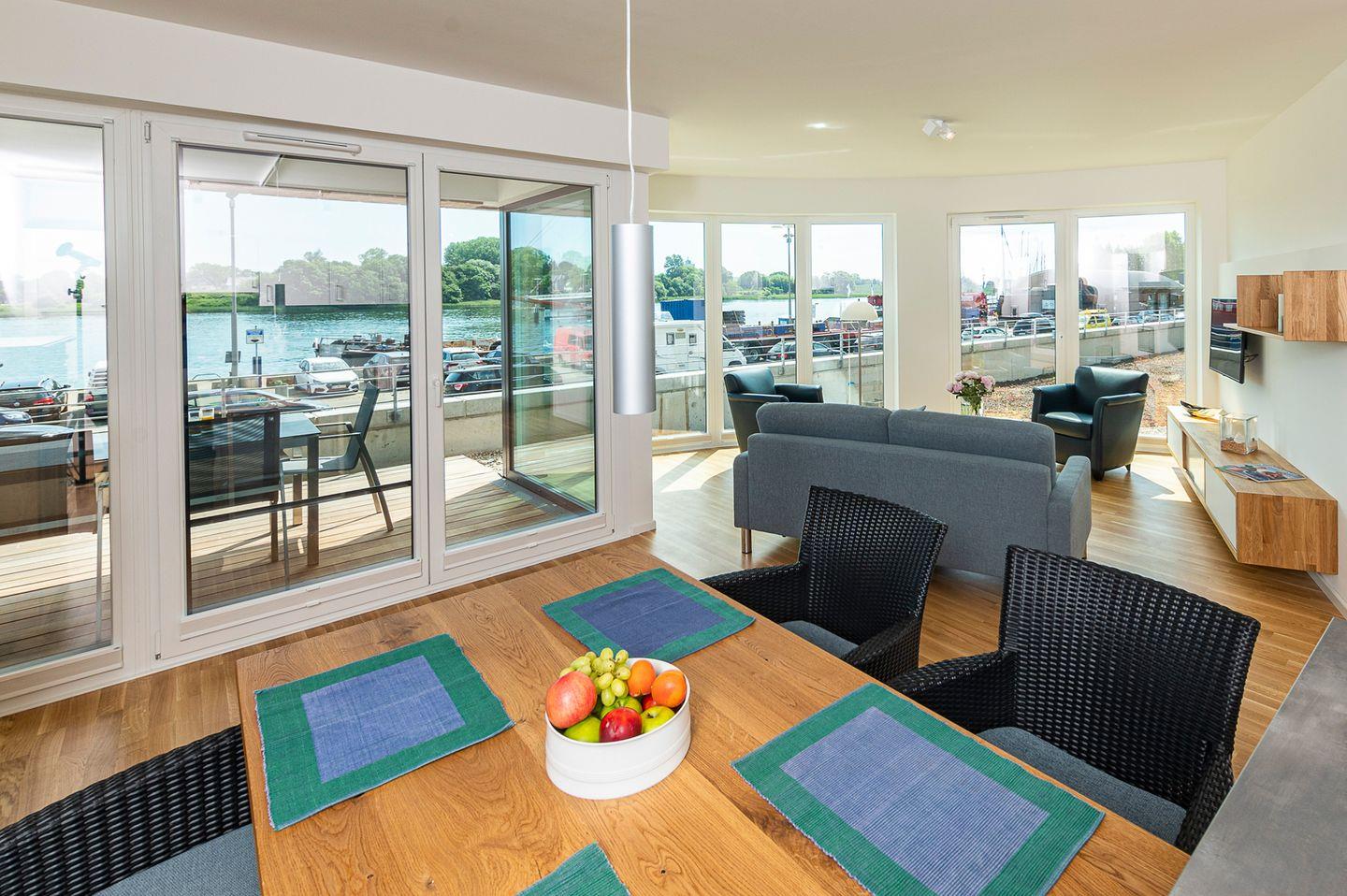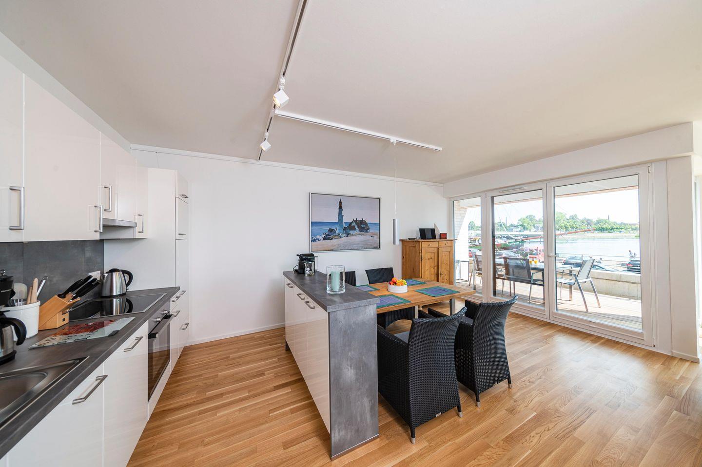 Der helle Wohn-/ Essbereich mit direktem Blick auf die Schlei ist ausgestattet mit einer hochwertigen Einbauküche, sowie einem Esstisch und bequemen Sitzmöglichkeiten für entspannte Stunden. Von hier aus gelangen Sie auf die möblierte Terrasse, auf der Sie die Sonne im Freien genießen können.