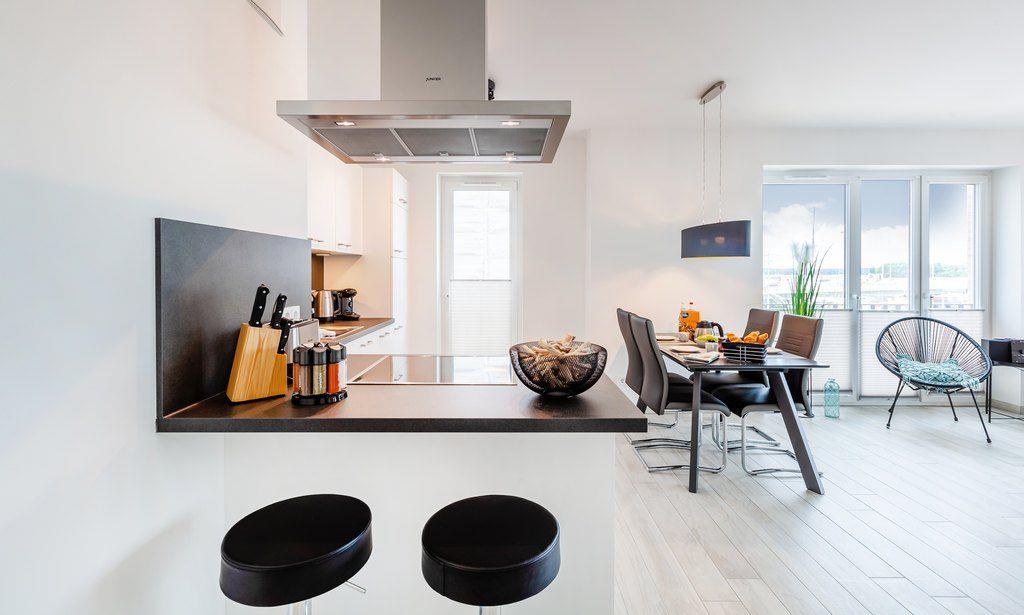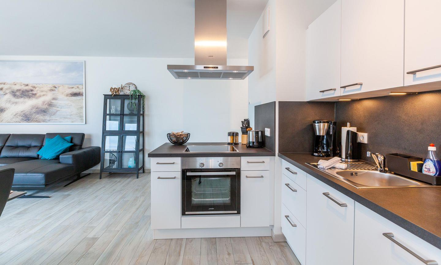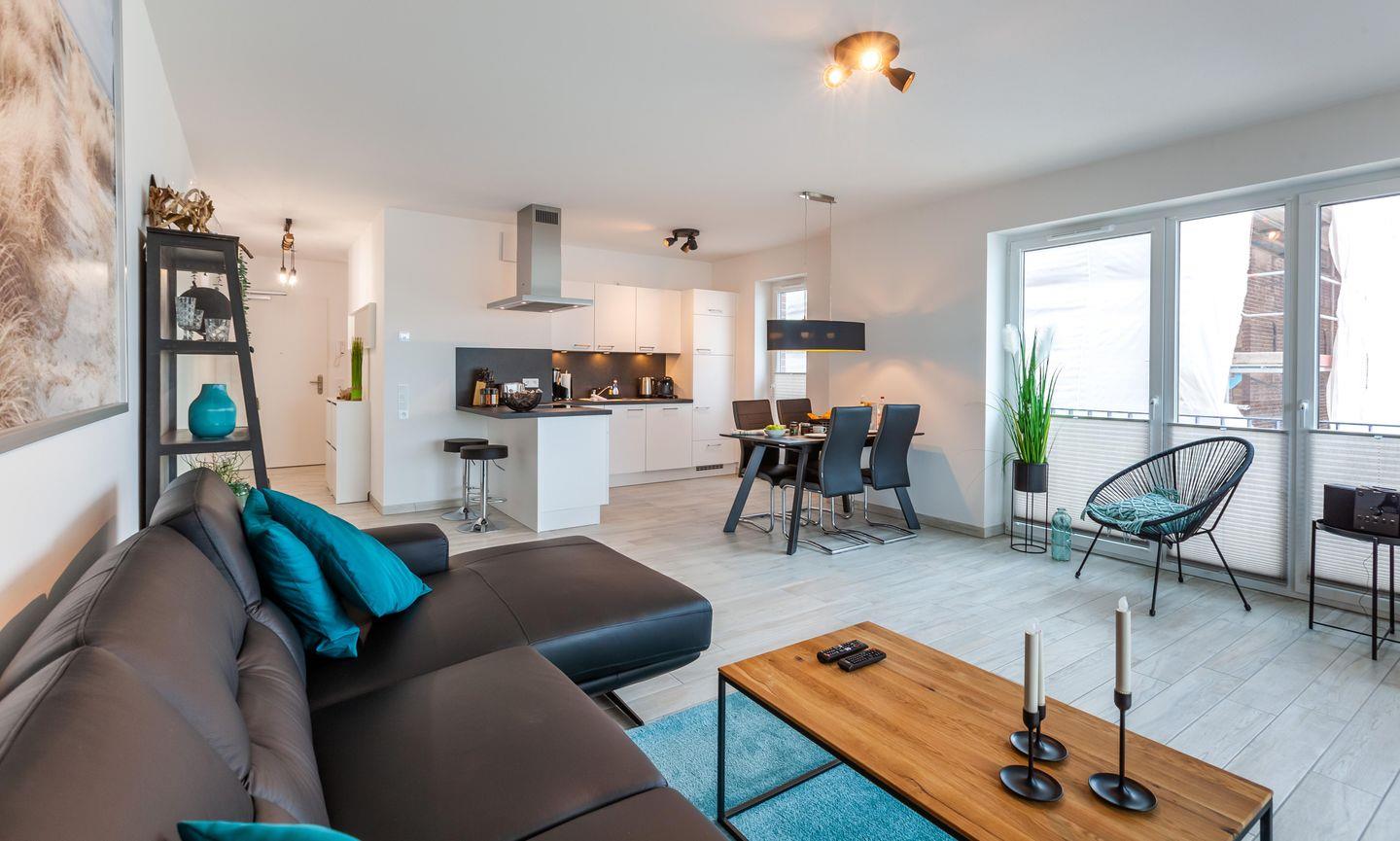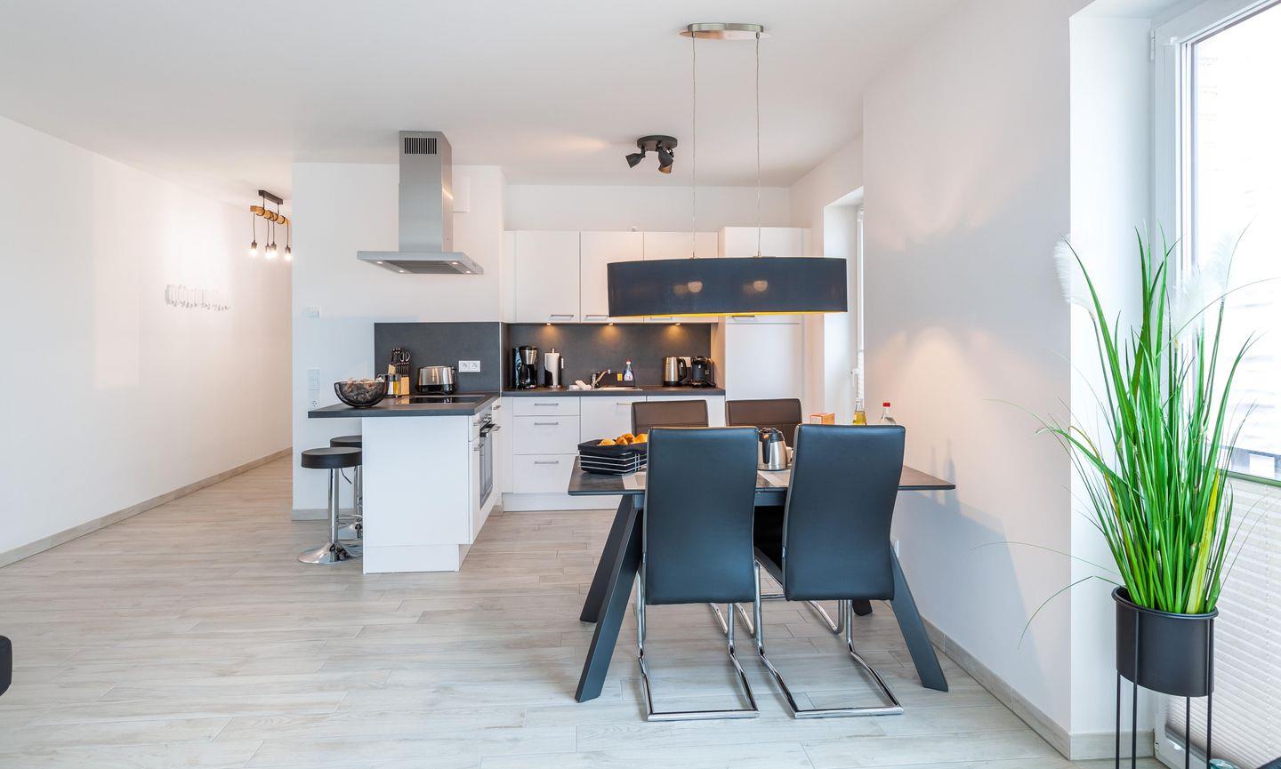 Der offene, helle Wohn-/ Essbereich bietet eine moderne Einbauküche und Zugang zu einem eigenen Balkon.