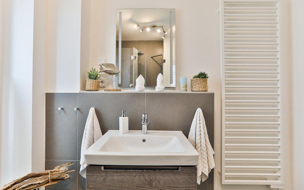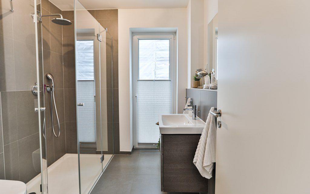 Das freundliche Tageslichtbadezimmer ist mit einer ebenerdigen Dusche ausgestattet.