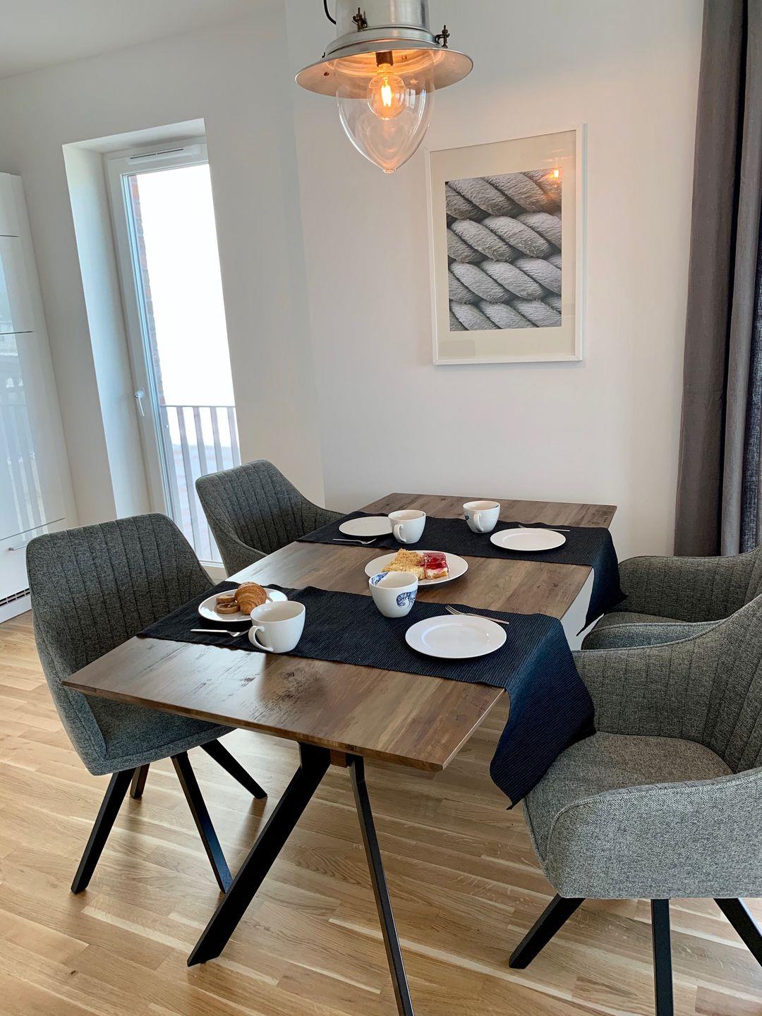 Der offene Wohn-/ Essbereich verfügt über eine moderne Einbauküche, einen Esstisch und gemütliche Sofamöbel zum Entspannen. Über den Wohn-/ Essbereich gelangt man ebenfalls auf den Balkon, welcher mit einem Elektrogrill bestückt ist.