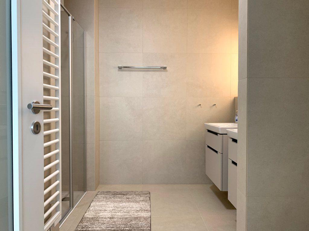 Das zeitgemäße Badezimmer ist mit einer ebenerdigen Dusche ausgestattet.