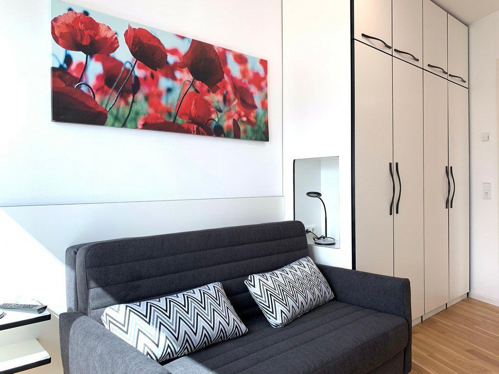 In der Wohnung sind zwei Schlafzimmer vorhanden: Ein Schlafzimmer ist mit einem Doppelbett der Maße 2x 80x200 cm ausgestattet und das andere mit einem Schlafsofa der Maße 160x200 cm. Beide Schlafzimmer verfügen über elektrische Verdunklungsmöglichkeit, Kleiderschränke und Fernsehgeräte.