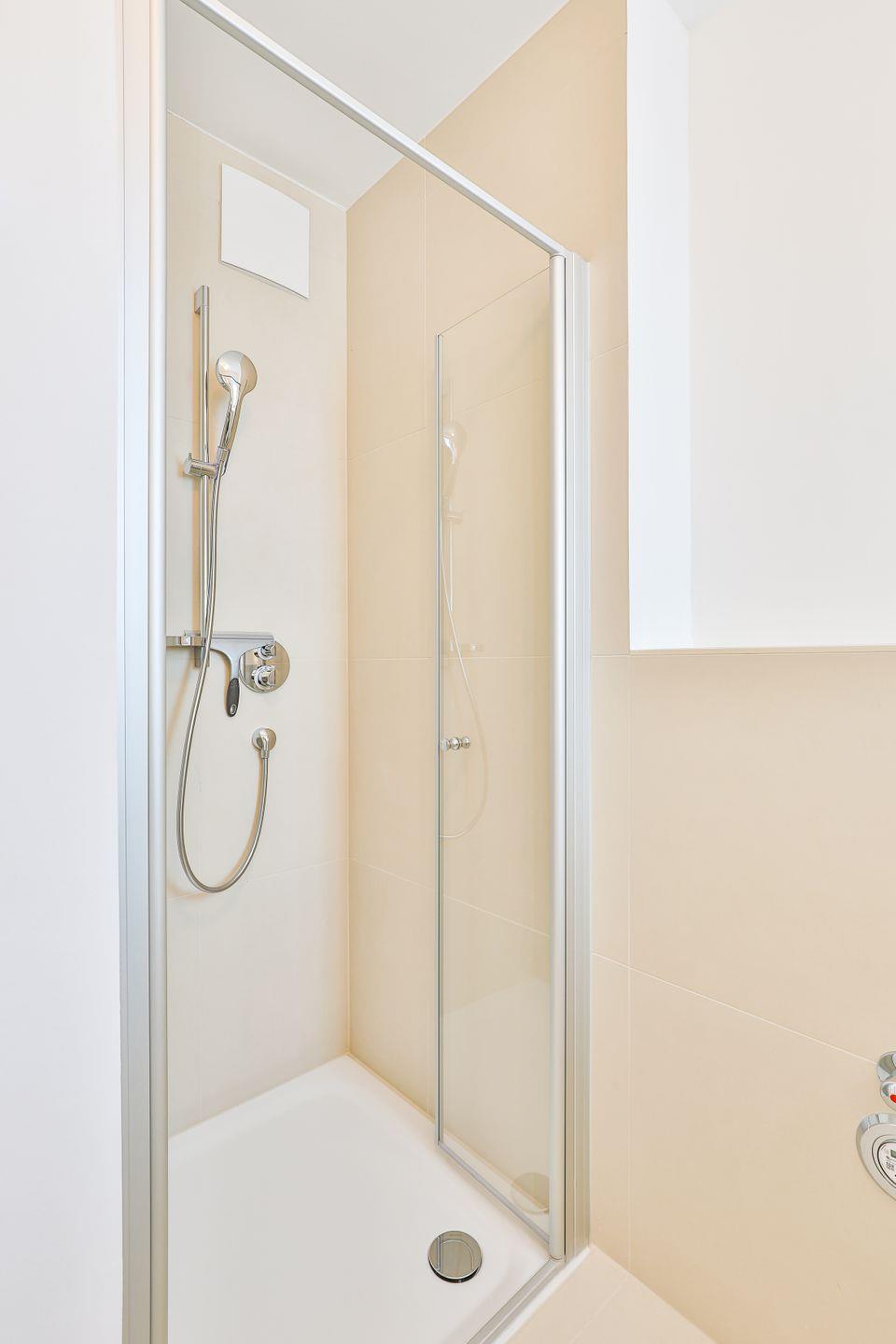 Das Tageslicht-Badezimmer bietet eine ebenerdige Dusche und weitere moderne Ausstattungen für die tägliche Nutzung.